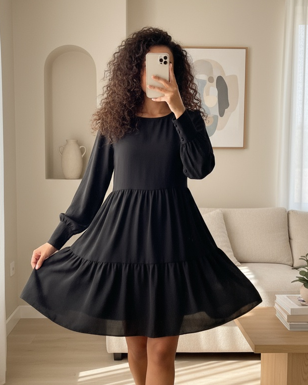 Yuvarlak Yaka Beli Lastikli Eteği Katlı Ayrobin Elbise -Siyah