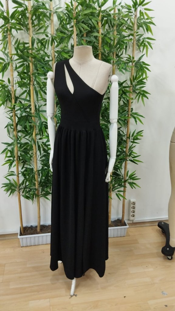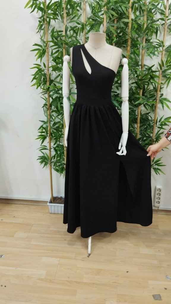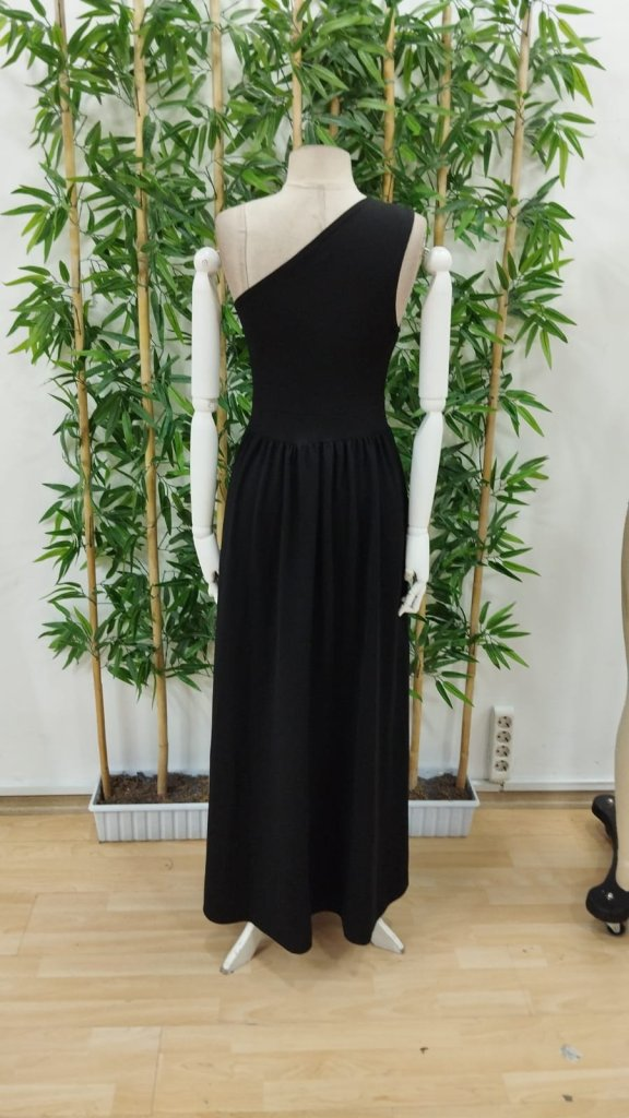 Kadın Omuzlardan Açık Asimetrik Yaka Detaylı Yırtmaçlı Maksi Boy Janjan Krep Elbise Stok Kodu: 185763