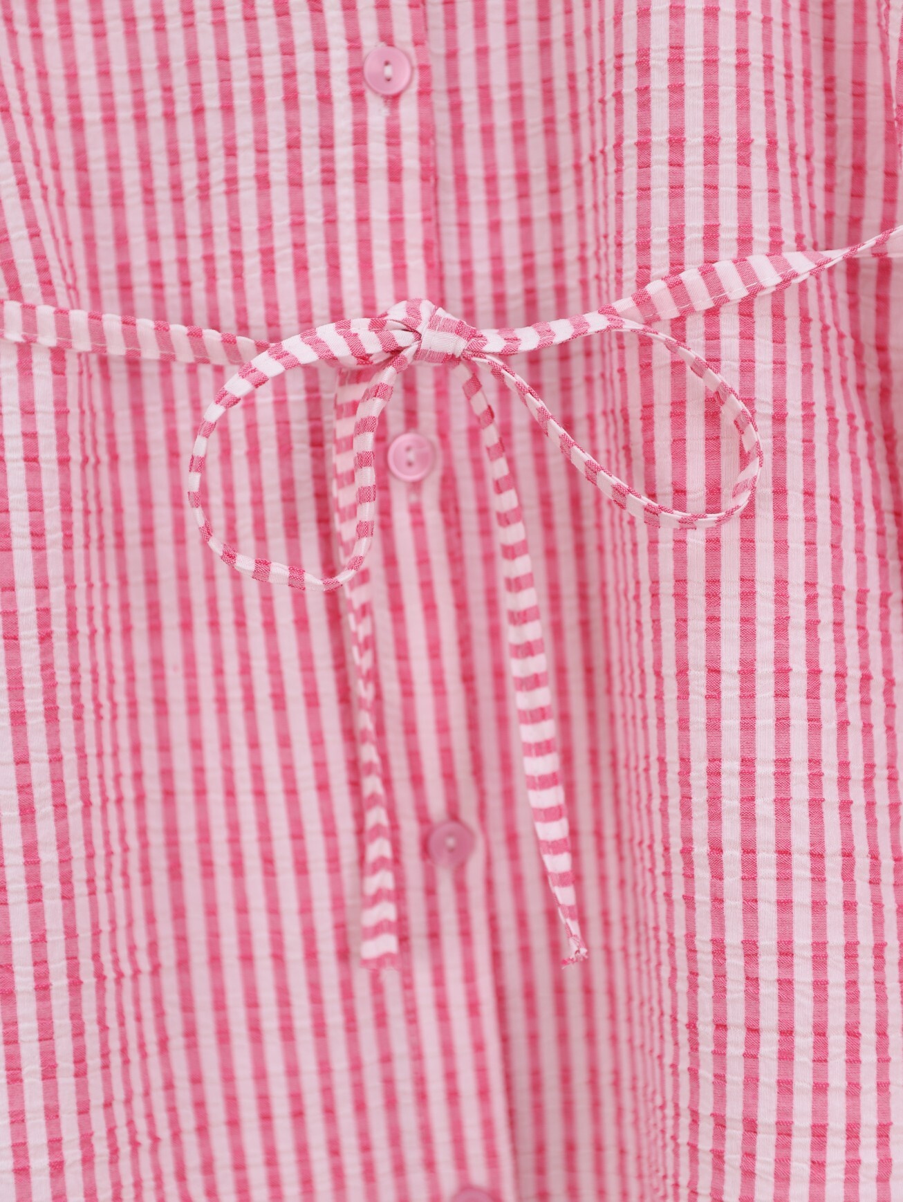 Boydan Düğmeli Bağcıklı Çizgili Bürümcük Gömlek, şıklığı ve rahatlığı bir arada sunar. Boydan düğme detayı, gömleğe zarif bir görünüm katarken, bağcıklı tasarımı vücuda oturan şık bir siluet oluşturur. Çizgili desen, modern ve dinamik bir hava katarak tarzınızı öne çıkarır. Bürümcük kumaşı ise, hem şık hem de rahat bir kullanım sunar. Hem günlük kombinlerde hem de şık stillerde rahatça tercih edilebilecek bu gömlek, zarif detaylarıyla gardırobunuzda vazgeçilmez bir parça olacak.