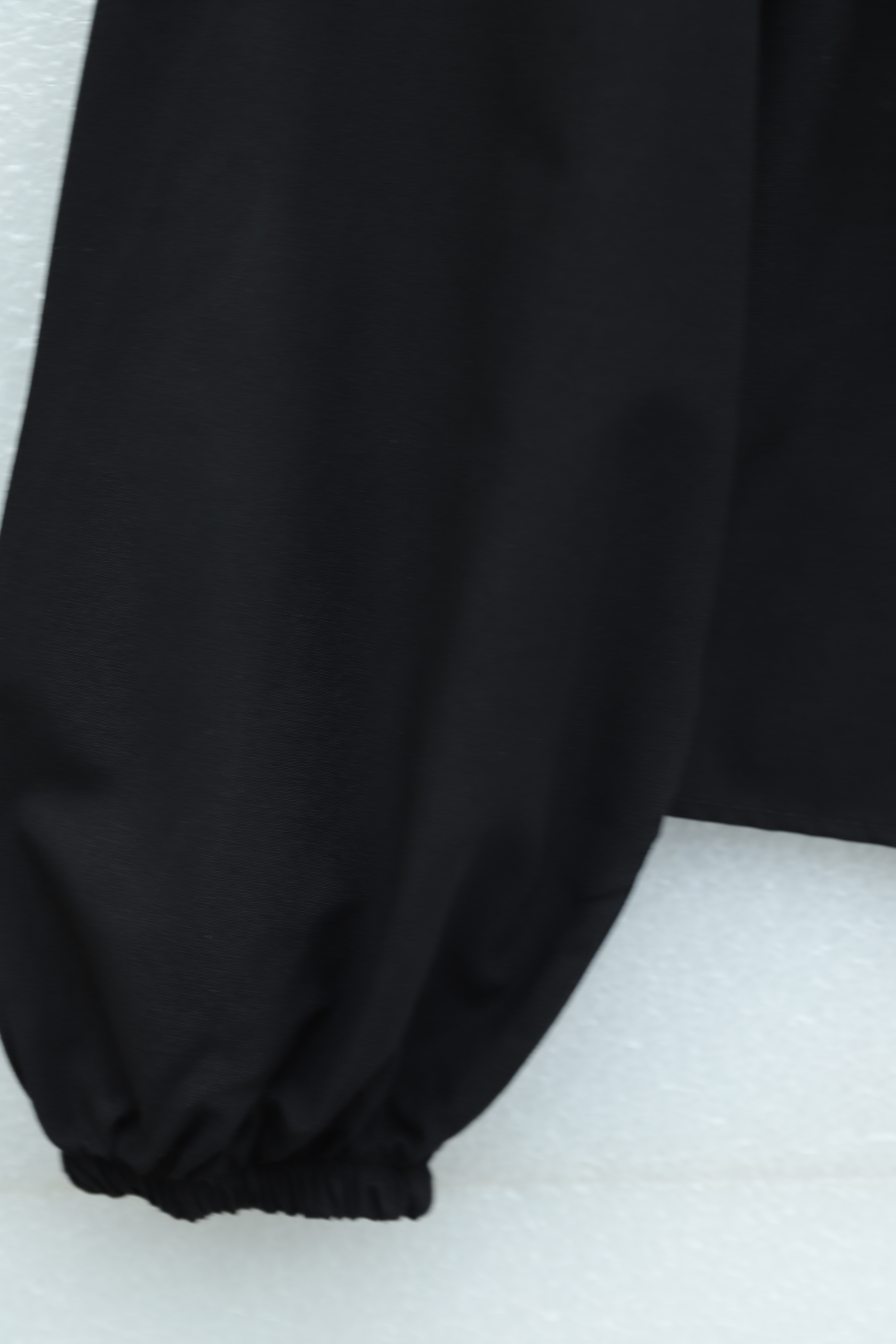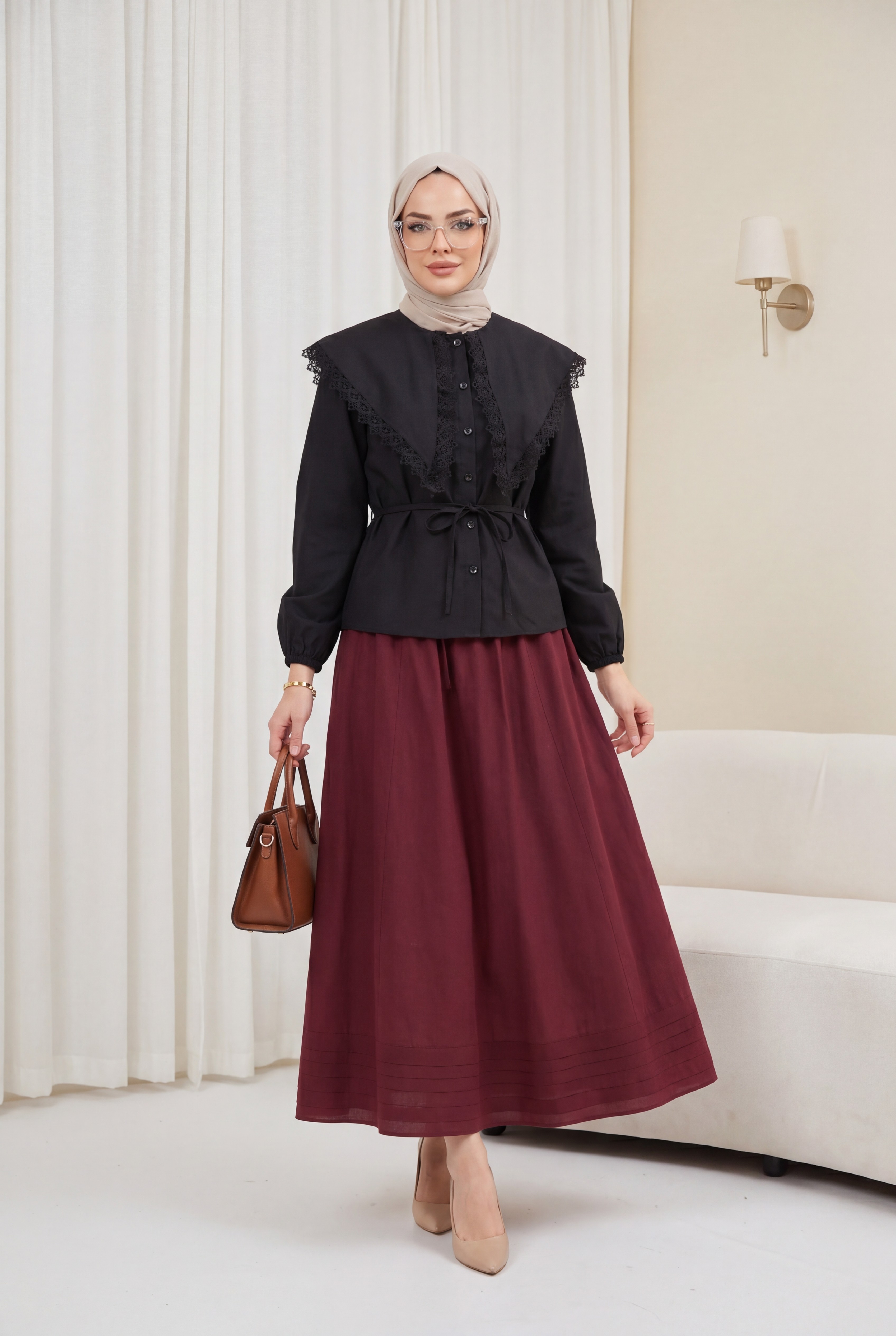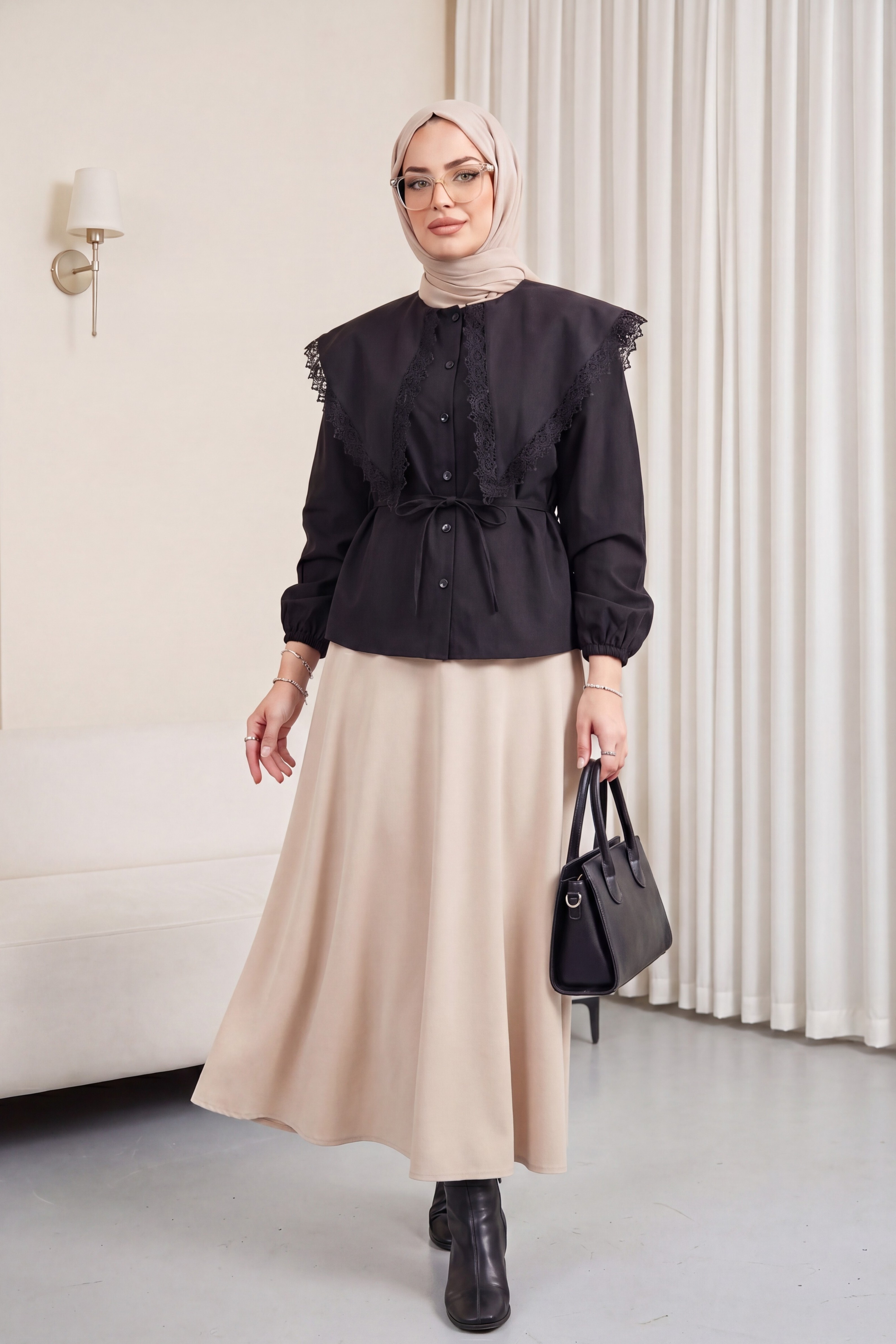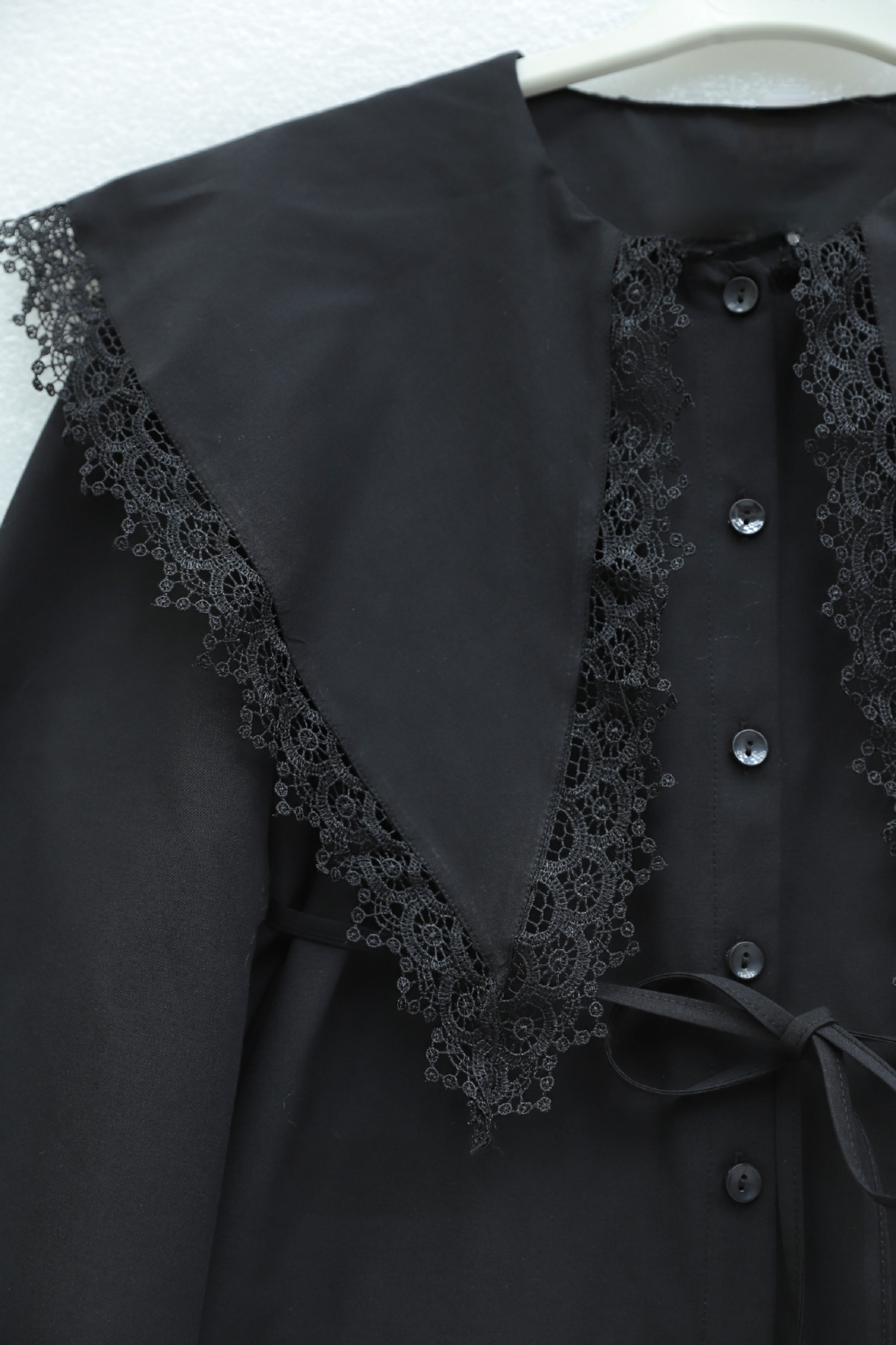 Dantelli Geniş Yakalı Bağcıklı Kolu Lastikli Poplin Gömlek -Siyah