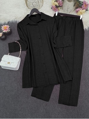 Top Düğme Gömlek Pantolonlu Takım -Siyah