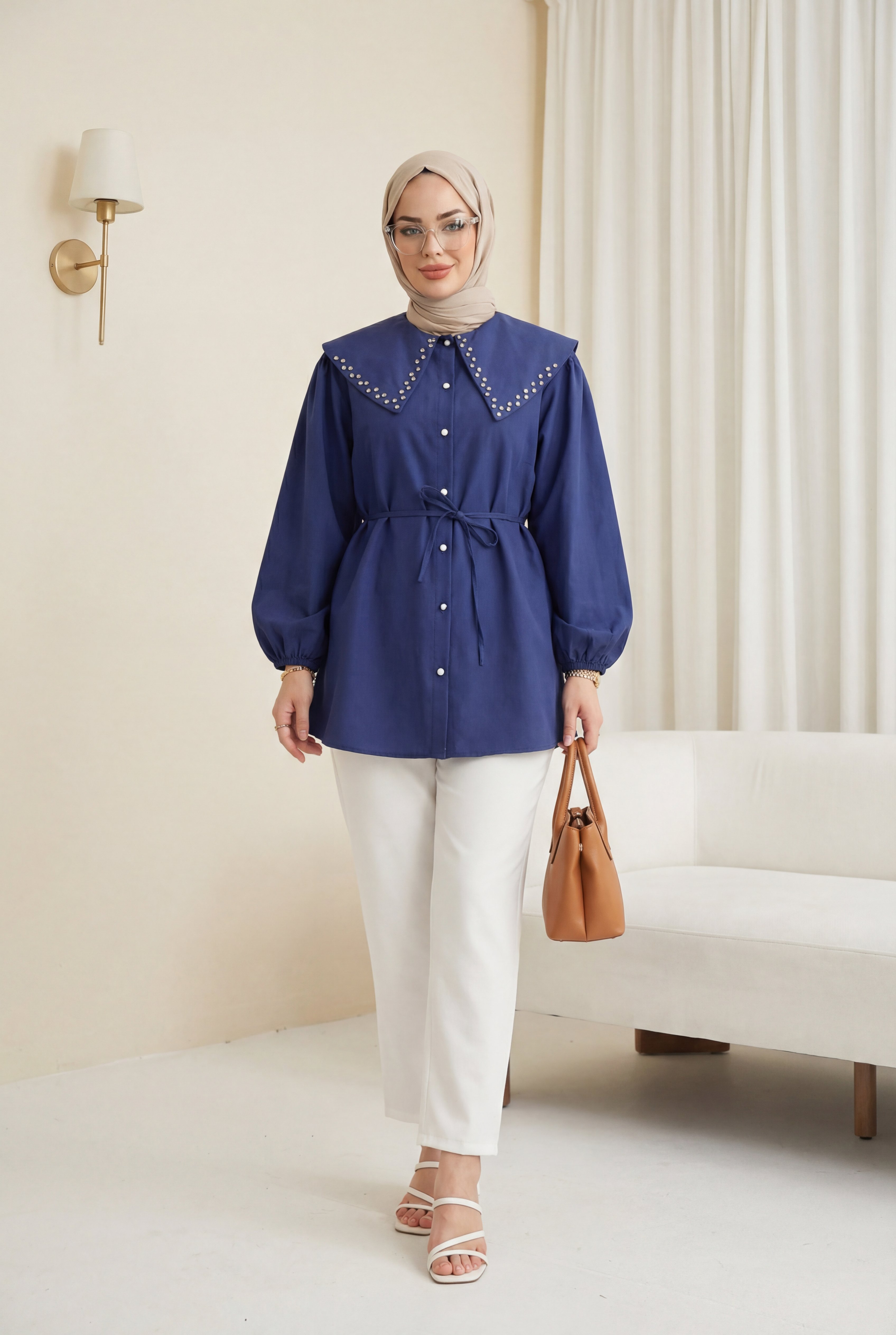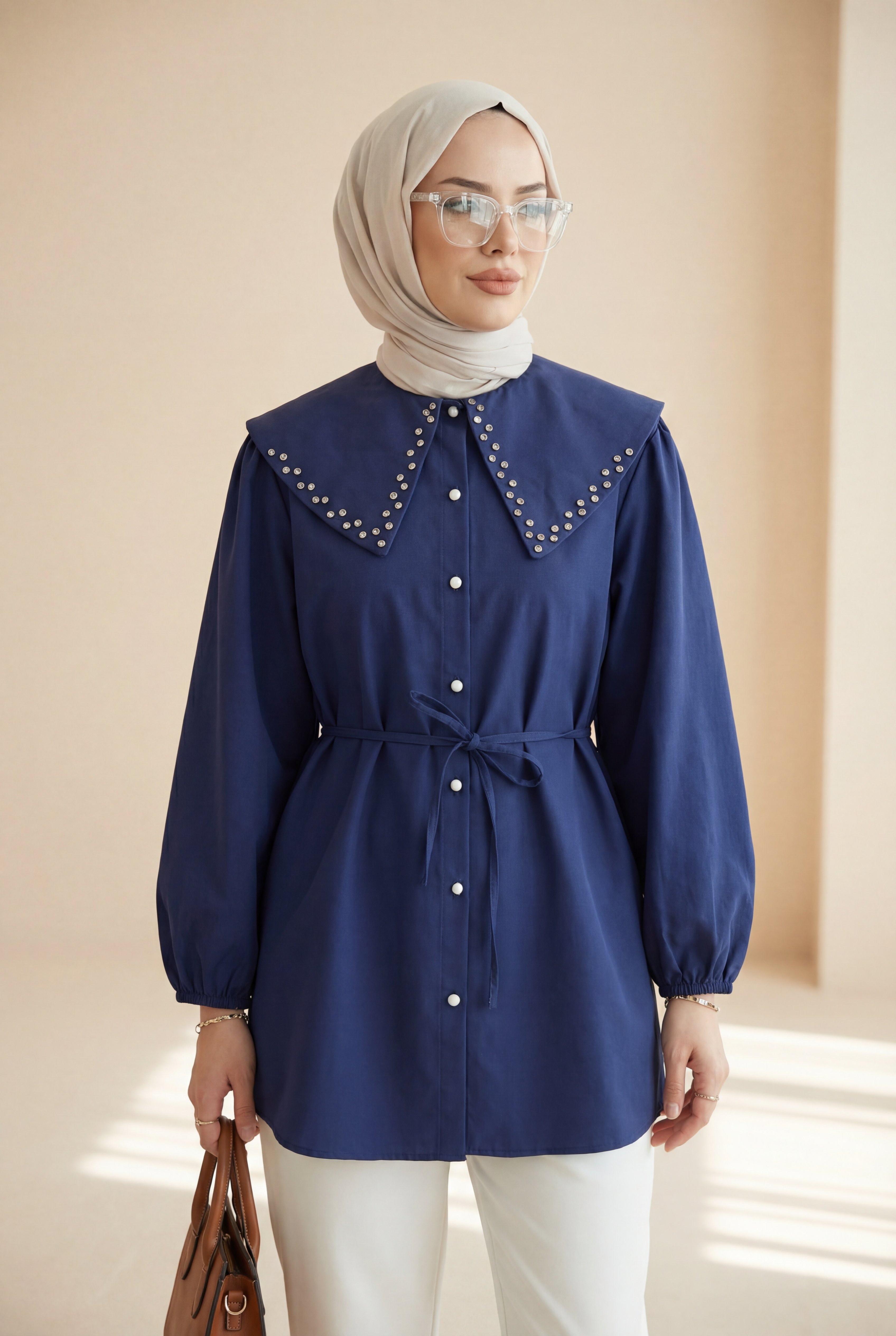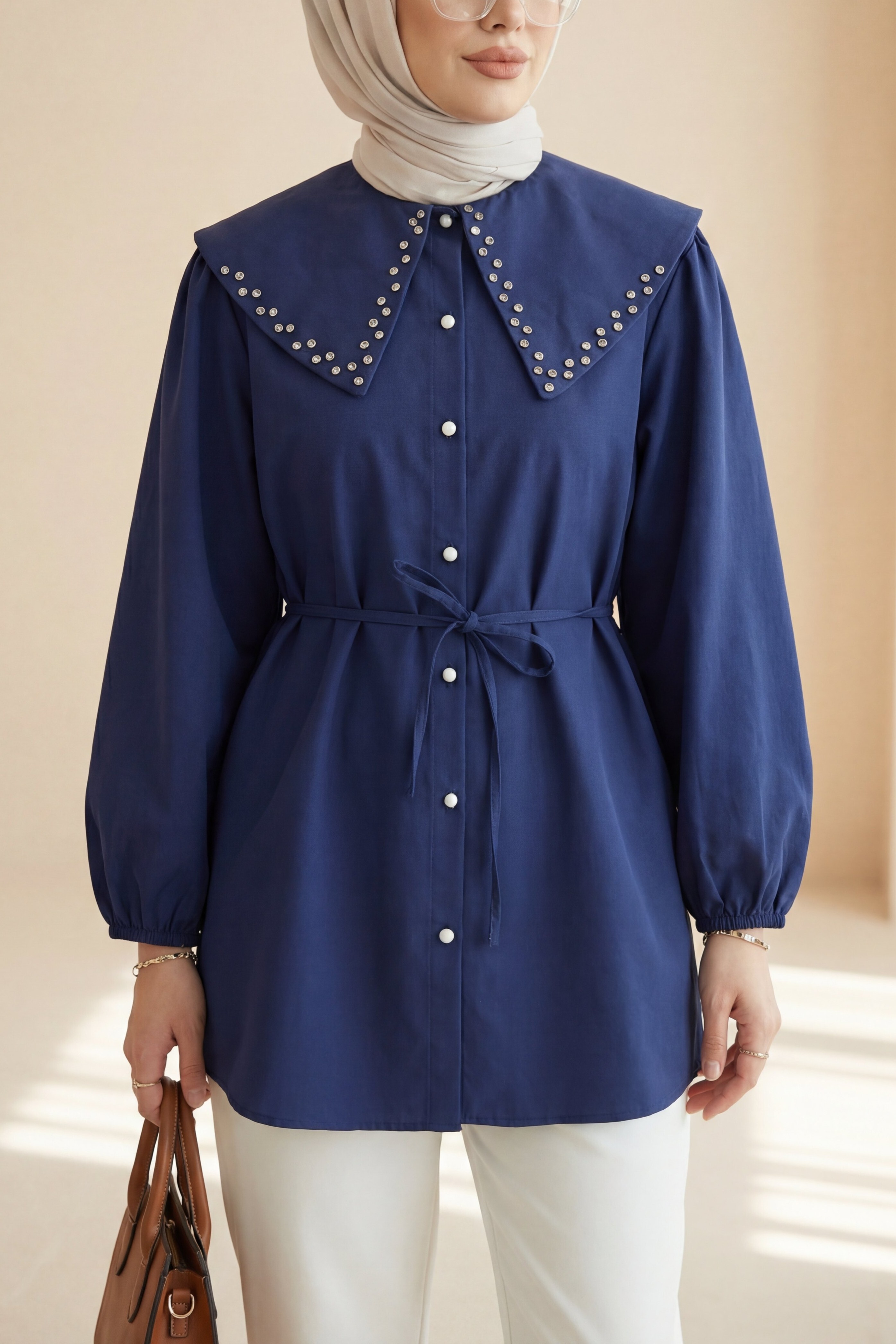 “Taş detaylı kadın gömlek”, “geniş yaka gömlek modeli”, “bağcıklı düğmeli gömlek”, “şık kadın gömlek” gibi adlandırılabilir.