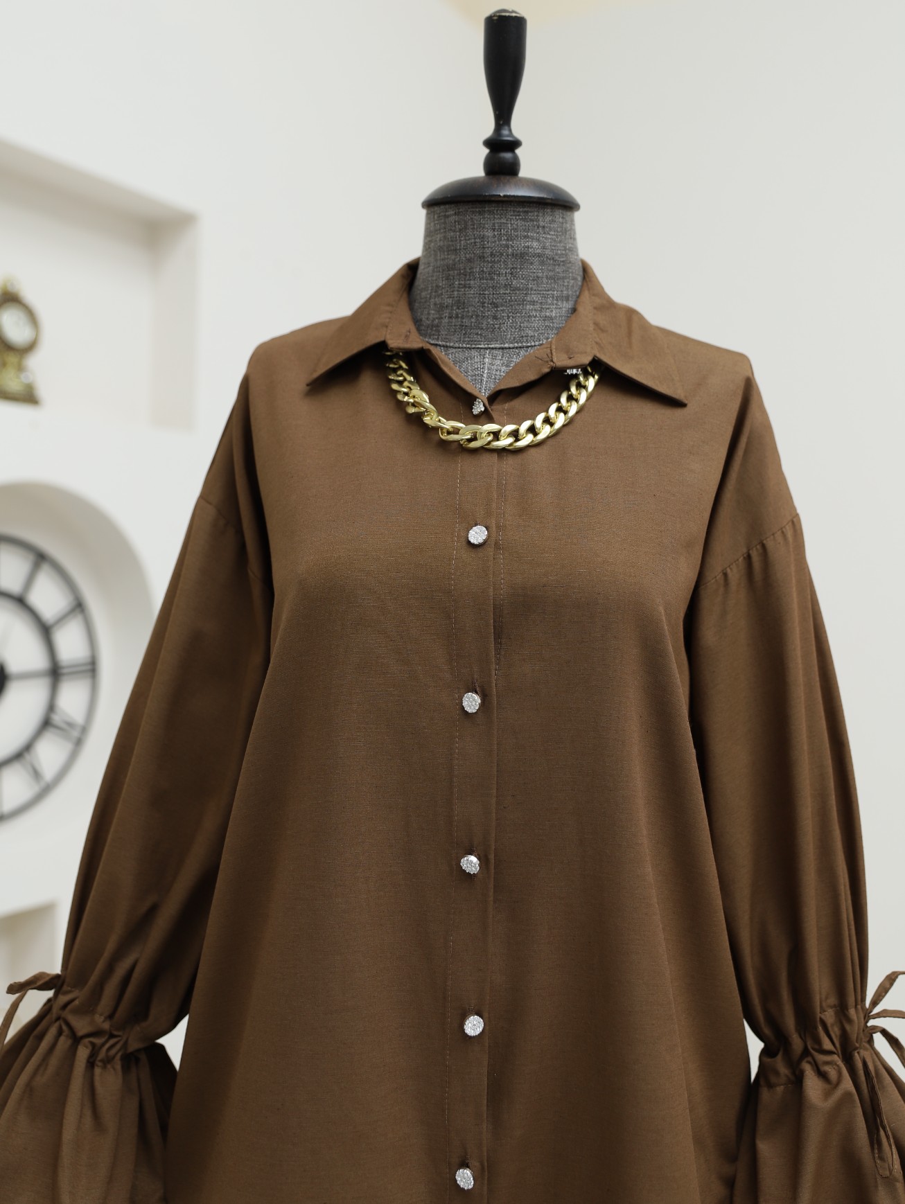 Kolu büzgülü, arkası pileli gömlek; zarif ve şık bir tasarıma sahiptir. Büzgülü kollar, feminen bir görünüm yaratırken, arkadaki pile detayları gömleğe modern ve dinamik bir hava katar. Yumuşak kumaşı sayesinde rahatlıkla giyilebilir ve vücuda mükemmel uyum sağlar. Hem günlük kombinlerde hem de şık davetlerde tercih edilebilecek bu gömlek, zarif ve modern bir stil için mükemmel bir tercihtir.
