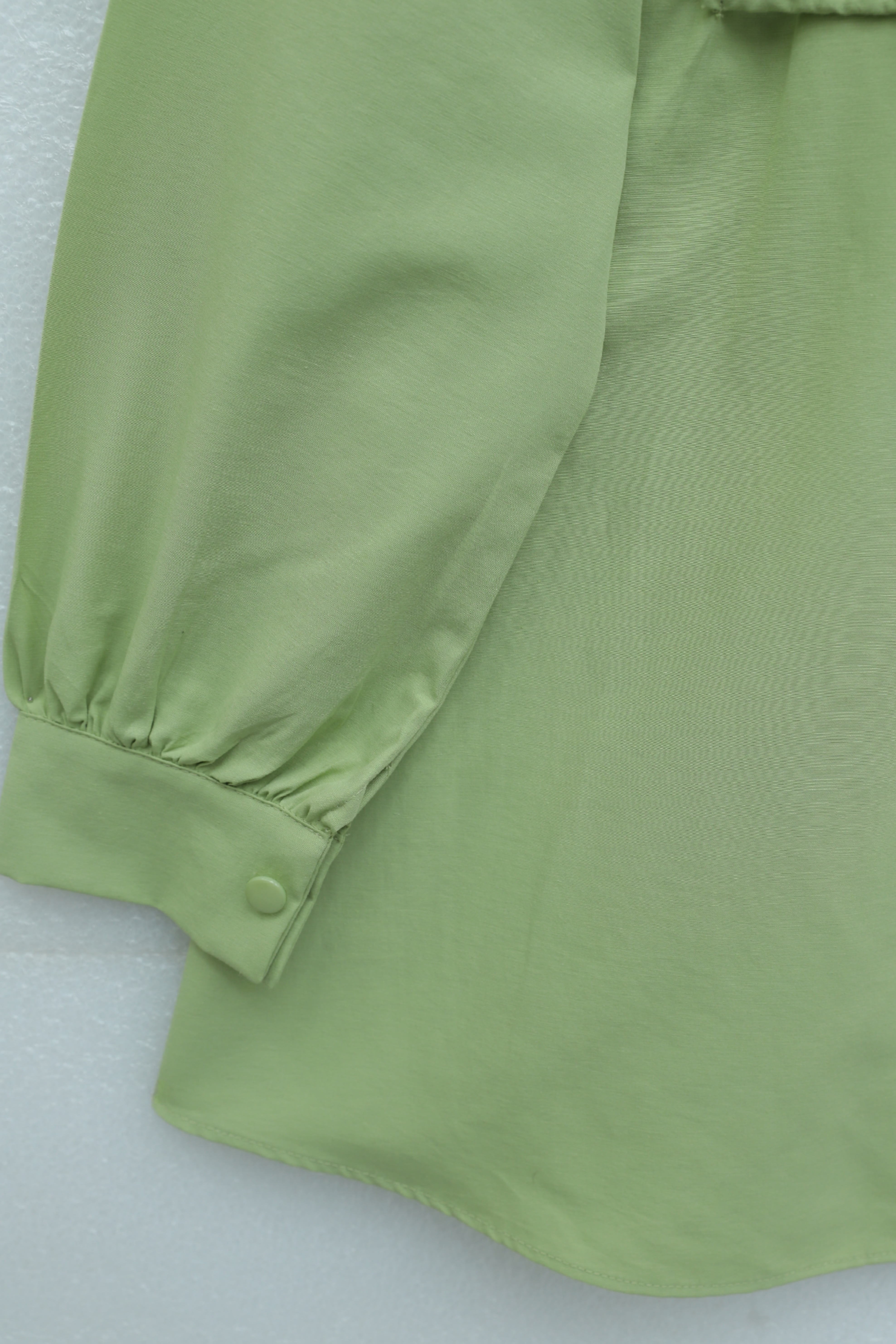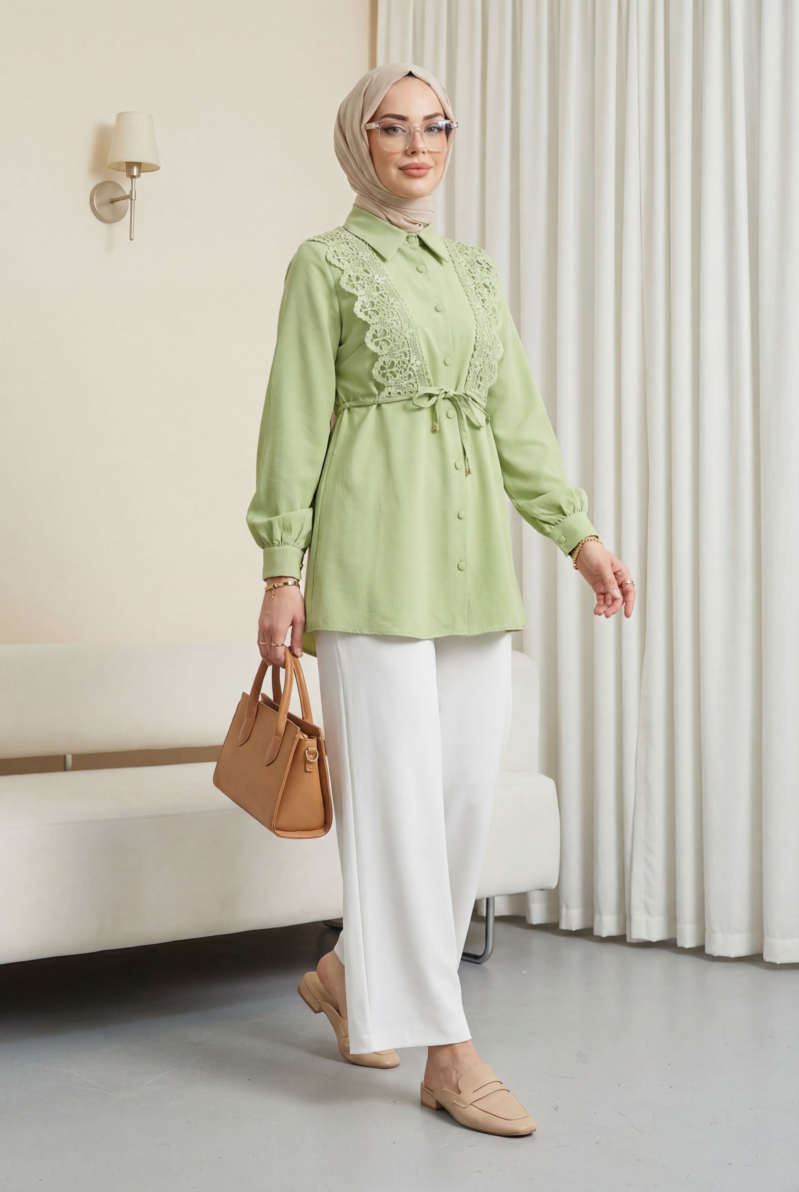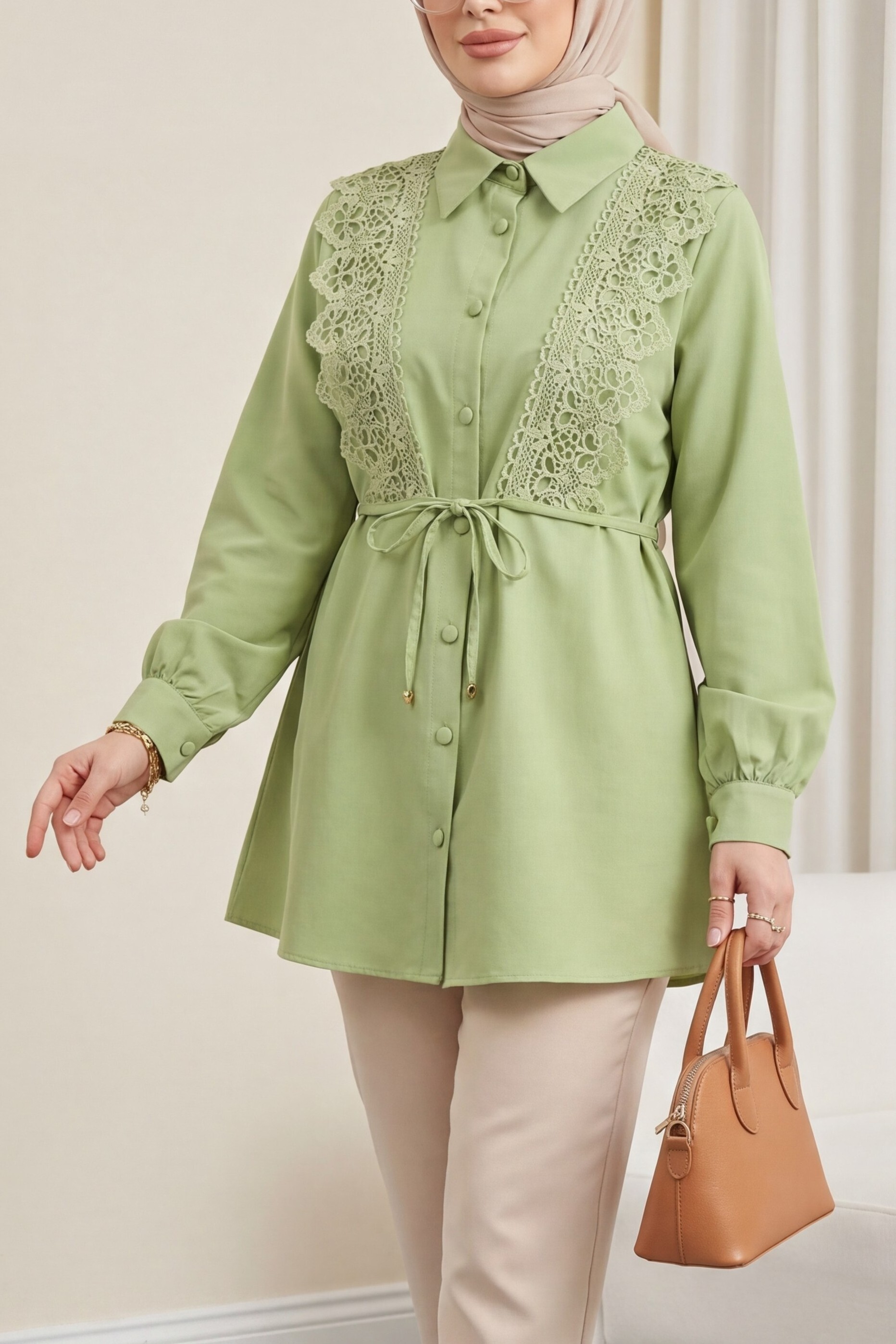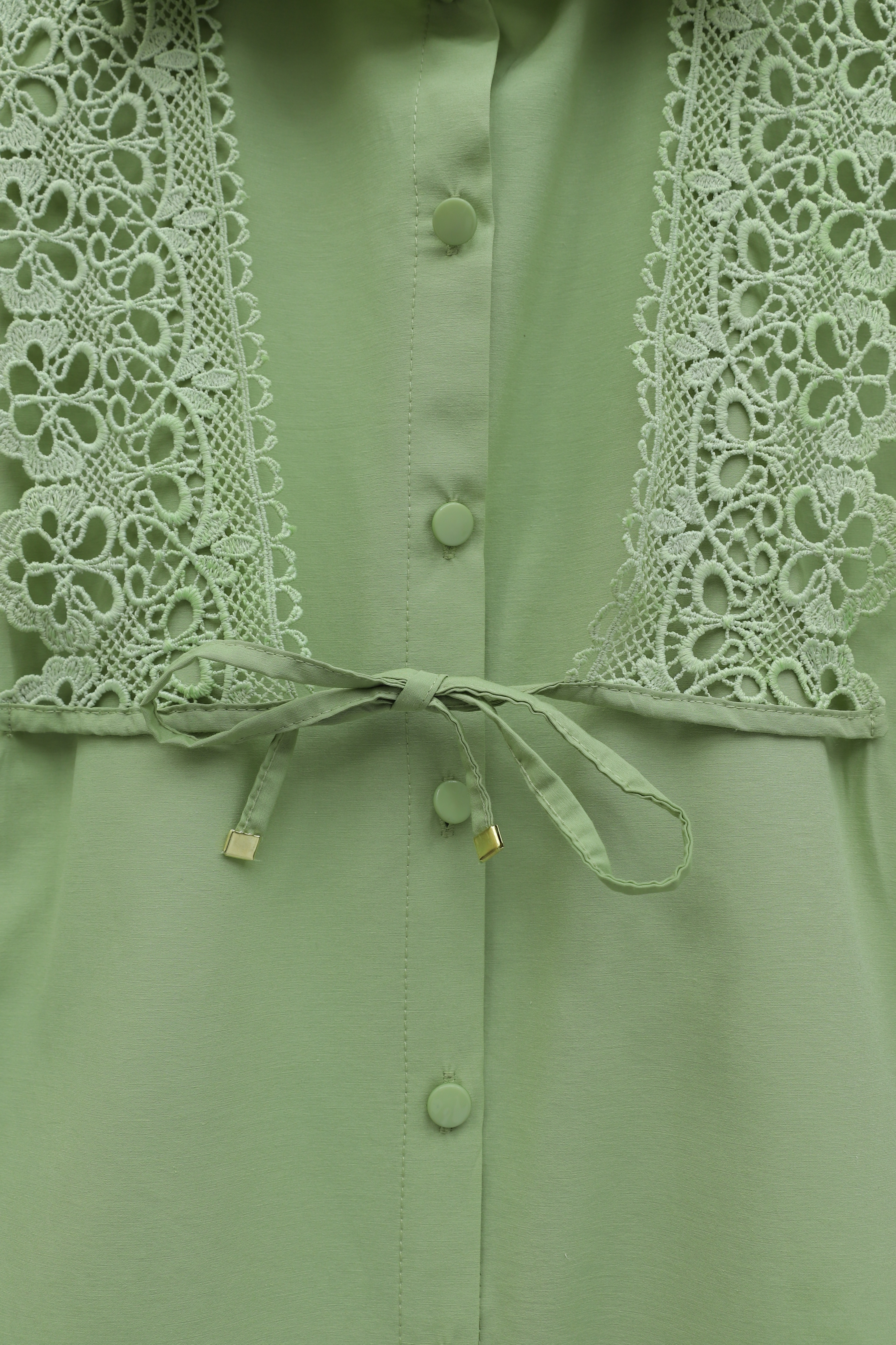 Önü Dantelli Bağlama Detaylı Düğmeli Poplin Gömlek -Çağla Y.