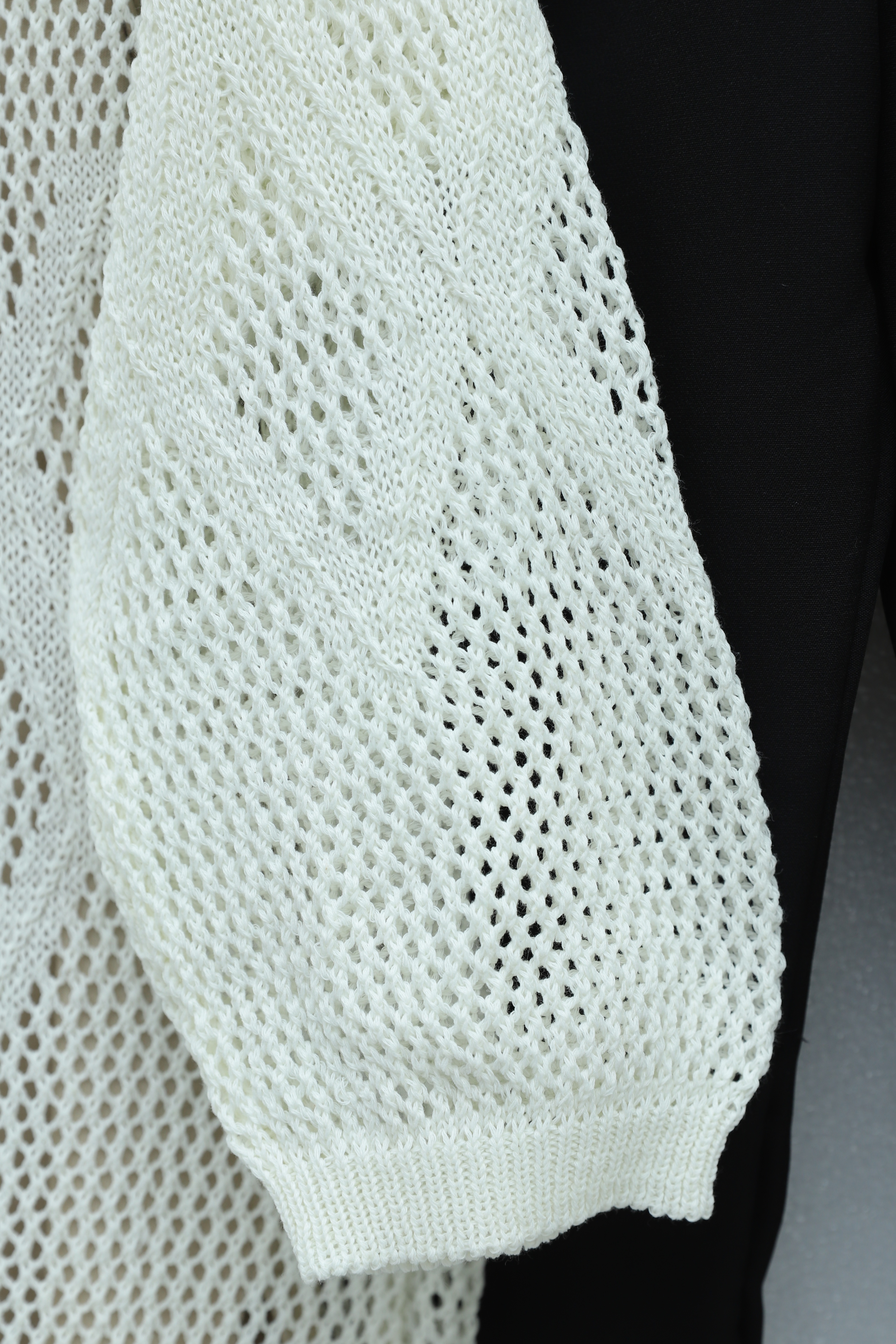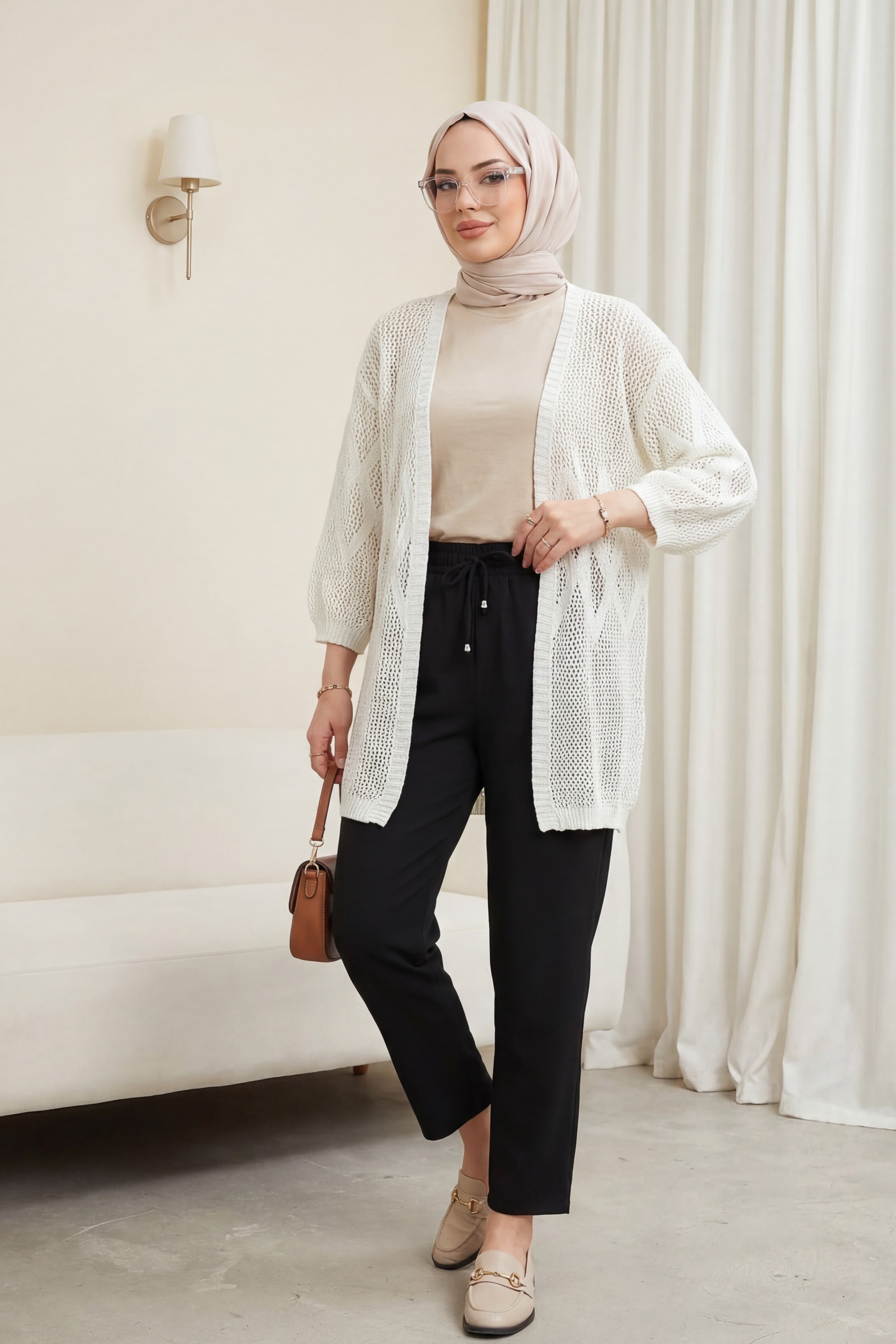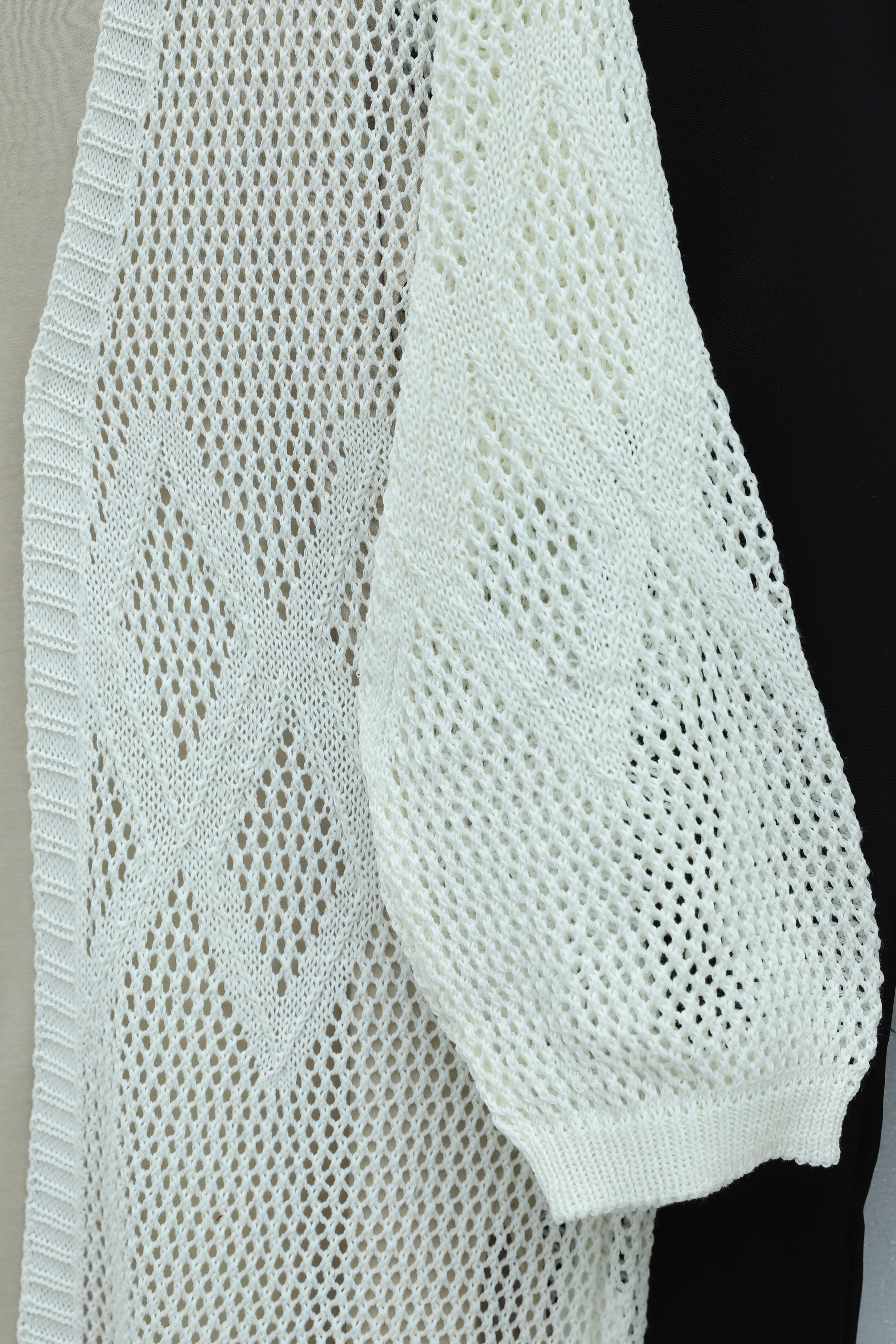 Baklava Desenli Ajurlu Triko Hırka -Beyaz