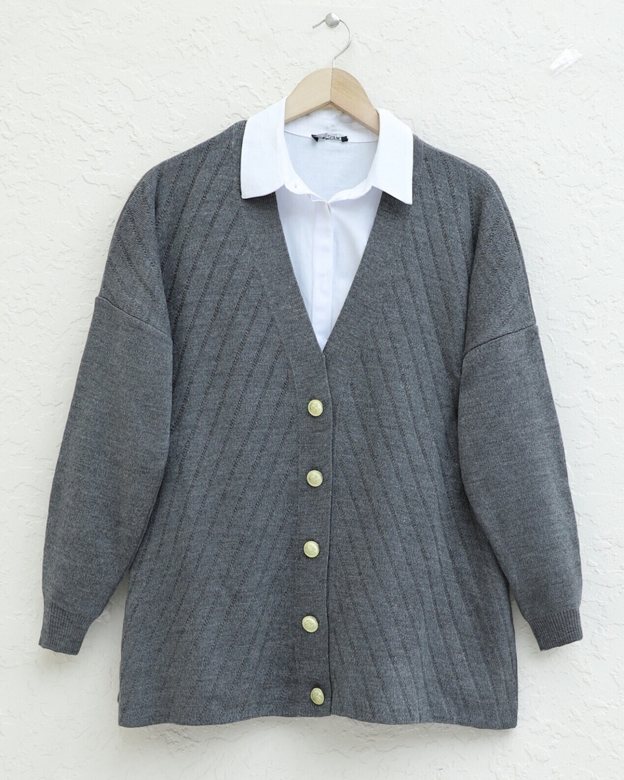 Çapraz çizgili, broş düğmeli, triko hırka; şıklığı ve zarafeti bir arada sunar. Çapraz çizgili tasarımı, hırkaya dinamik bir görünüm katarken, broş düğme detayı ise zarif bir dokunuş ekler. Yumuşak triko kumaşı ise konforlu bir kullanım sağlar. Hem günlük kombinlerde hem de özel davetlerde rahatça tercih edilebilecek bu hırka, her tarza uyum sağlar.