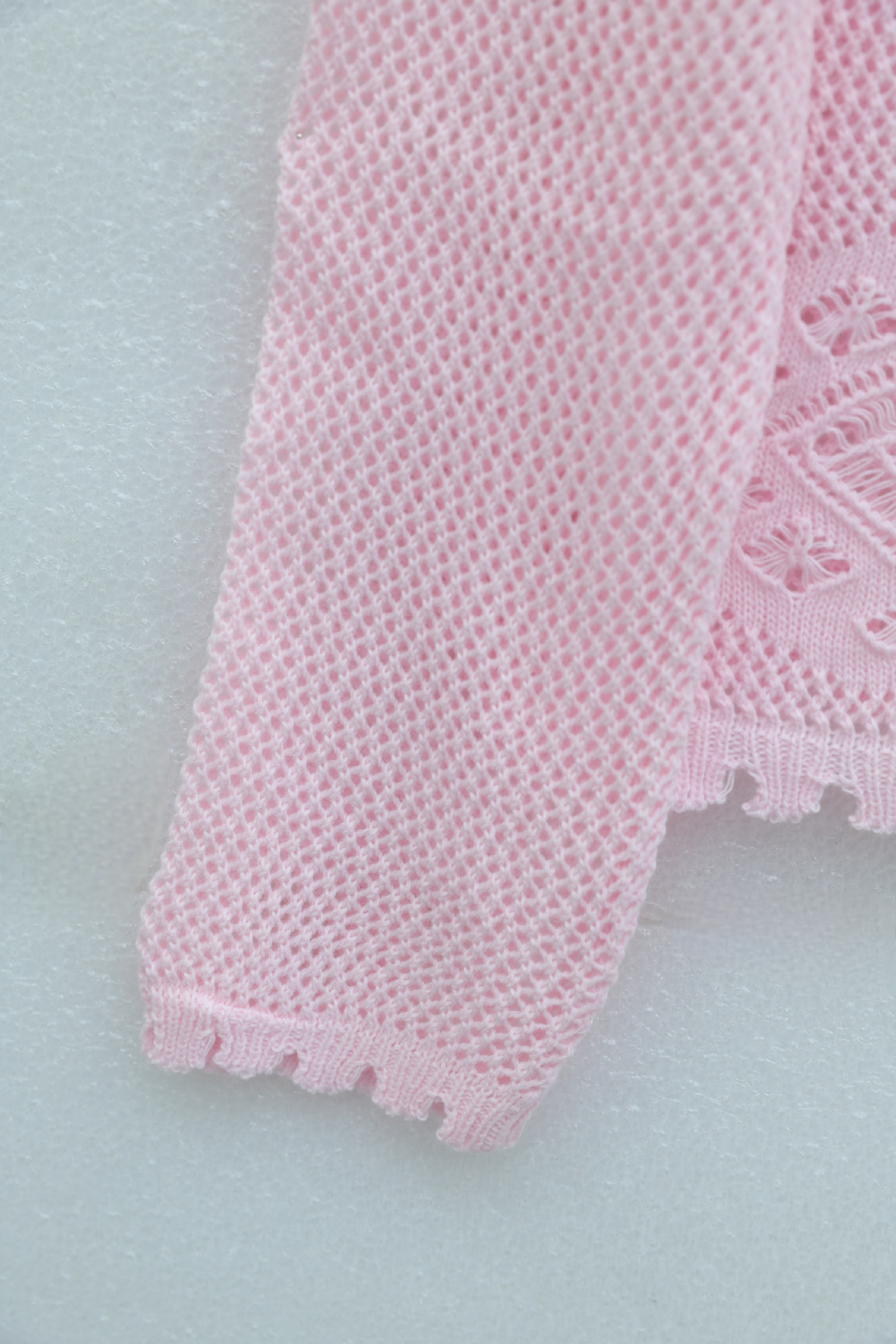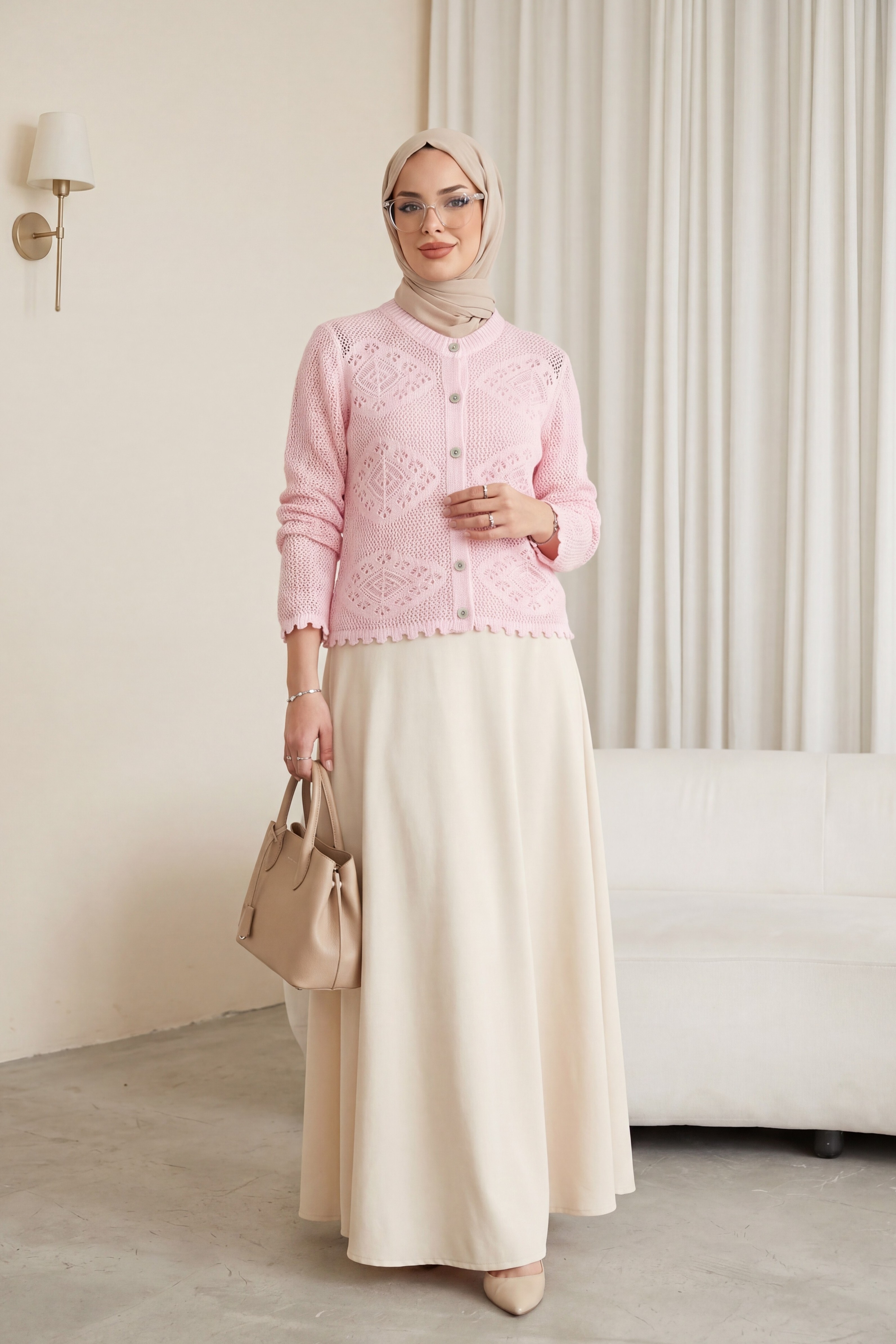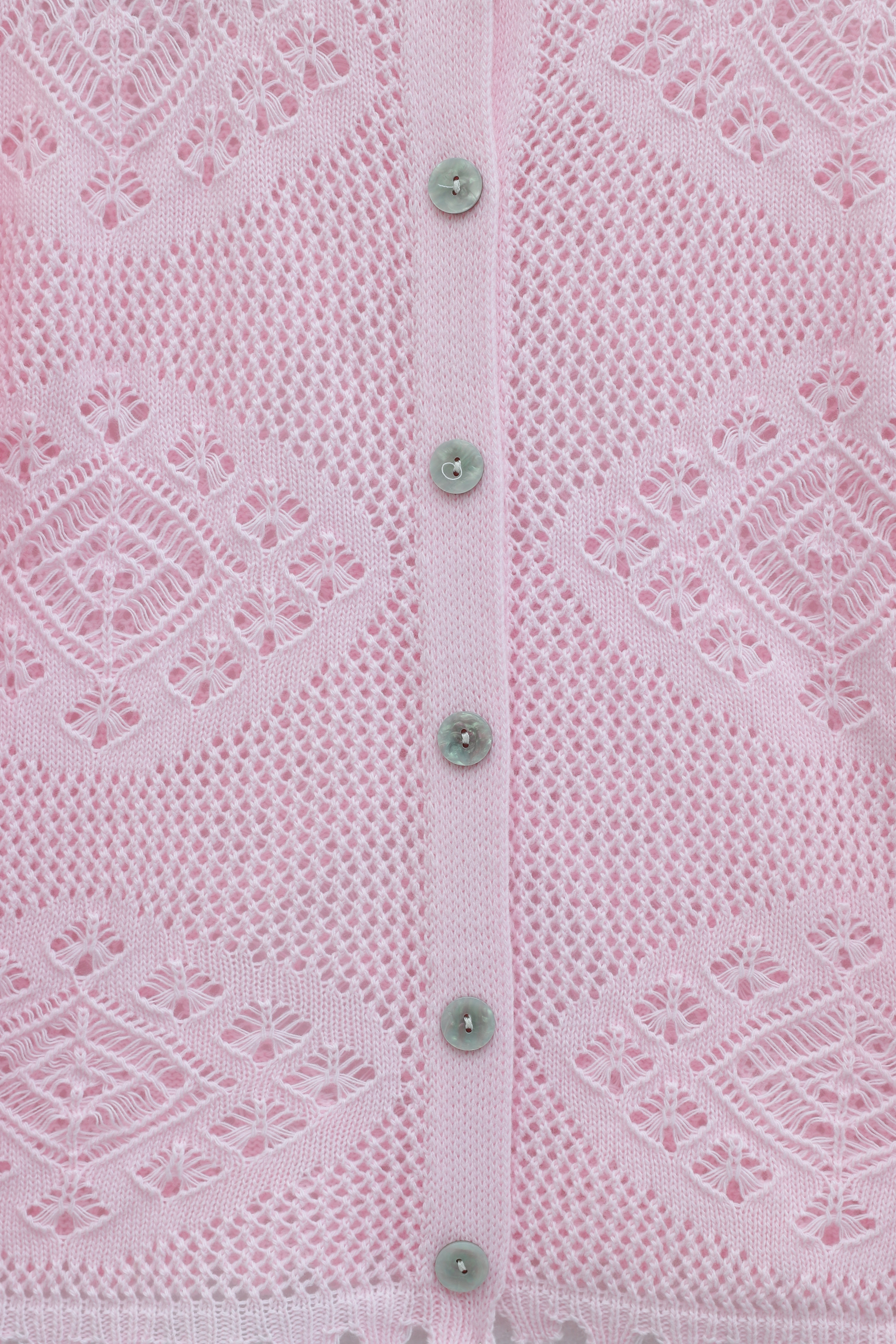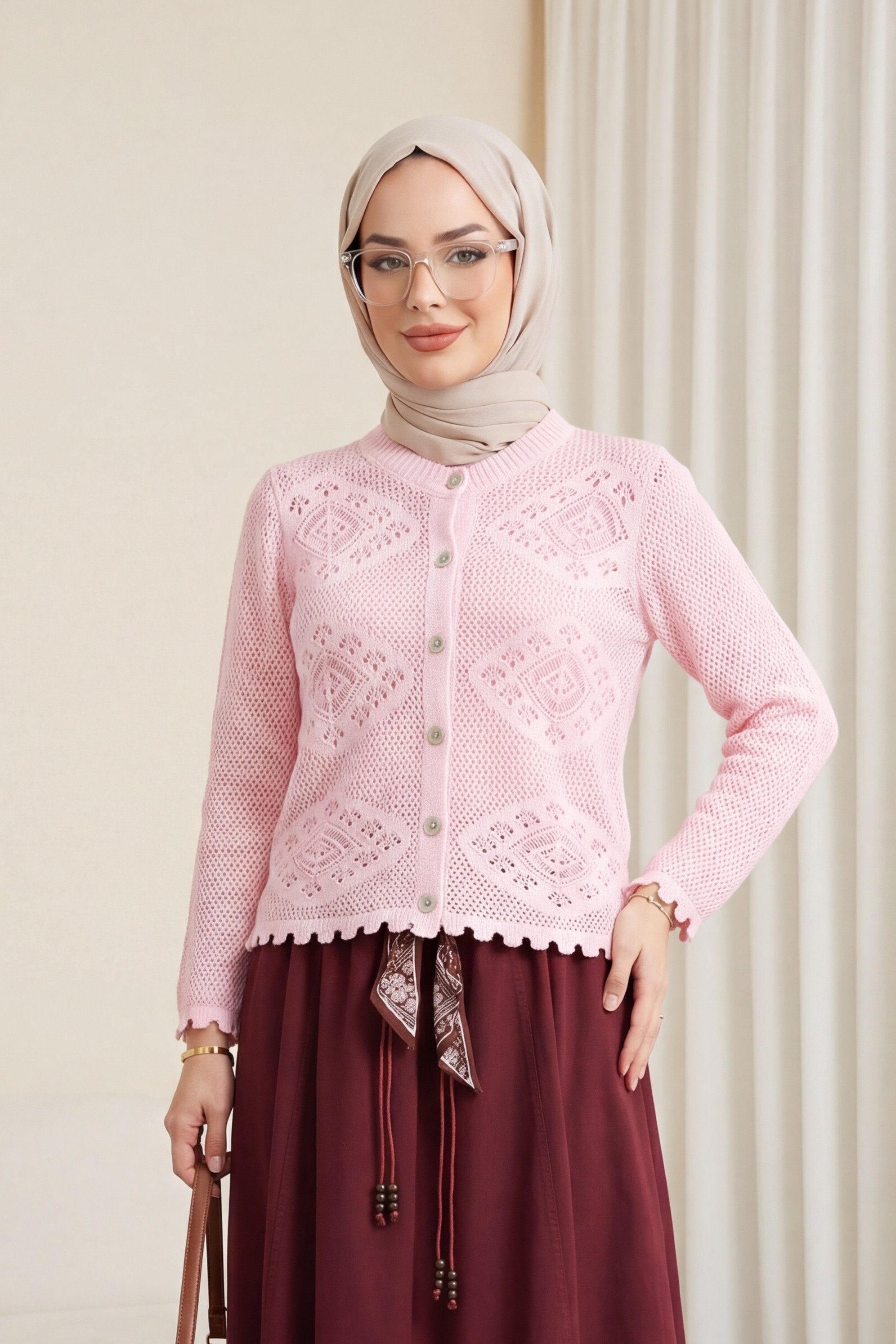 Geometrik Desenli Ajurlu Düğmeli Triko Hırka -Pudra pembesi