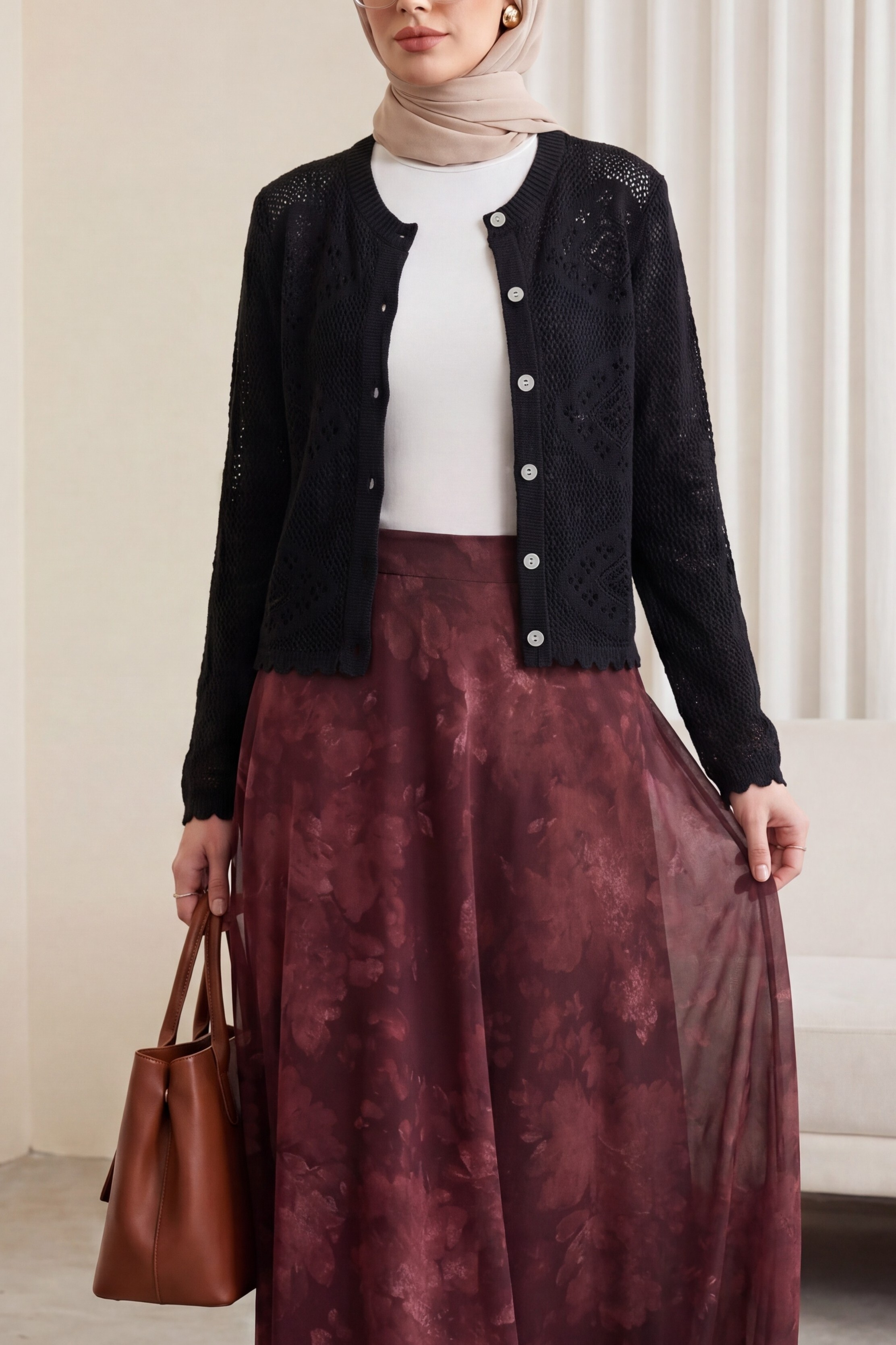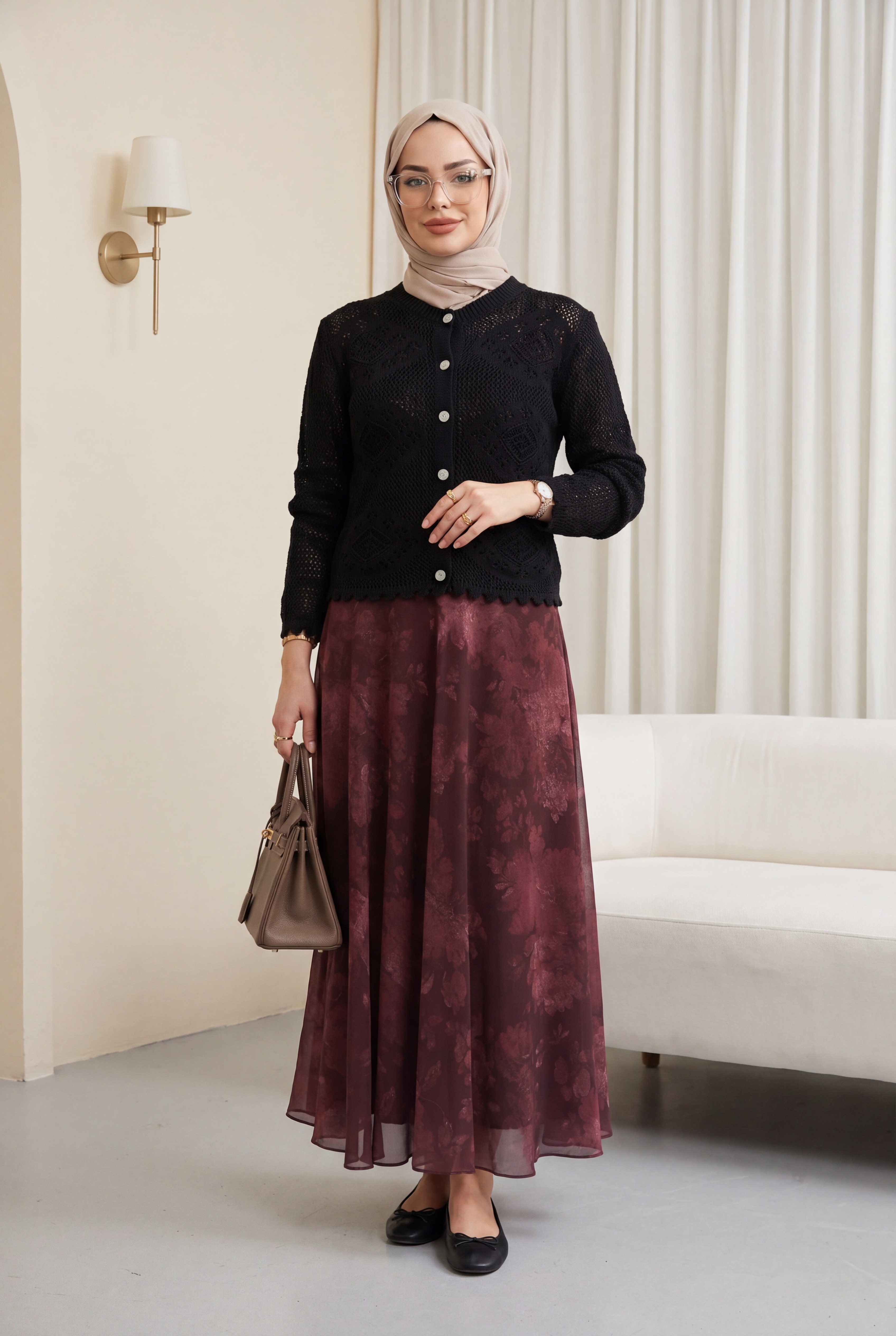 Kombindeki şal, çanta, ayakkabı ve takılar aksesuar olarak kullanılmıştır.