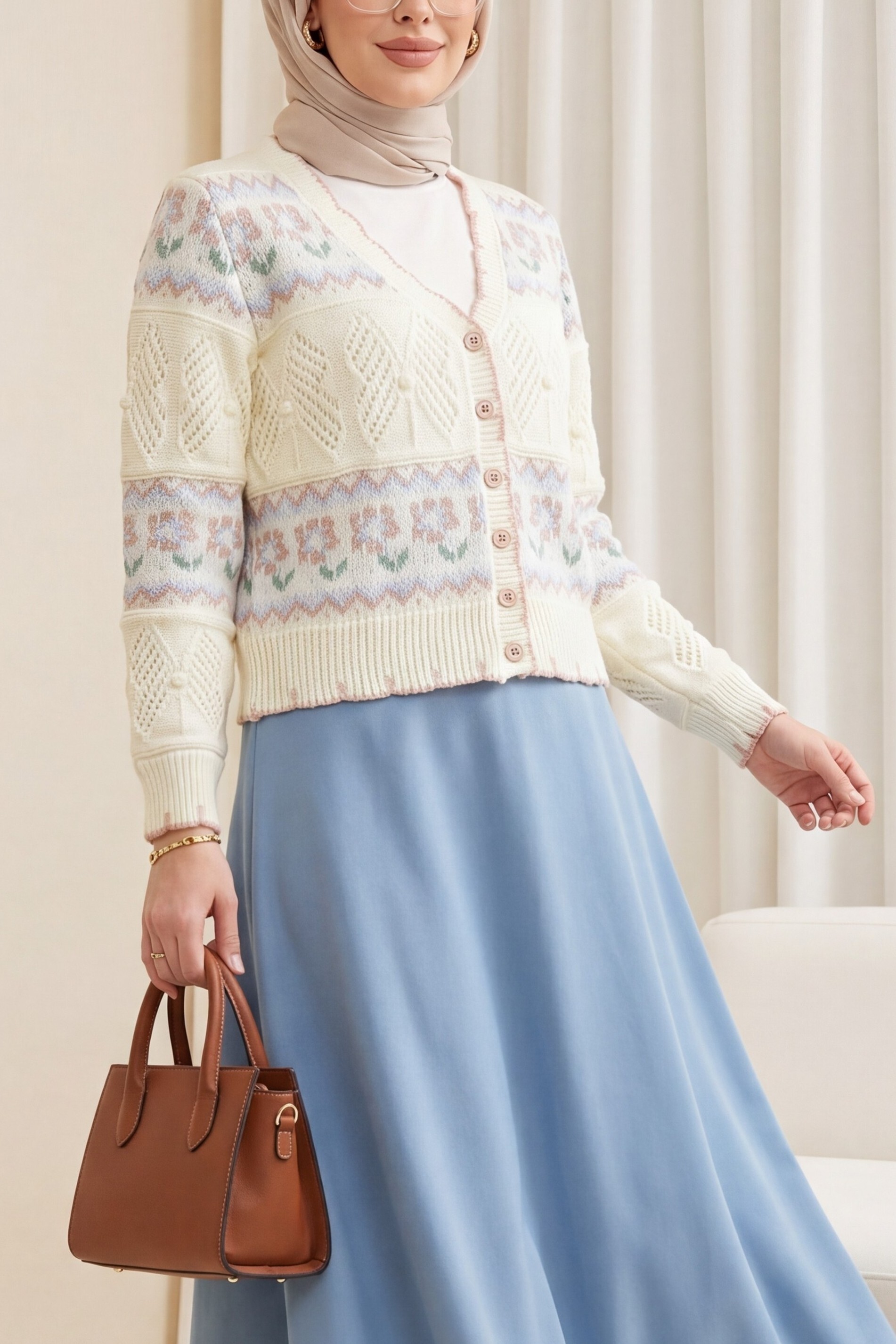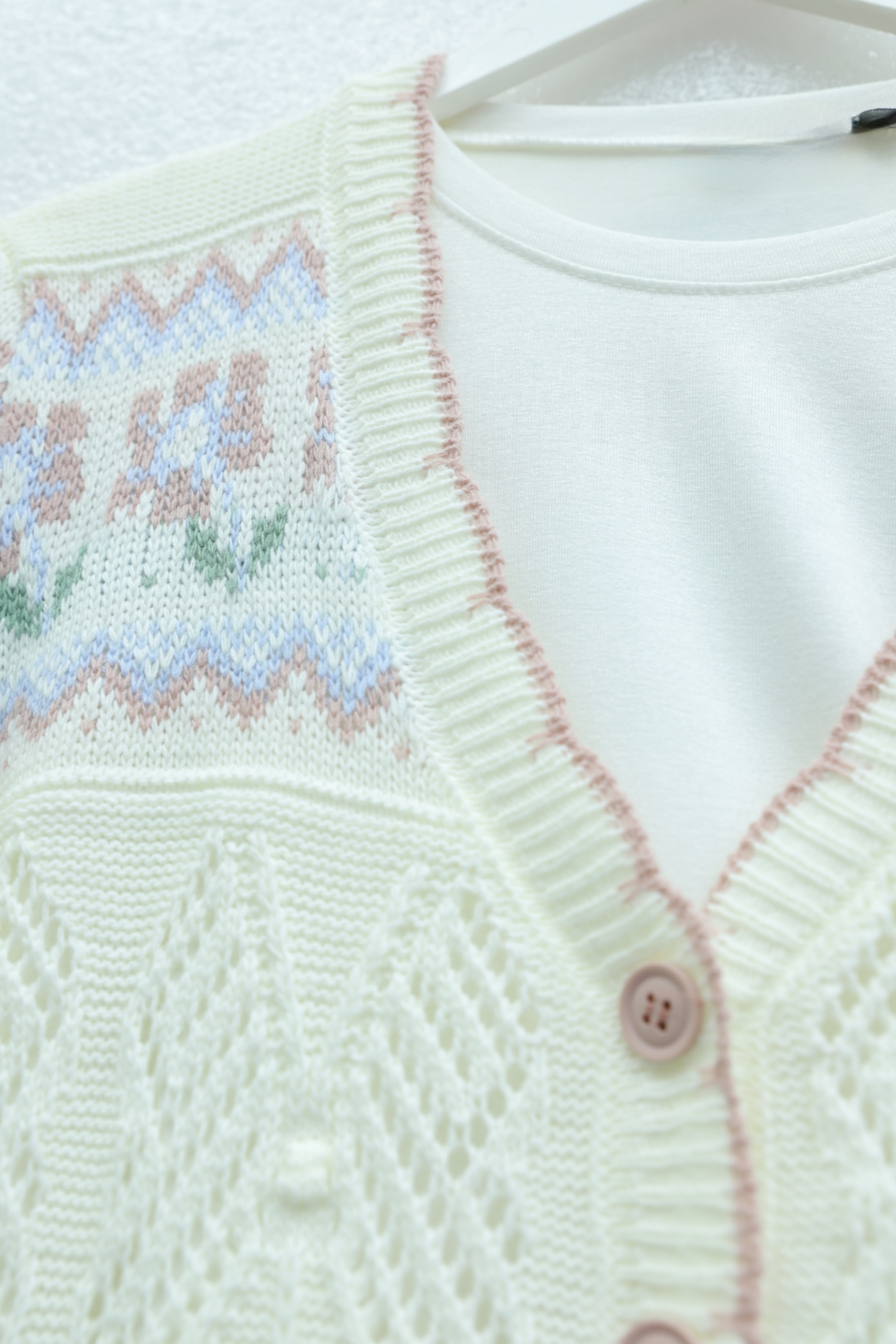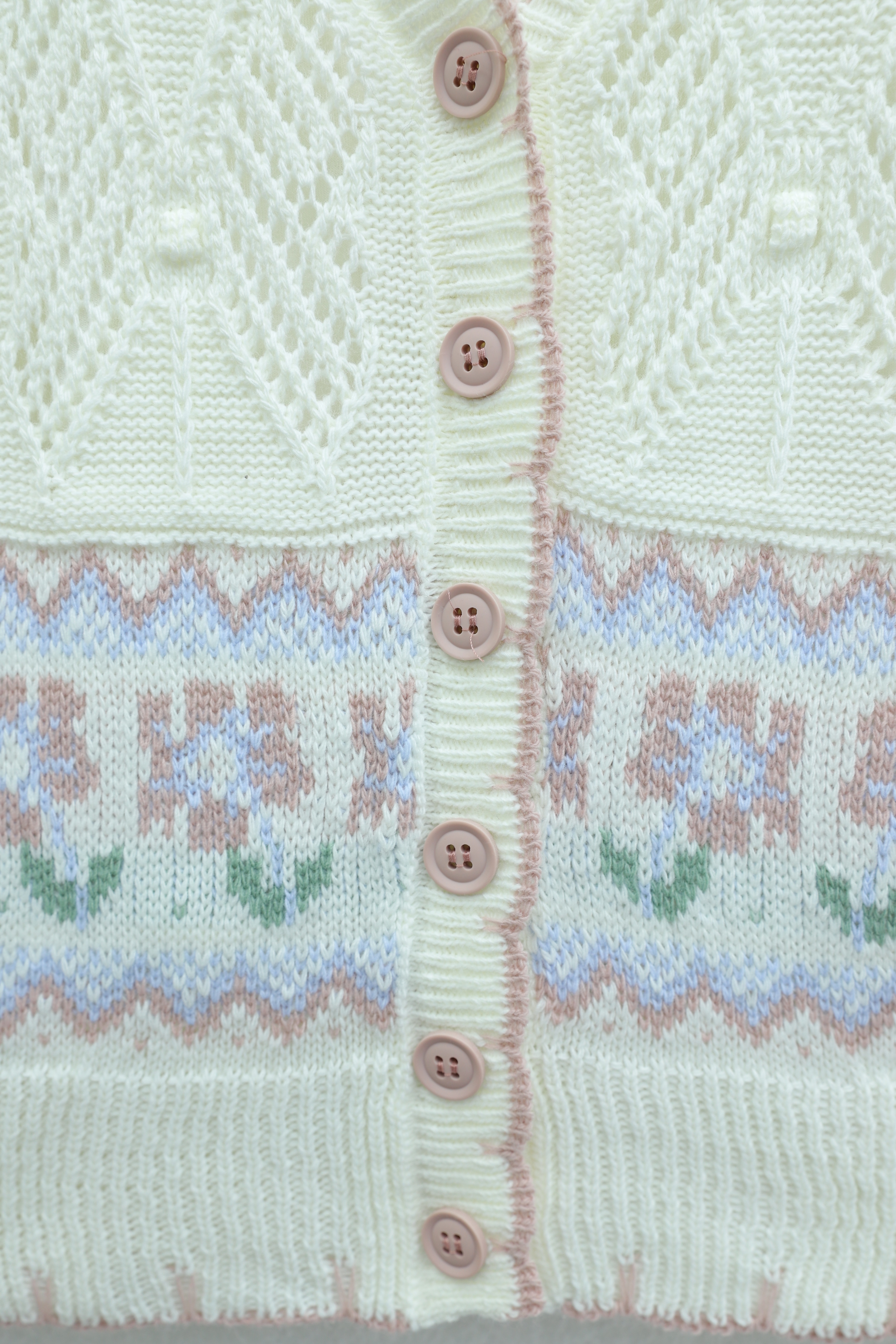 Kelebek Desenli Renkli Düğmeli Ajurlu Triko Hırka -Beyaz