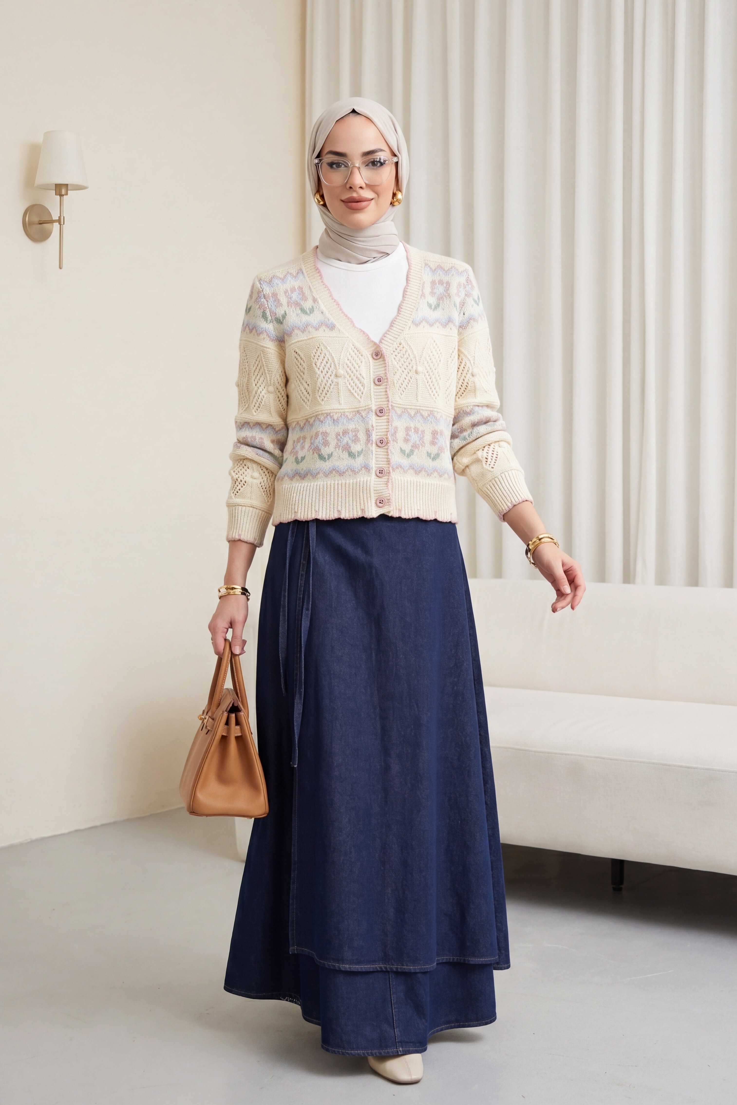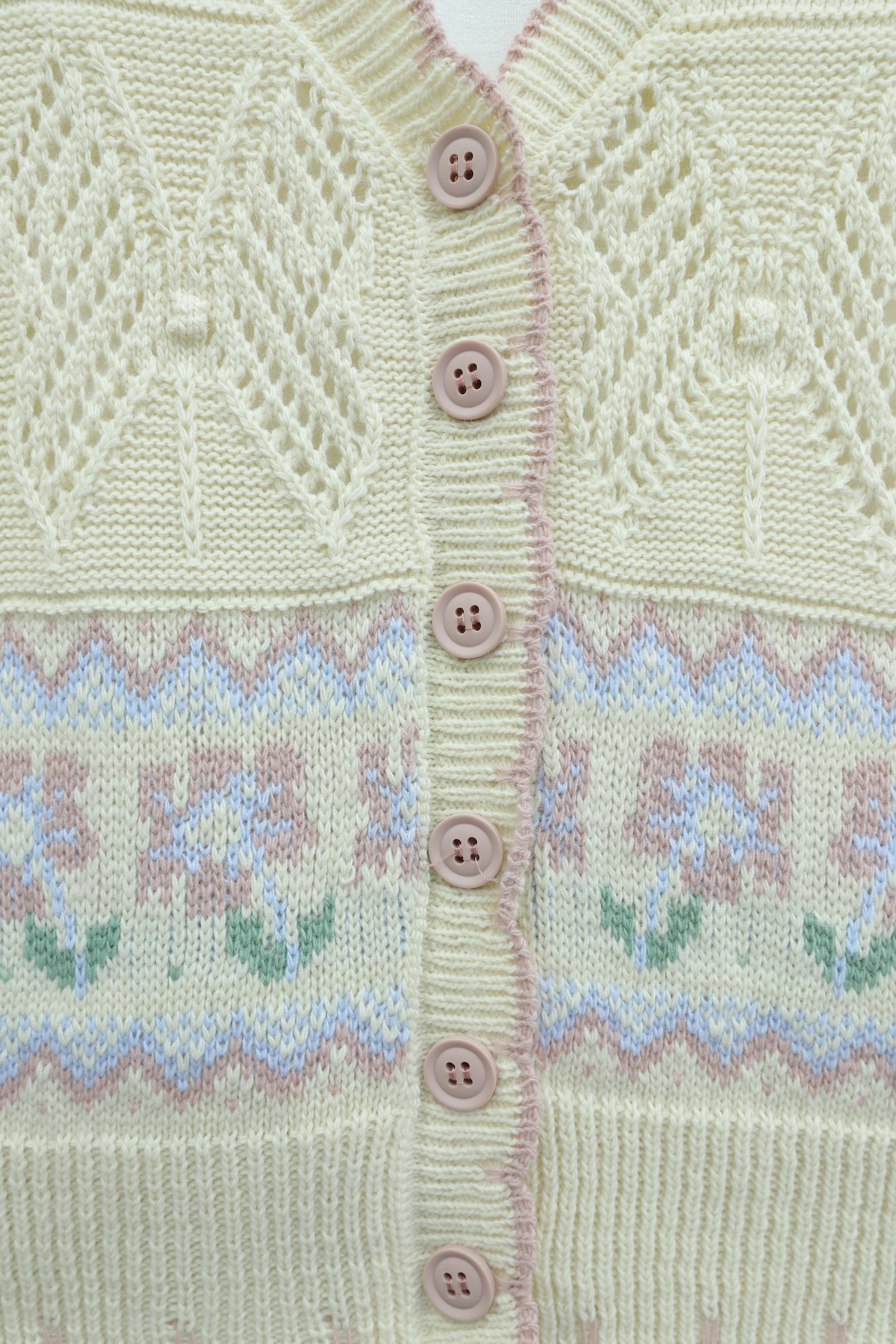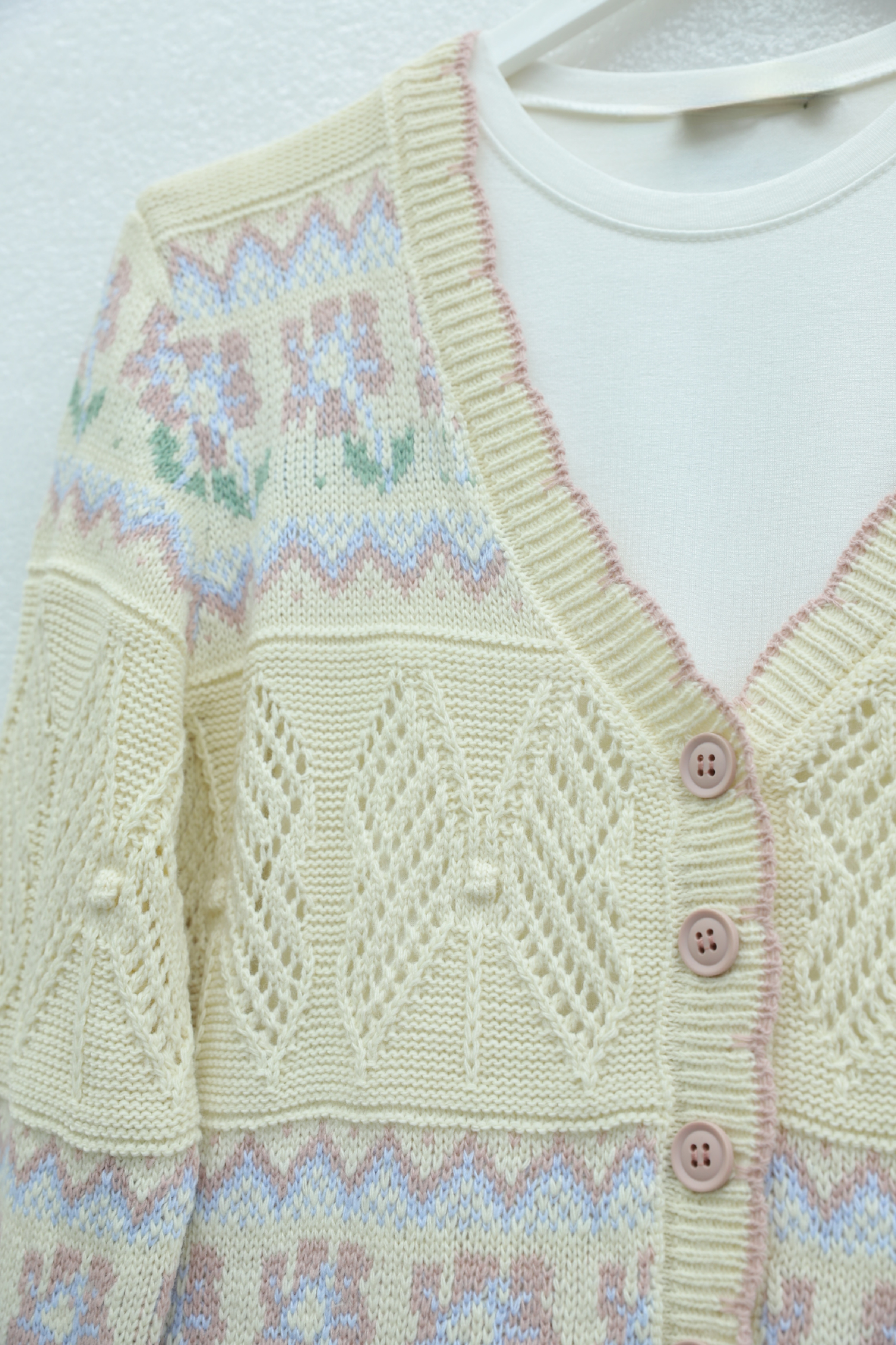 Kelebek Desenli Renkli Düğmeli Ajurlu Triko Hırka -Krem