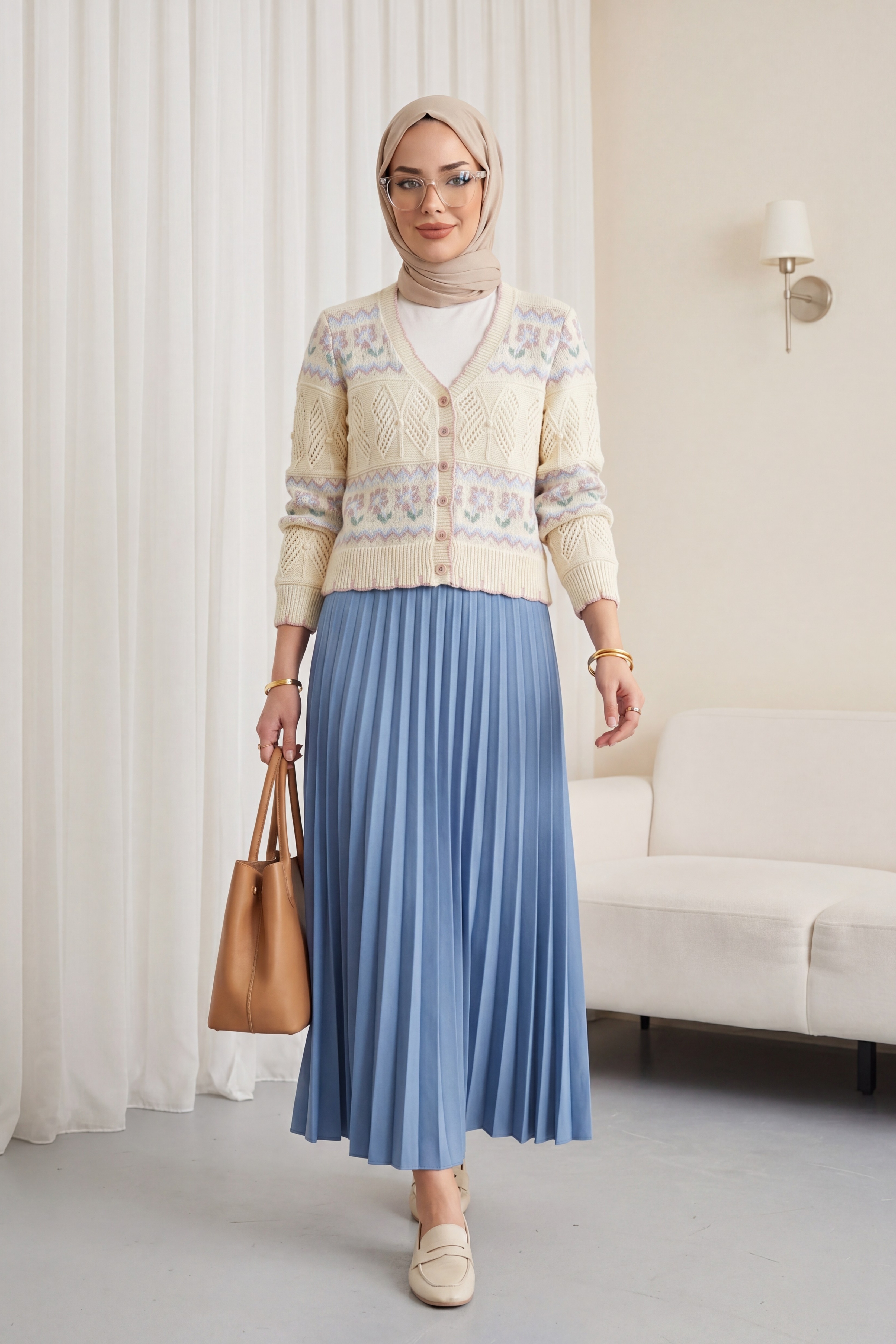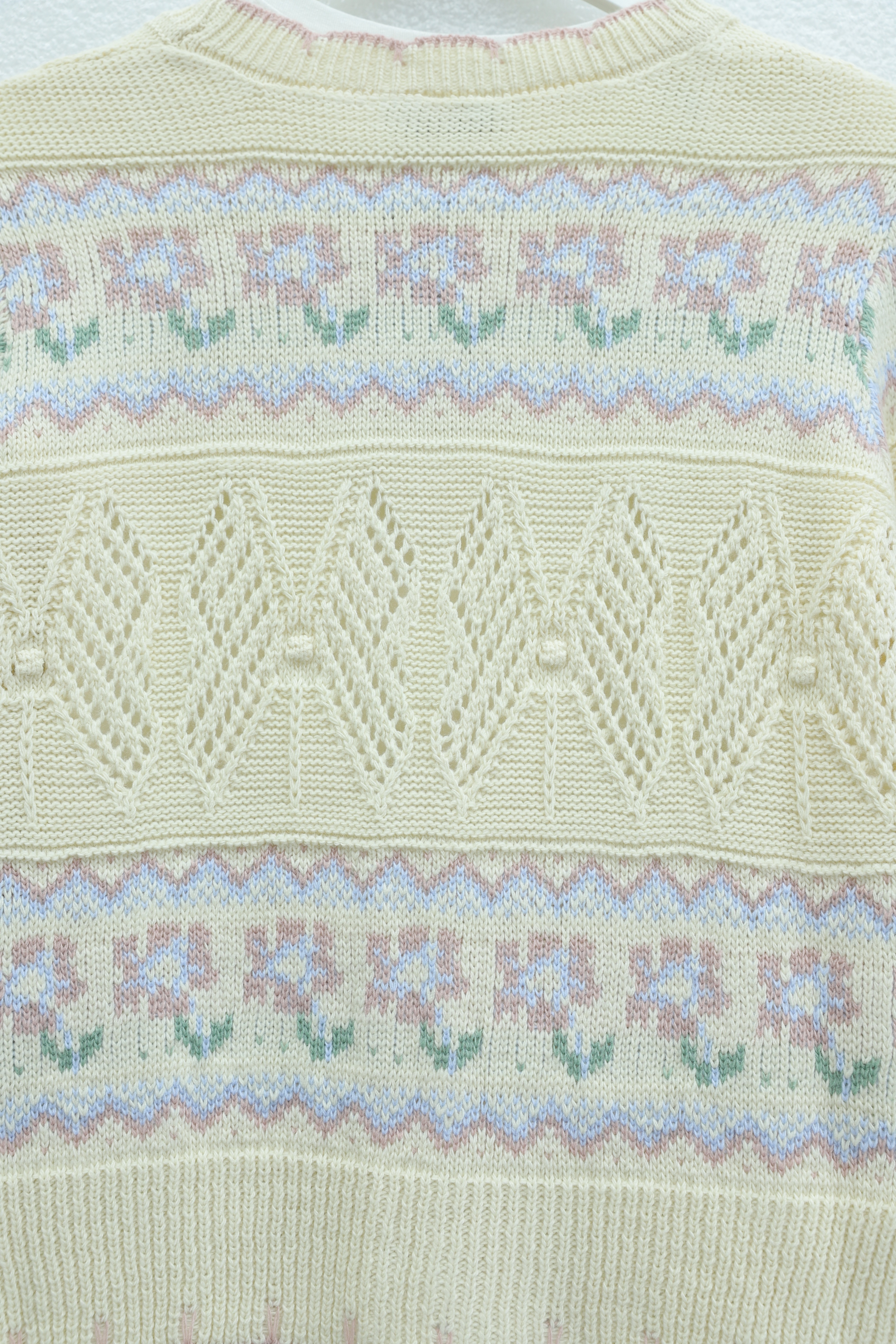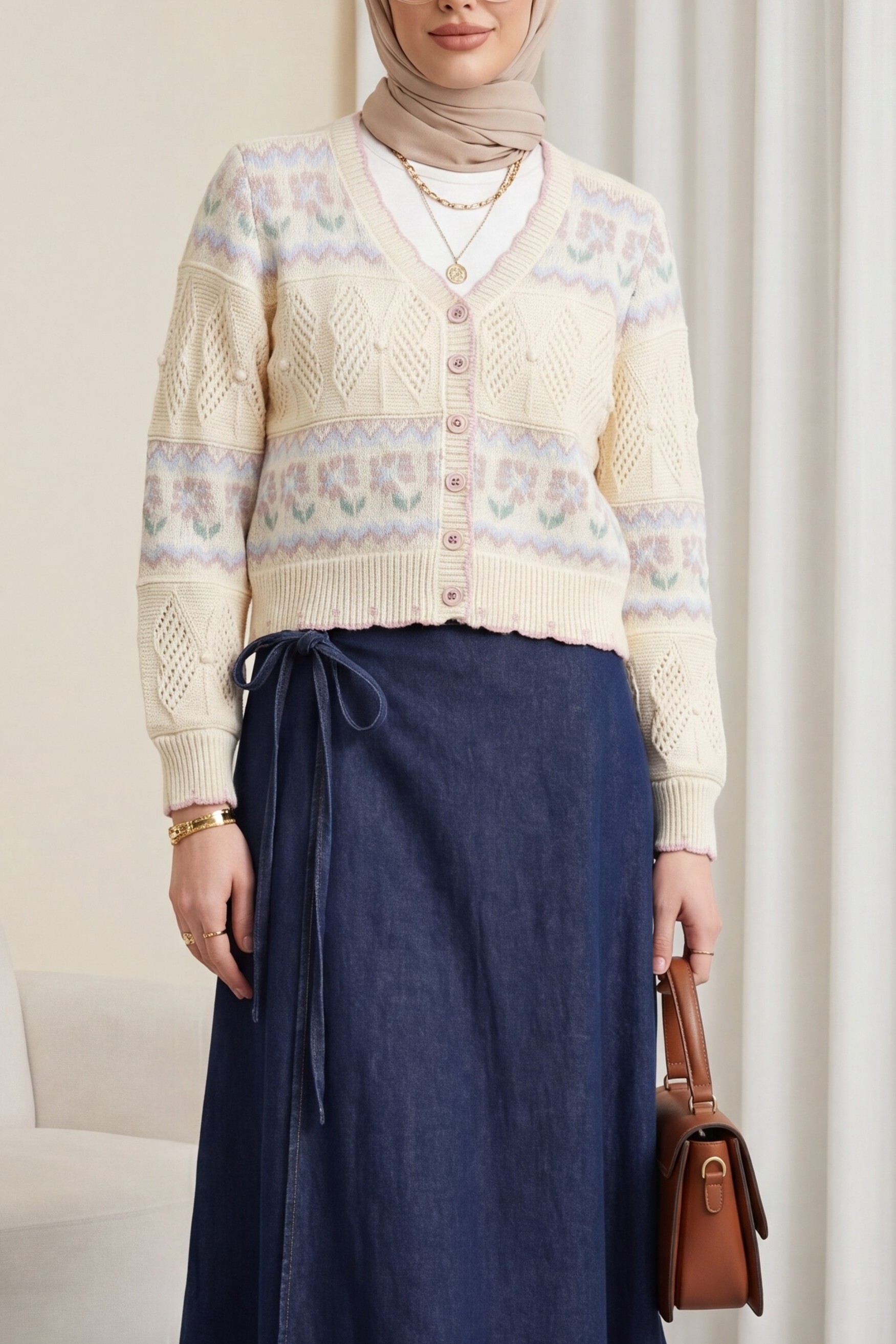 Kelebek Desenli Renkli Düğmeli Ajurlu Triko Hırka -Krem