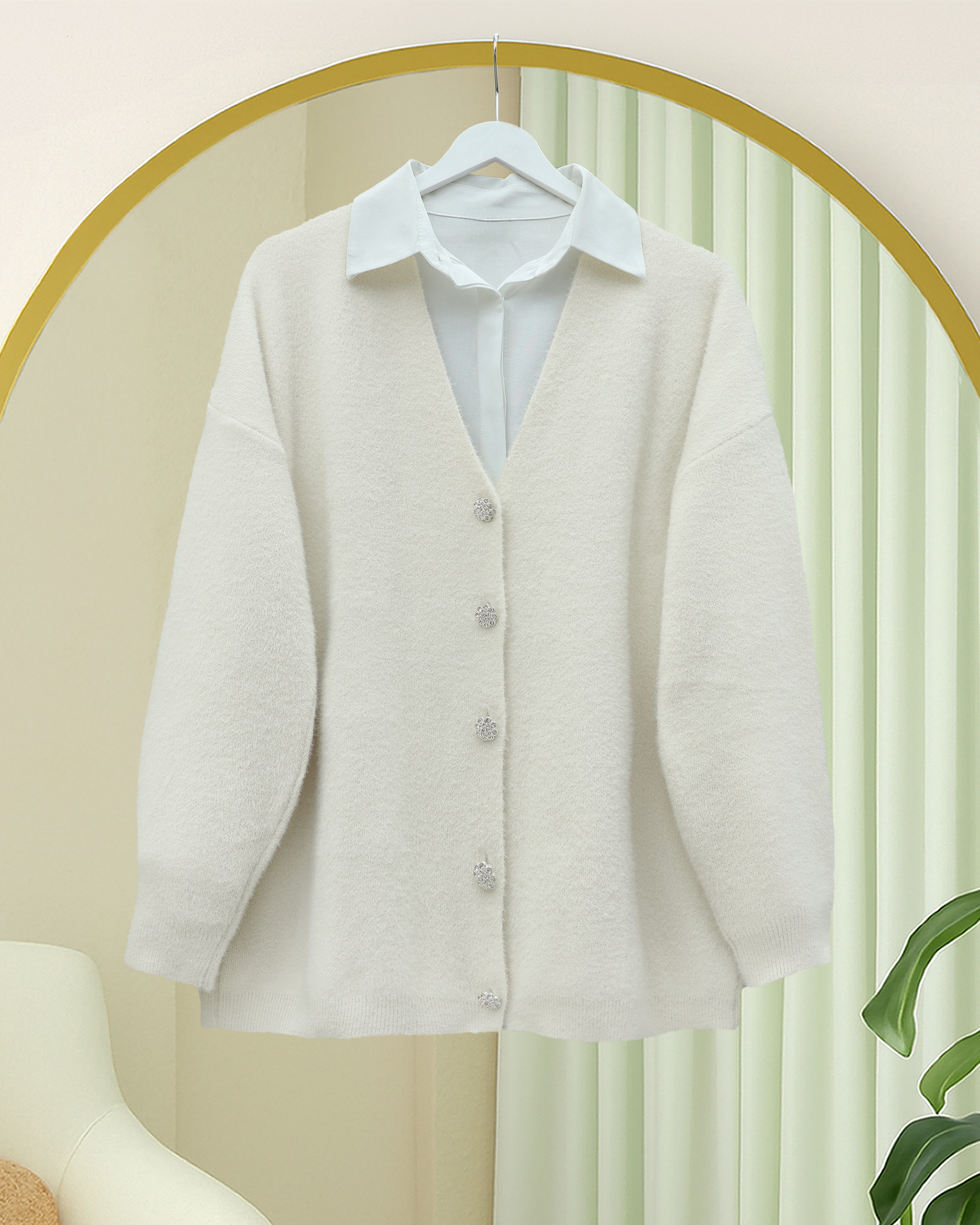 Sakallı triko dokusu ve önü düğmeli tasarımıyla hem sıcak tutan hem de şık bir görünüm sunan bu salaş hırka, rahatlığıyla öne çıkıyor. Gündelik şıklığı tamamlayacak, her kombine uyum sağlayacak mükemmel bir parça.