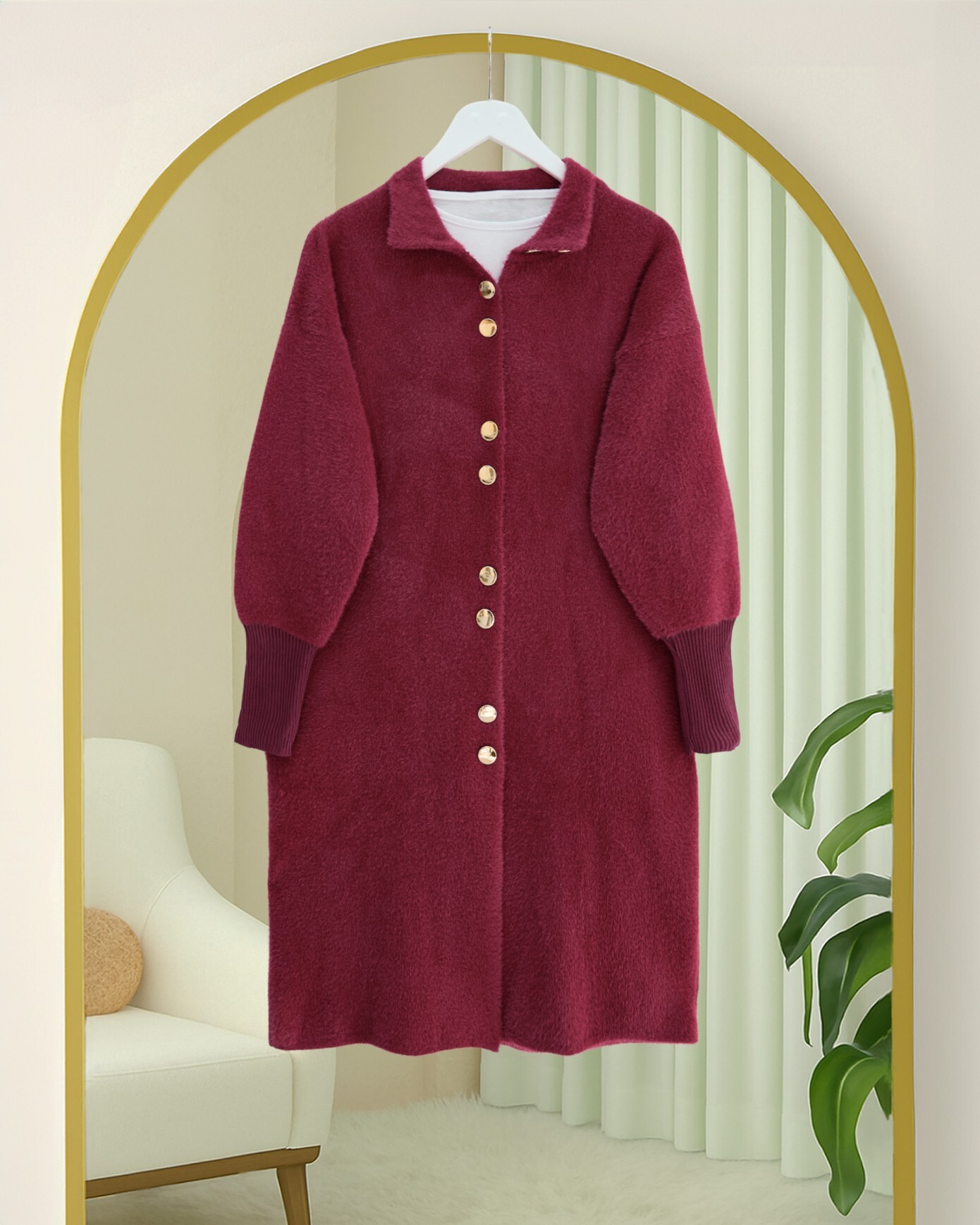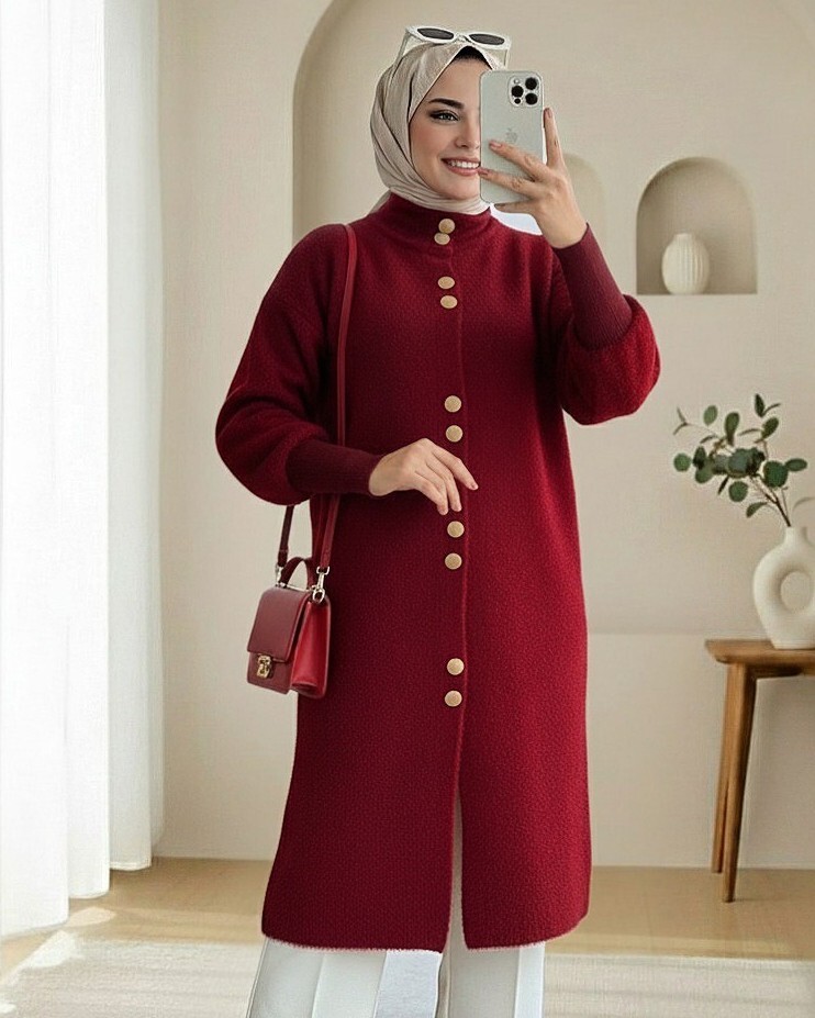 Önü düğmeli ve uzun sakallı yumoş hırka, yumuşacık dokusu ve zarif tasarımıyla konforu şıklıkla birleştiriyor. Hem rahat hem de şık bir görünüm için ideal bir seçenek.