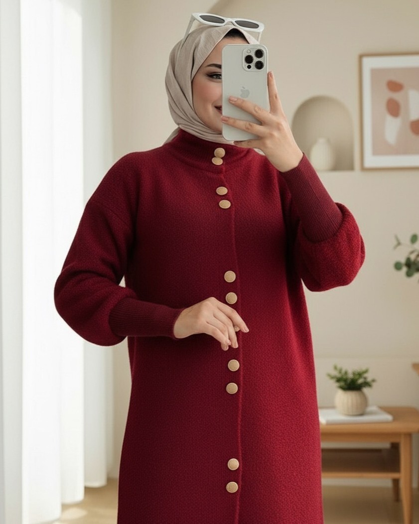 Önü Düğmeli Uzun Sakallı Yumoş Hırka -Bordo - 280-3265-R04