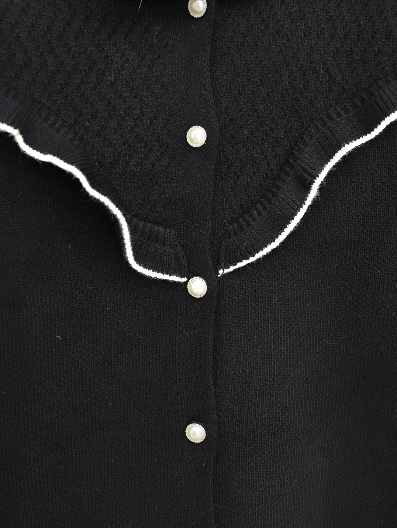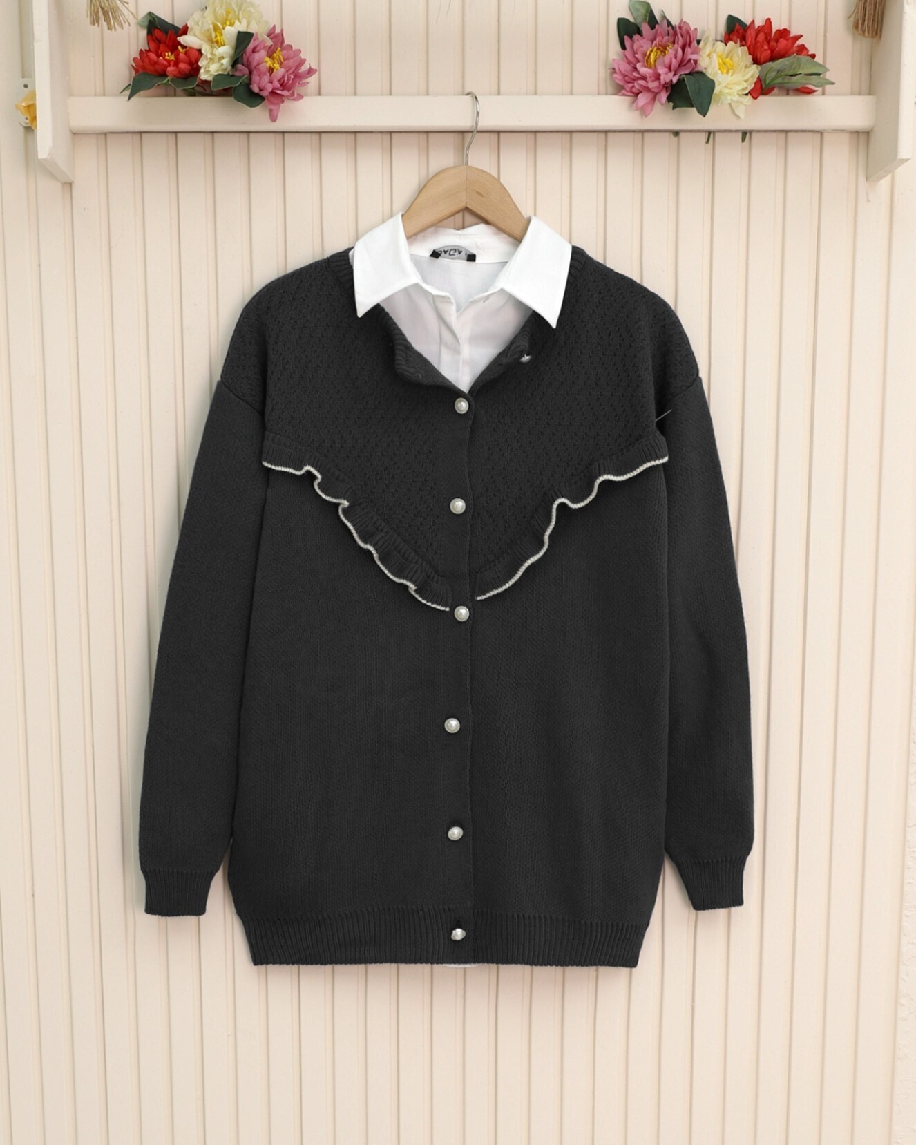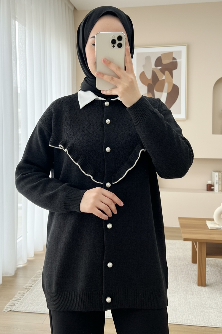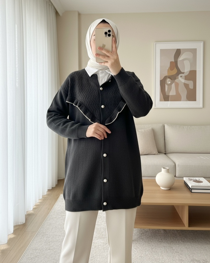 Önü fırfırlı, incili, düğmeli triko hırka; zarif ve şık bir dış giyim parçasıdır. Ön kısmındaki fırfır detayı, hırkaya feminen bir hava katarken, incili düğmeler ise şıklığına sofistike bir dokunuş ekler. Yumuşak triko kumaşı, rahat bir kullanım sağlar ve soğuk havalarda sıcak tutar. Hem günlük kullanımda hem de özel davetlerde tercih edilebilecek bu hırka, zarif detaylarıyla her tarza uyum sağlar. Hem şıklığı hem de konforu bir arada sunan bu parça, gardırobunuzda yer alması gereken mükemmel bir tercihtir.