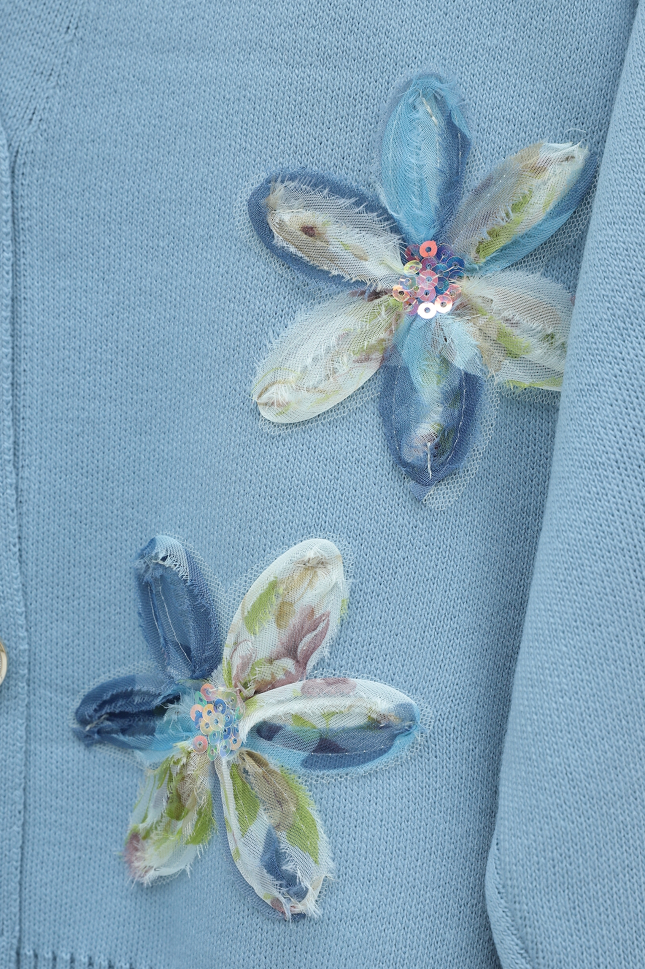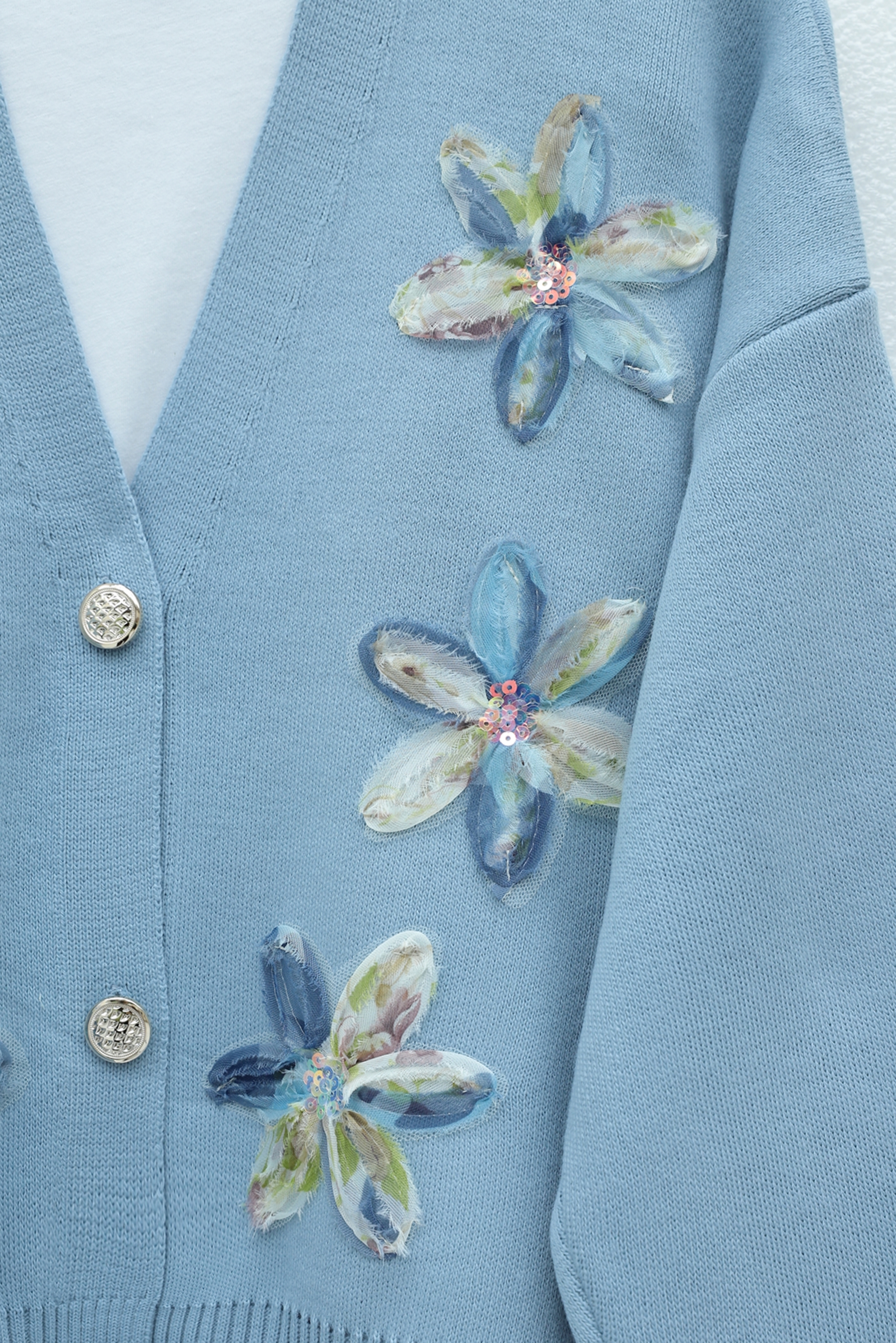 Önü Pul Ve Çiçek Detaylı Düğmeli Triko Hırka -Mavi