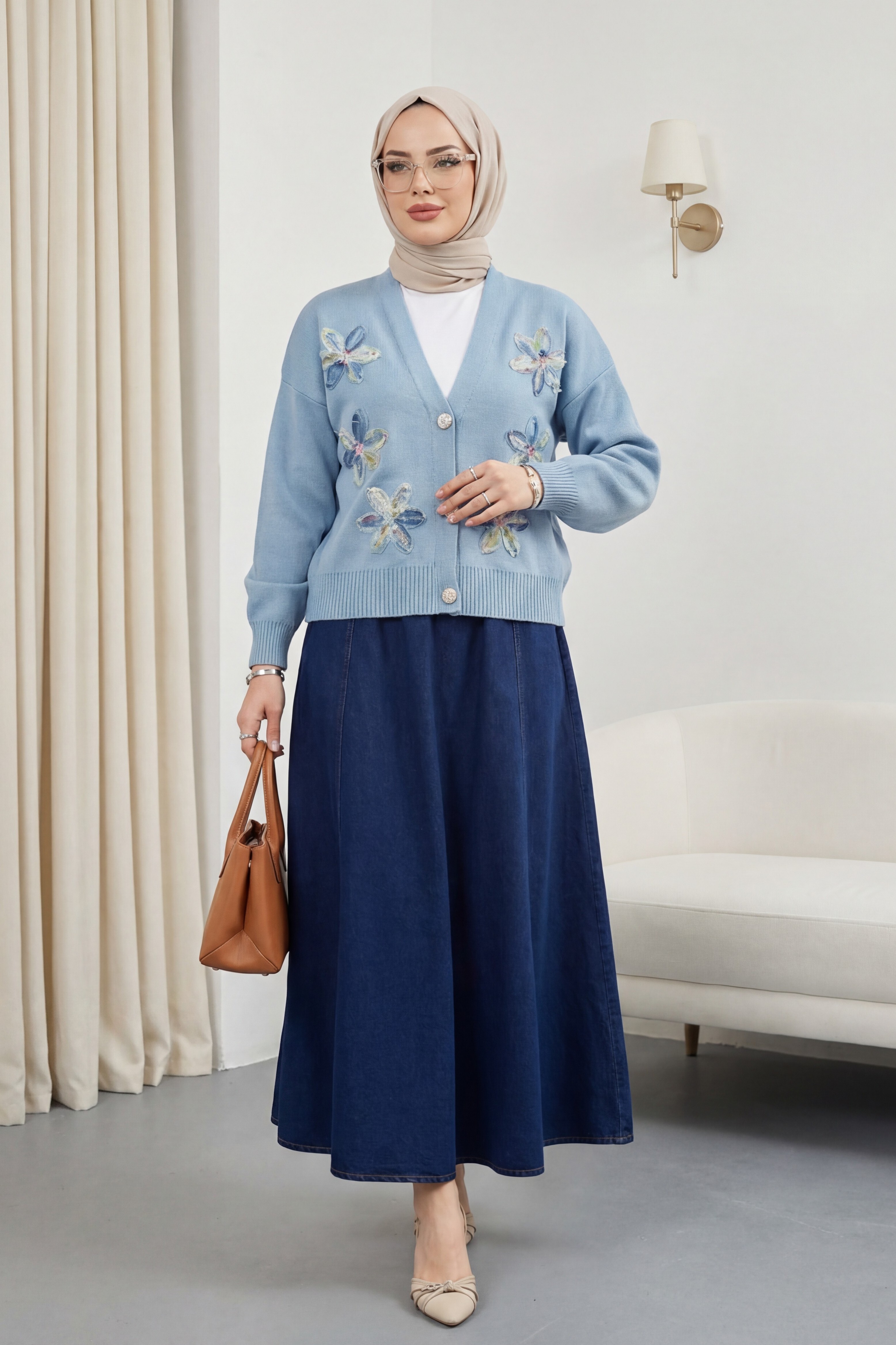 Kombindeki şal, çanta, ayakkabı ve takılar aksesuar olarak kullanılmıştır.