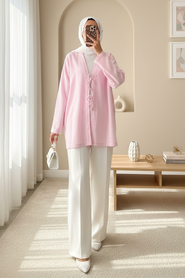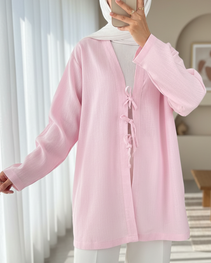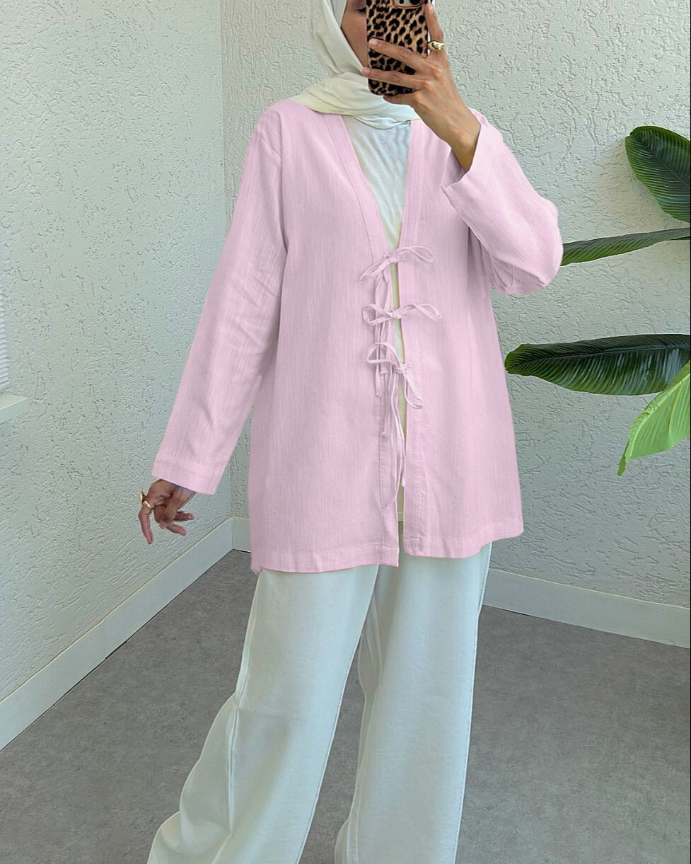 Doğal şıklığın anahtarı! Hafif ve nefes alabilen keten kumaşıyla tasarlanan bu kimono, önü üç bağcıklı modern kesimiyle hem rahat hem stil sahibi bir görünüm sunar. Günlük kombinlerden plaj stiline kadar çok yönlü kullanım için ideal.