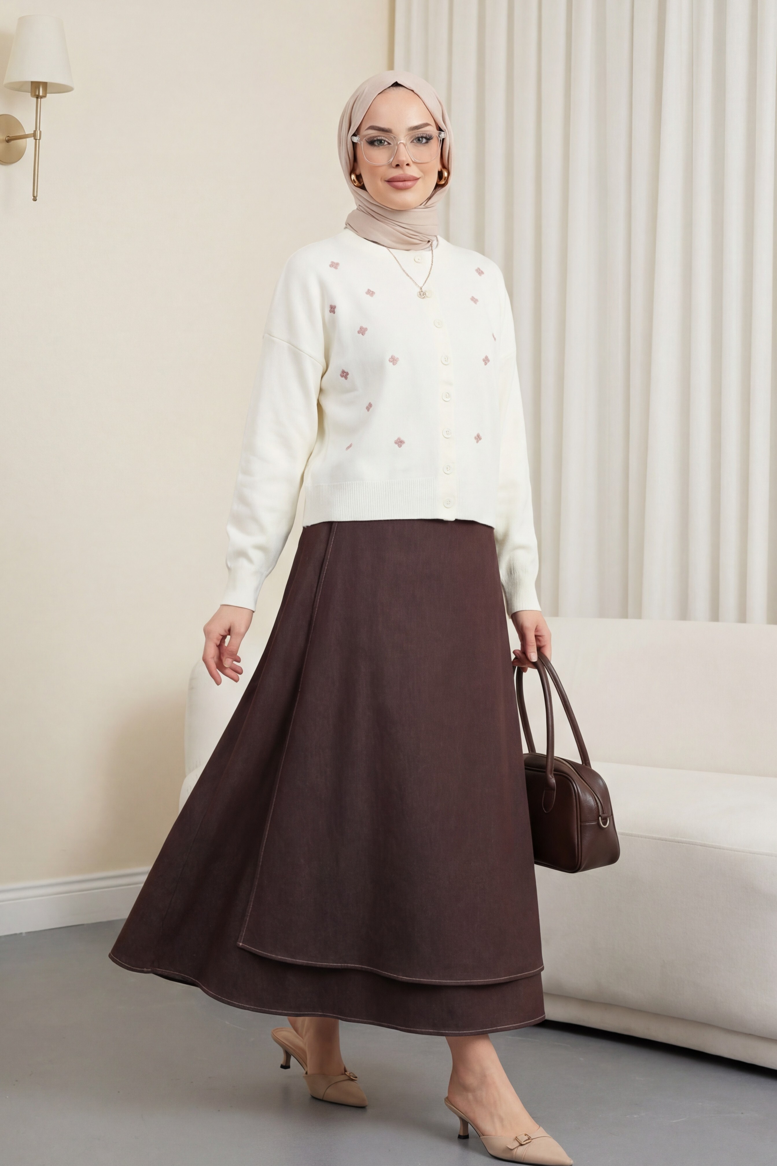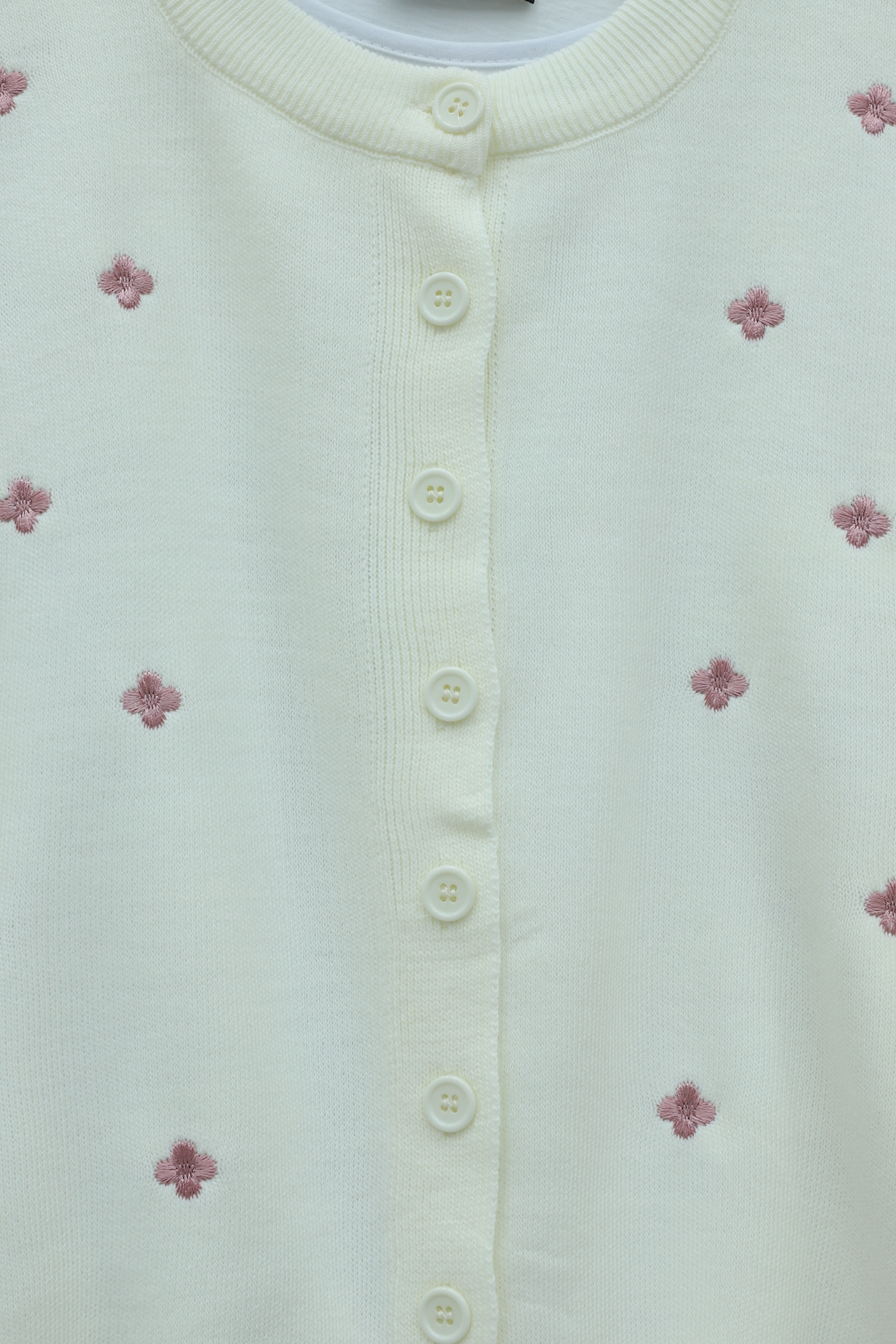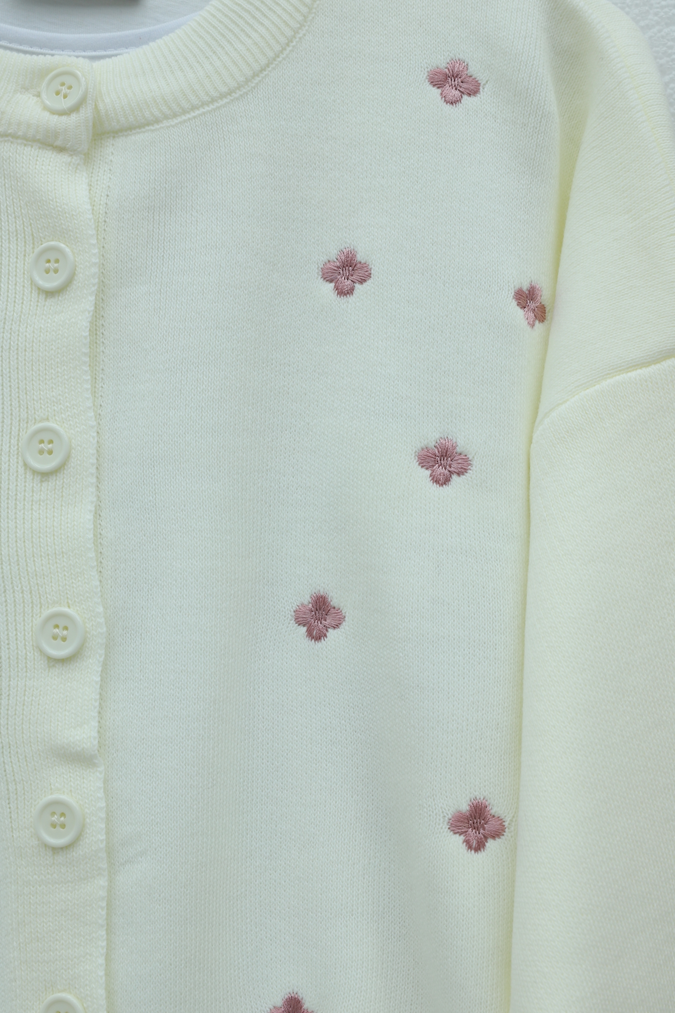 Serpme Çiçek Nakışlı Düğmeli Oversize Triko Hırka -Ekru