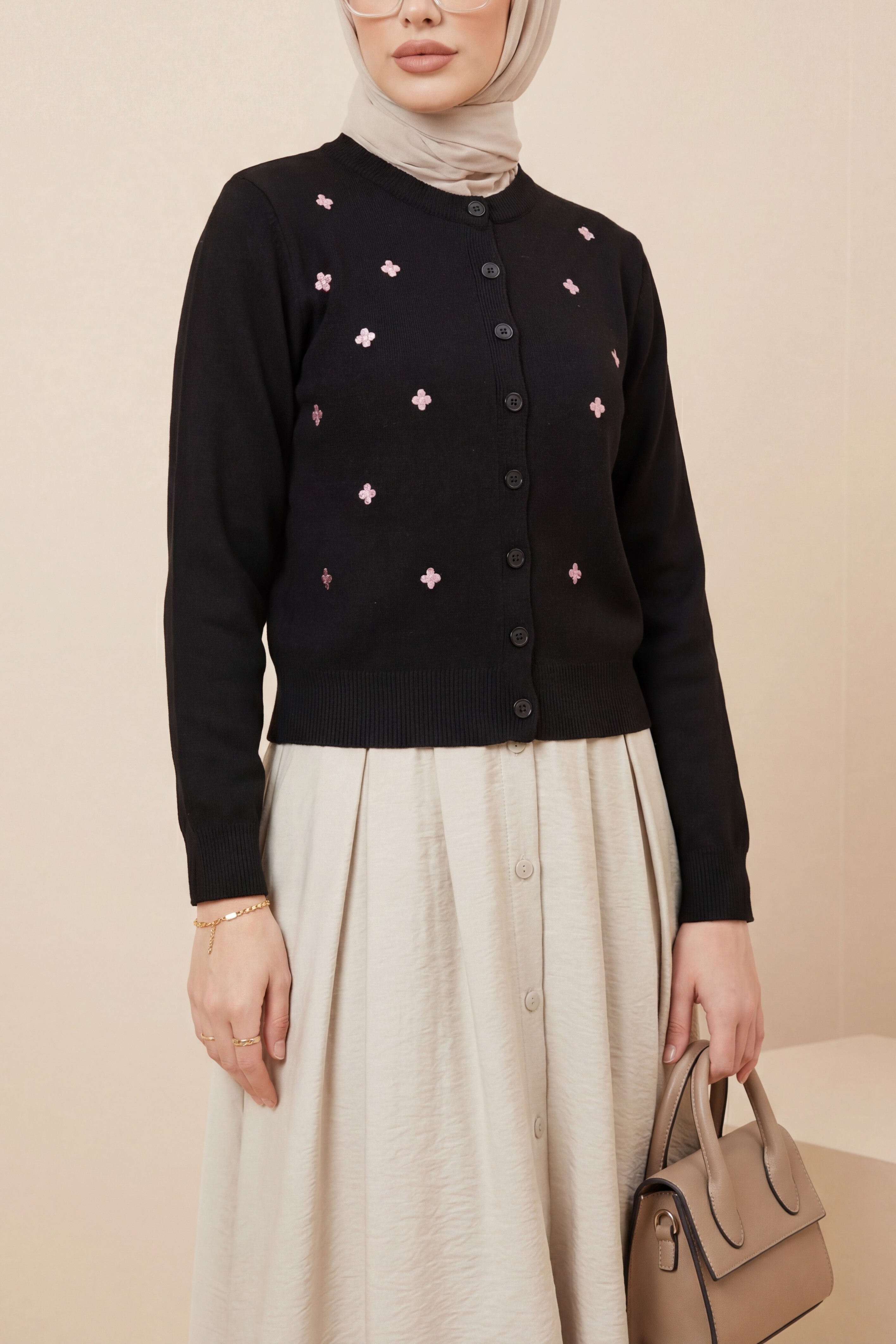 “Çiçek nakışlı triko hırka”, “oversize kadın hırka”, “düğmeli triko hırka modeli”, “romantik triko hırka” gibi adlandırılabilir.