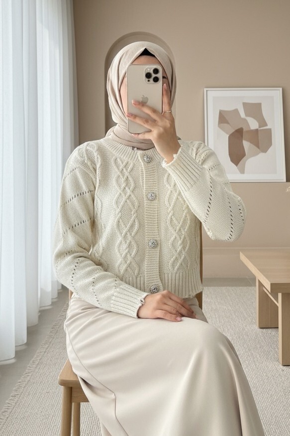 Not: Ürün içeriği hırkadan oluşmaktadır. (Kazak, pantolon, ayakkabı, çanta ve takılar dekor amaçlı kullanılmaktadır.)