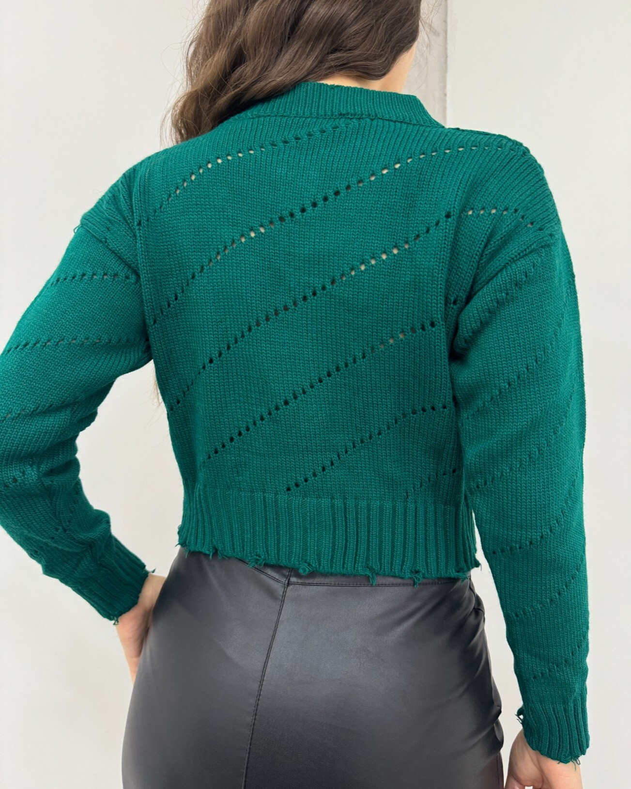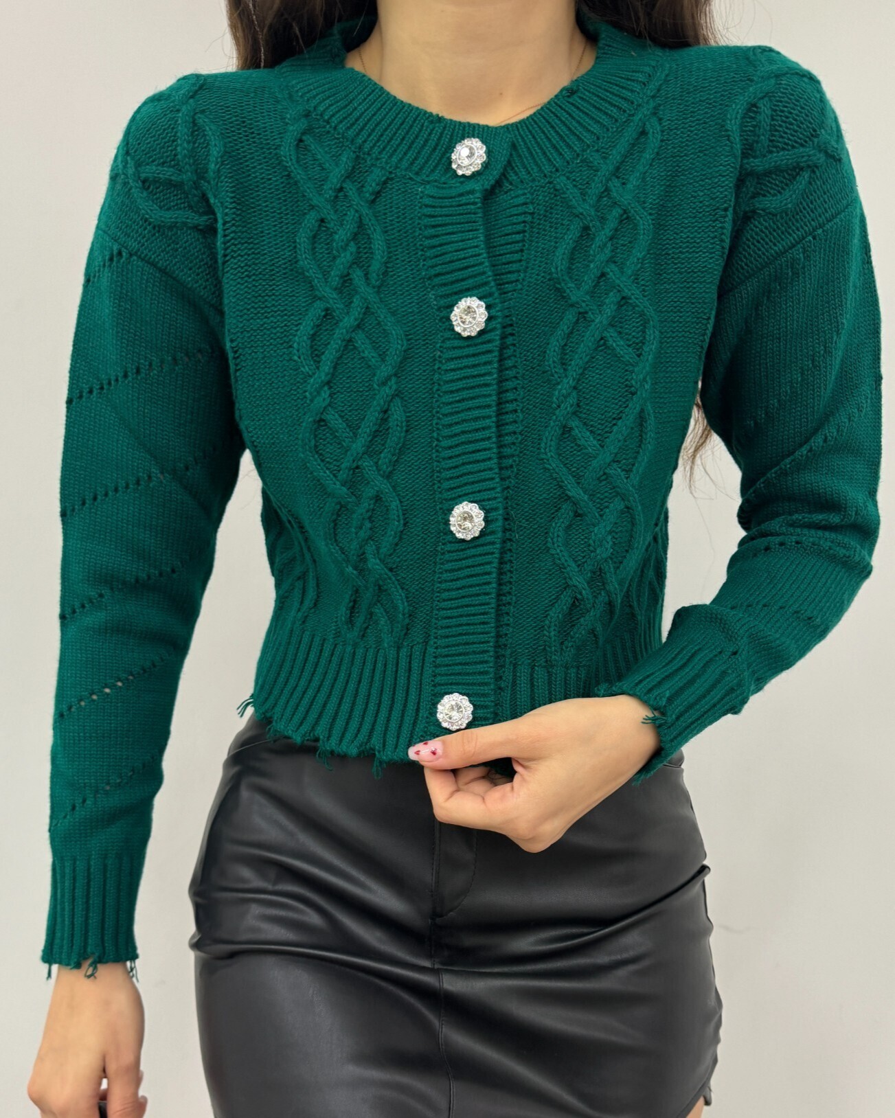 Önden düğmeli, ajurlu, yırtık desenli triko hırka modelimiz yeni sezonun en çok sevilen modelleri arasında yer almaktadır.