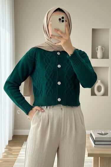 Not: Ürün içeriği hırkadan oluşmaktadır. (Kazak, pantolon, ayakkabı, çanta ve takılar dekor amaçlı kullanılmaktadır.)