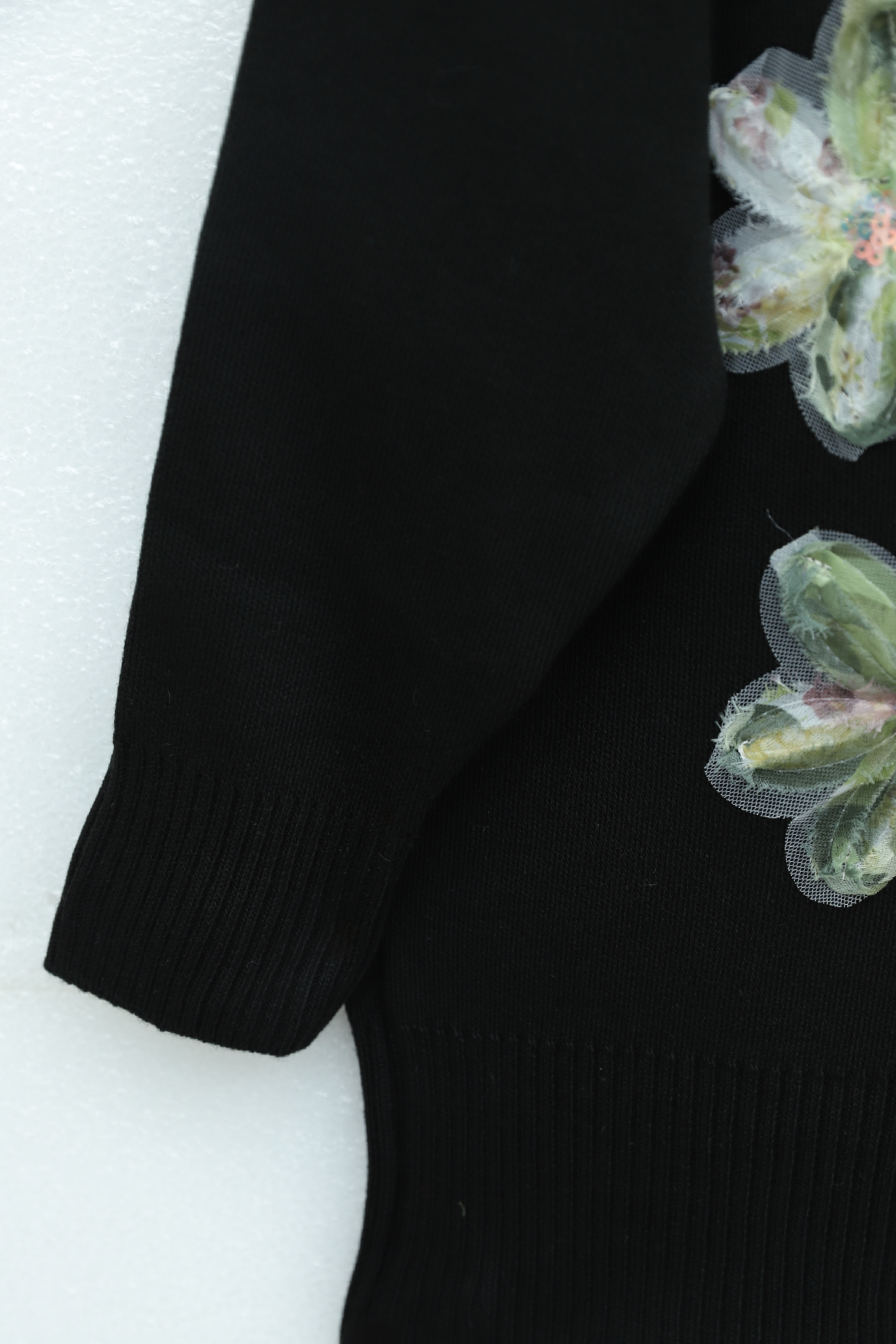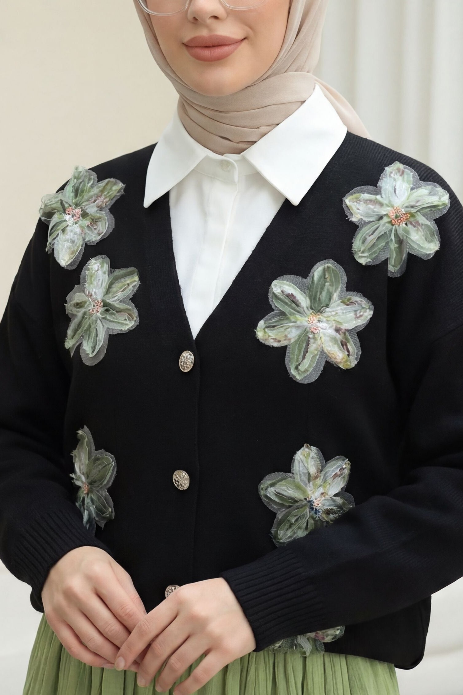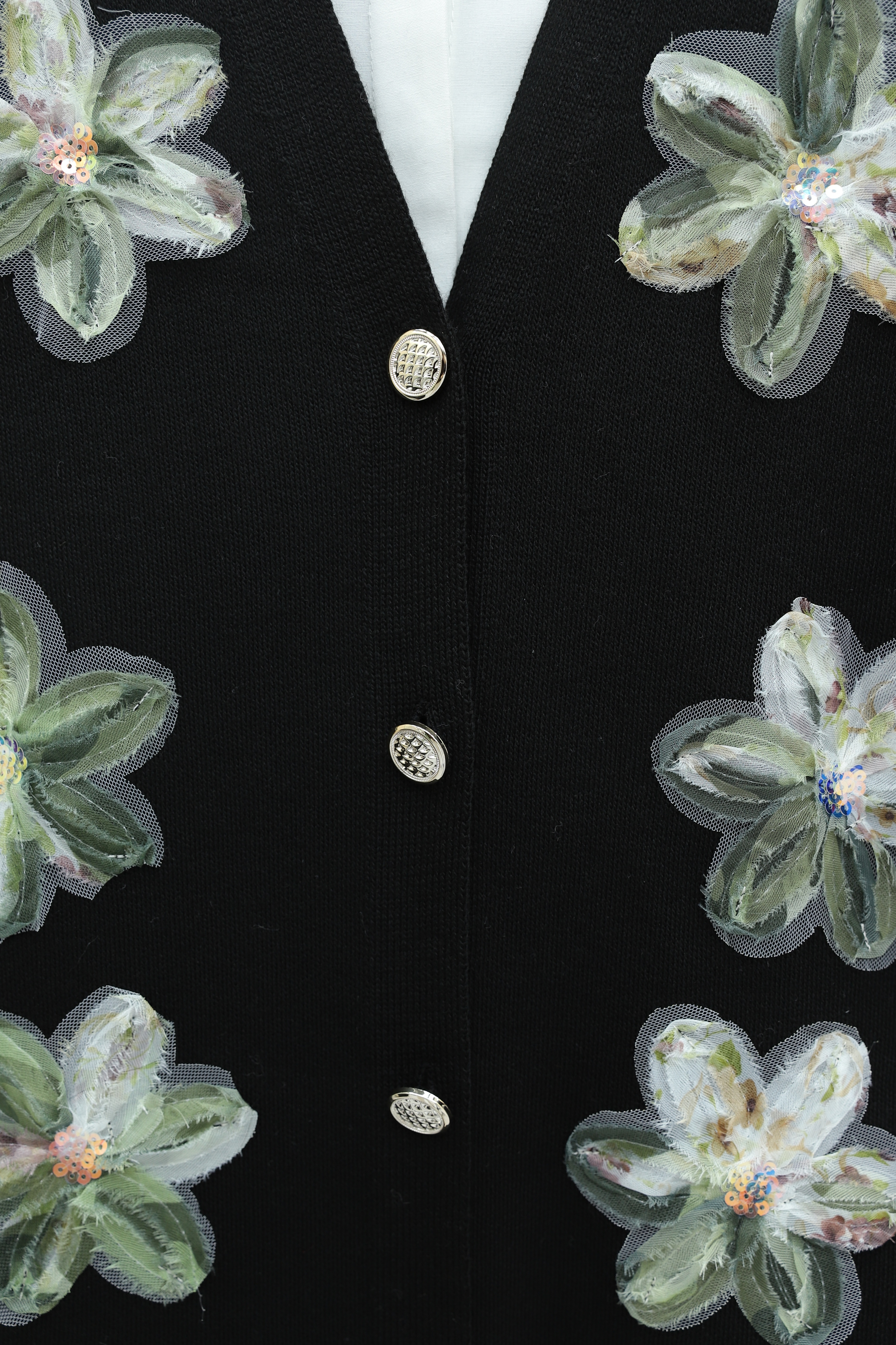 V Yaka Organze Tül Çiçek Nakışlı Triko Hırka -Siyah