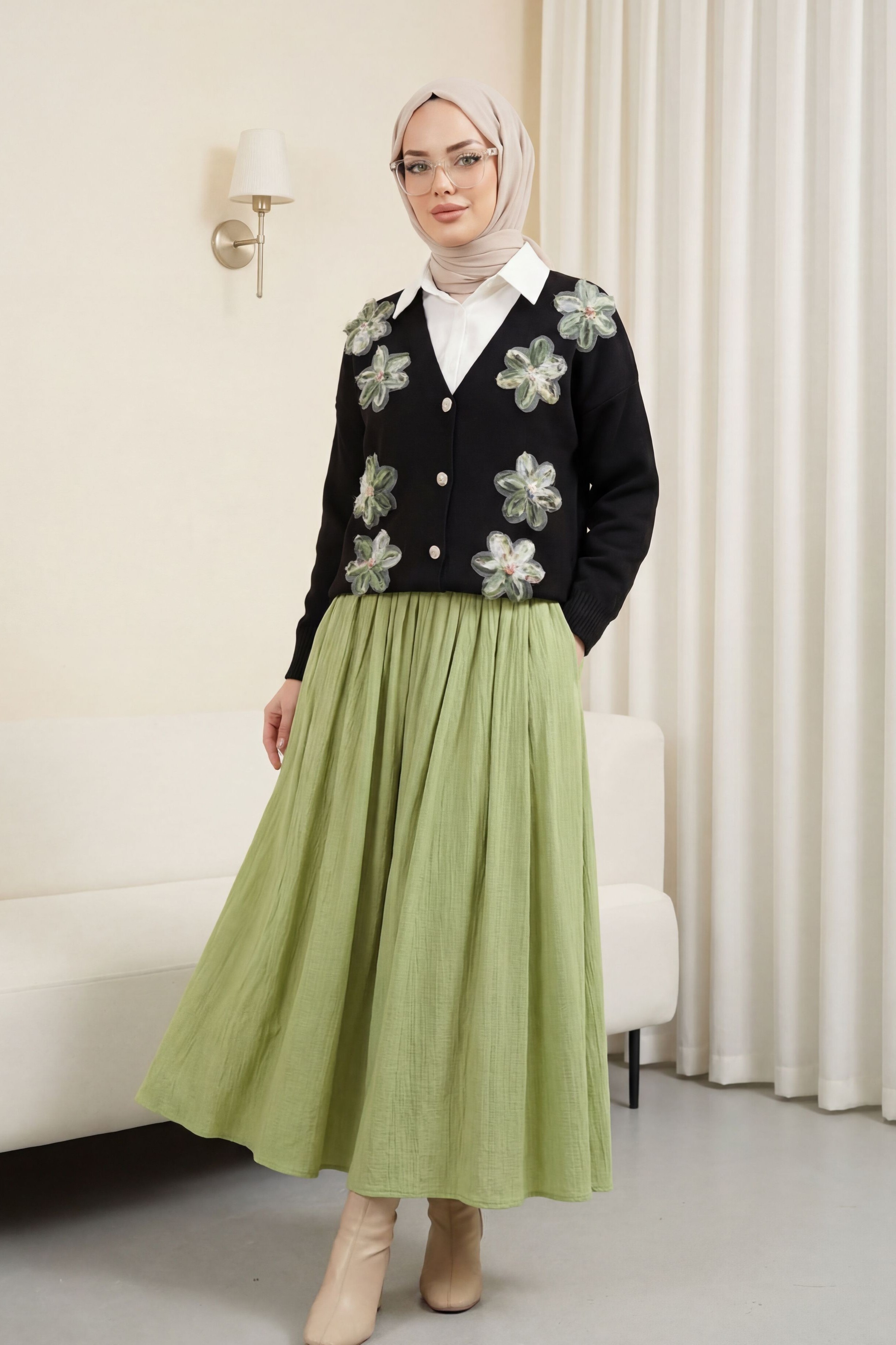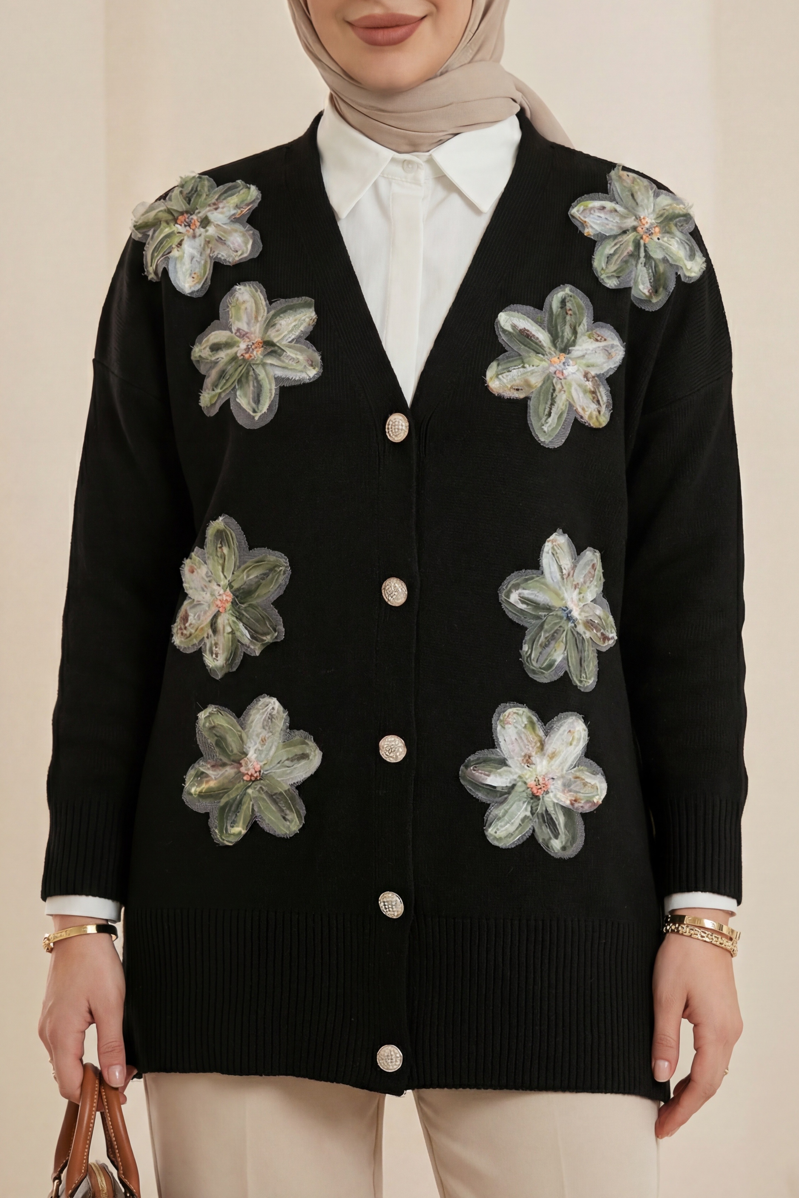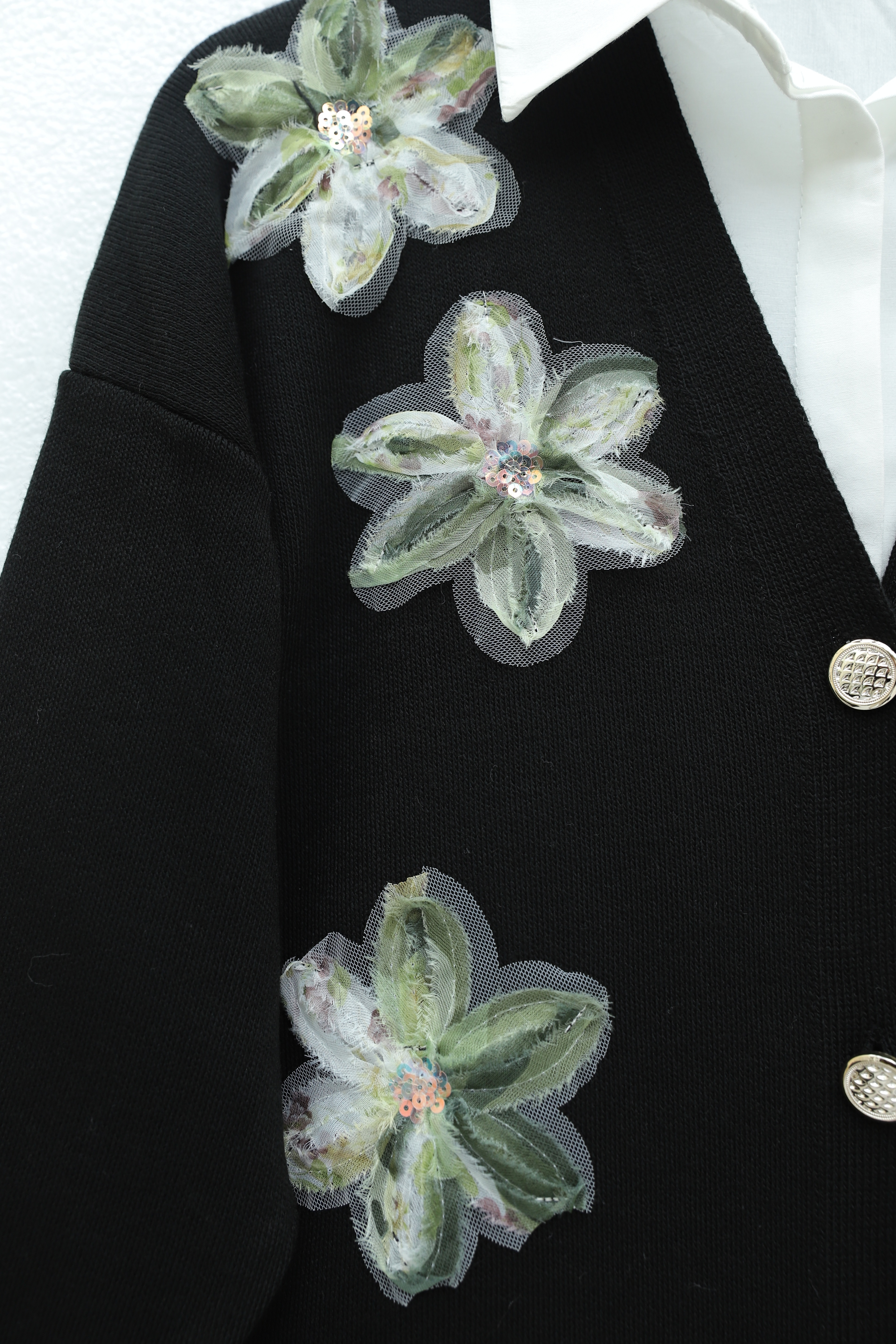 V Yaka Organze Tül Çiçek Nakışlı Triko Hırka -Siyah