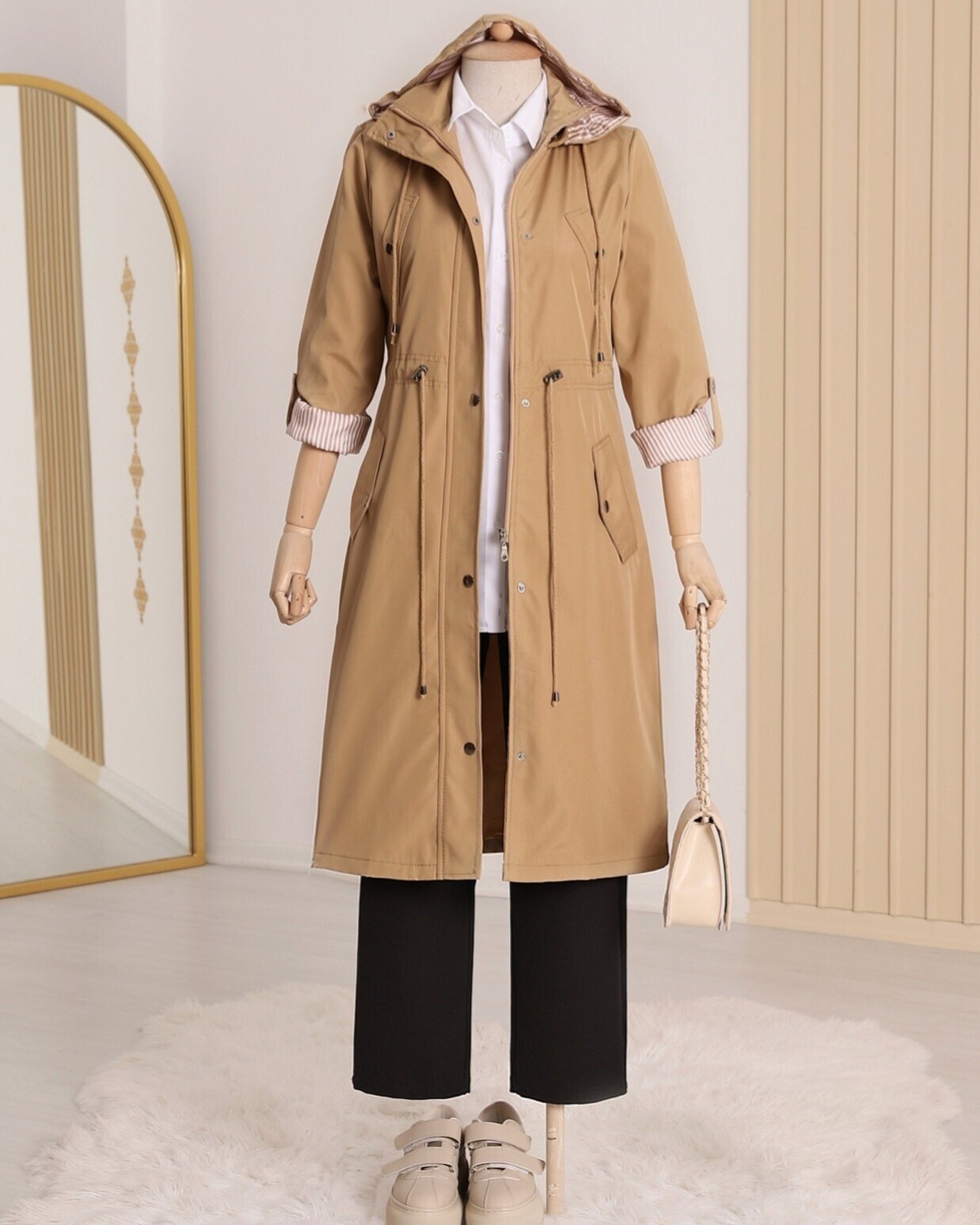 “çizgili astarlı trençkot”, “şık kadın trençkot”, “klasik trençkot modeli”, “mevsimlik trençkot” gibi adlandırılabilir.