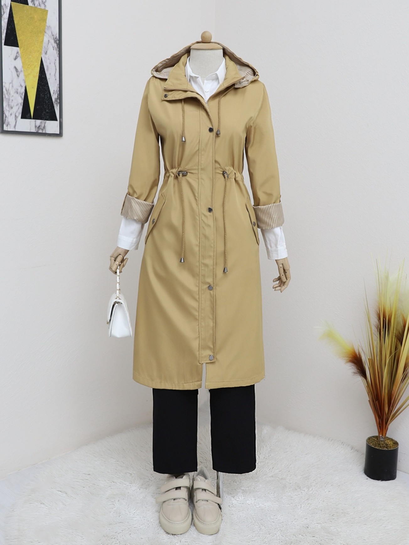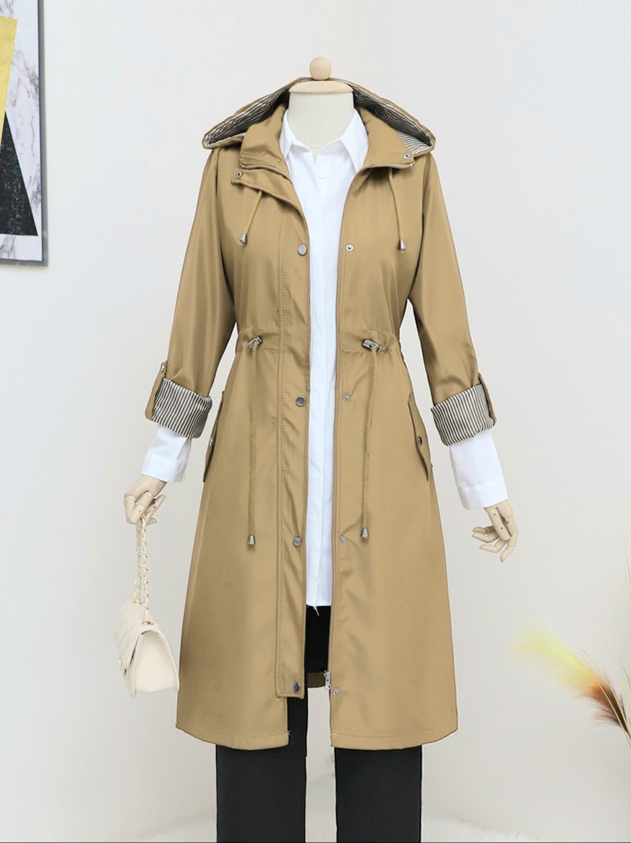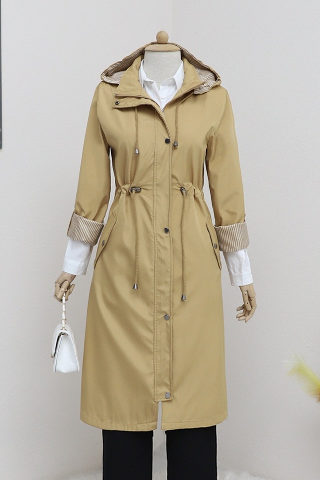 Önden fermuarlı ve çıtçıtlı, 2 cepli, çıkma kapüşonlu, beli büzgülü ve bağcıklı, kolu katlamalı trençkot modelimiz yeni sezonun en çok sevilen modelleri arasında yer almaktadır.