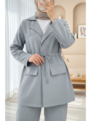 Omzu apoletli çift düğmeli bolerolu cepli kemerli trençkot, güçlü ve şık bir siluet yaratır. Hem pratik hem de zarif bir seçenek.