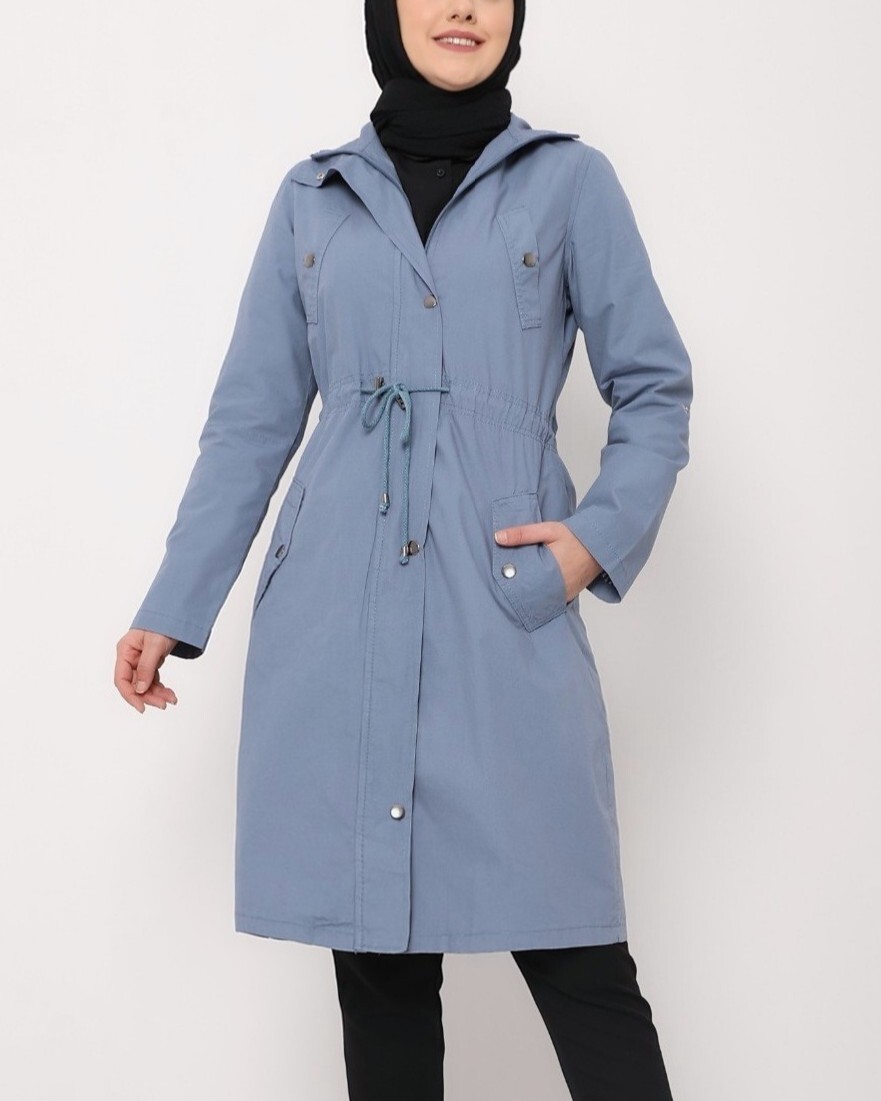 Tünel Bağcıklı Üst Cep Detaylı Astarsız Yıkamalı Organik Koton Trenckot -Mavi