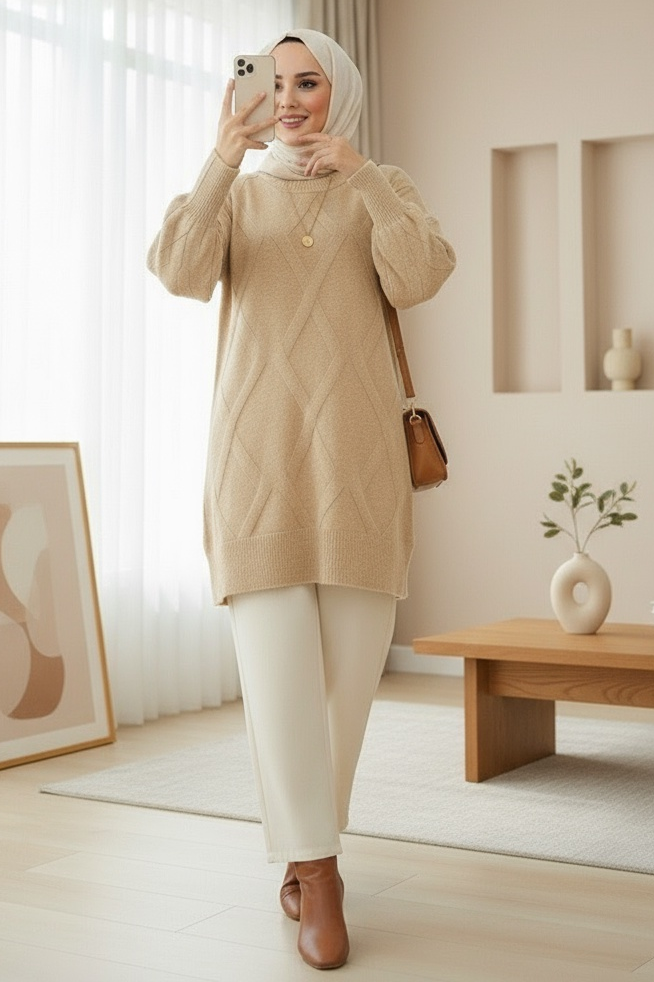 Baklava Desenli Yumoş Triko Tunik, yumuşacık dokusu ve modern baklava desenli tasarımıyla kış sezonunun en trend parçalarından biridir. Sıcacık tutan yumoş triko kumaşı sayesinde konforlu bir kullanım sunarken, baklava desenleri tunik modeline hem zarif hem de dinamik bir görünüm kazandırır. Yuvarlak yaka formu her vücut tipine uyum sağlar ve günlük stilinize doğal bir şıklık katar.
