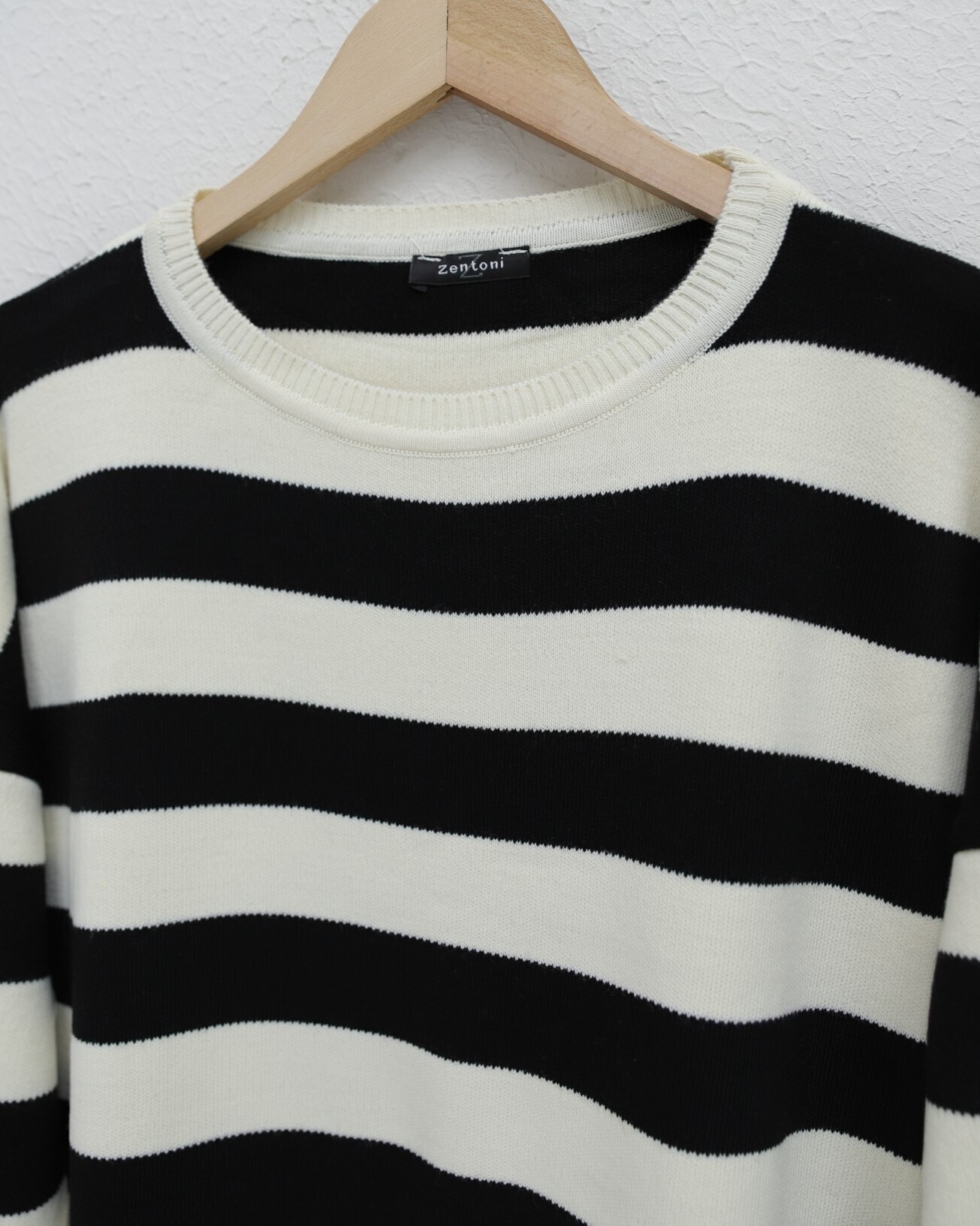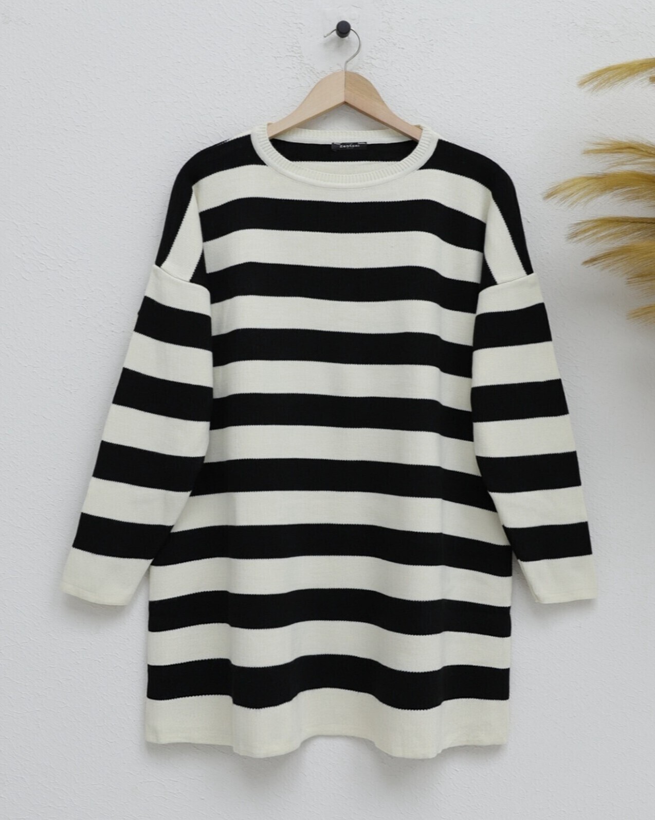 Bisiklet Yaka Yan Çizgili Triko Tunik -Siyah