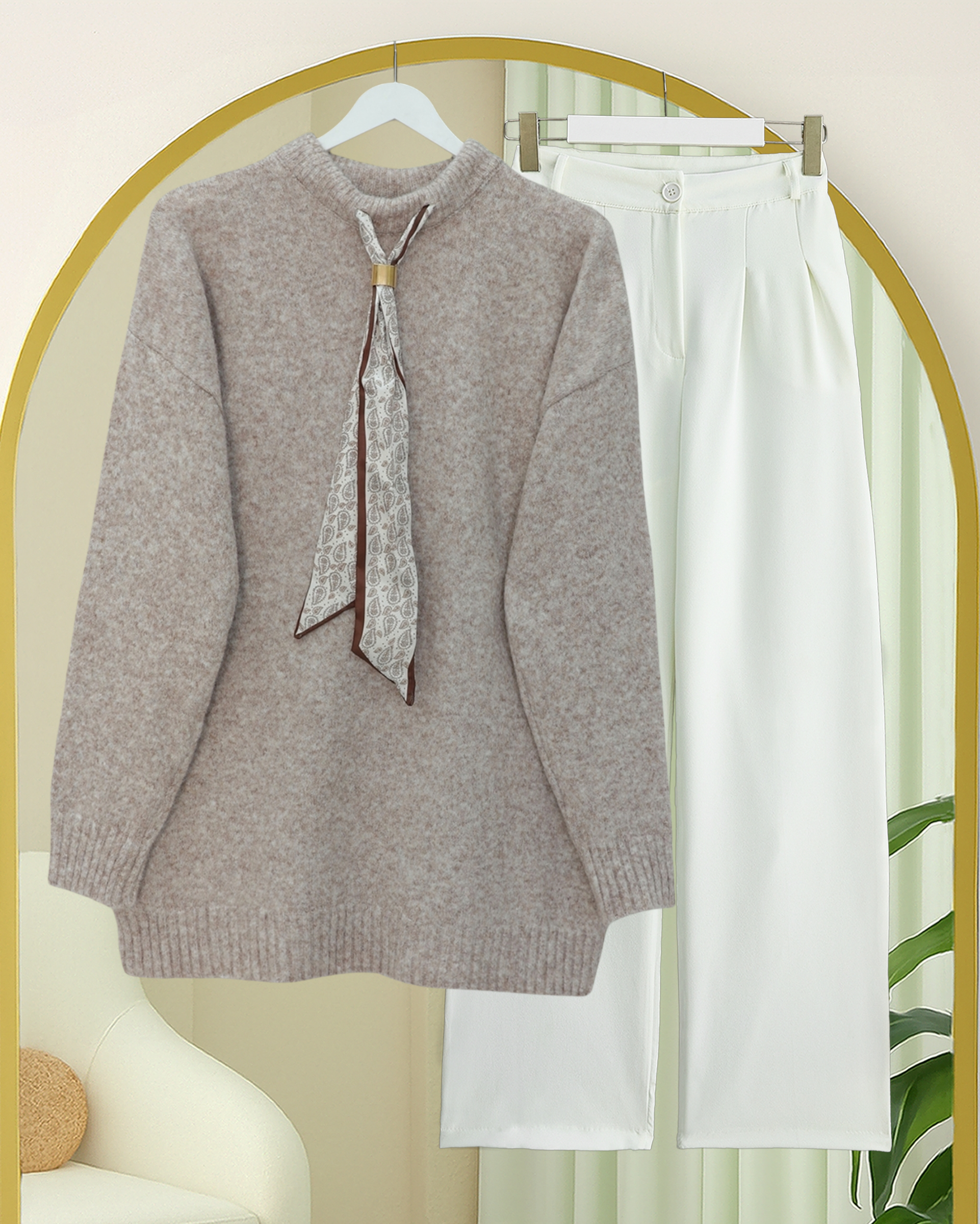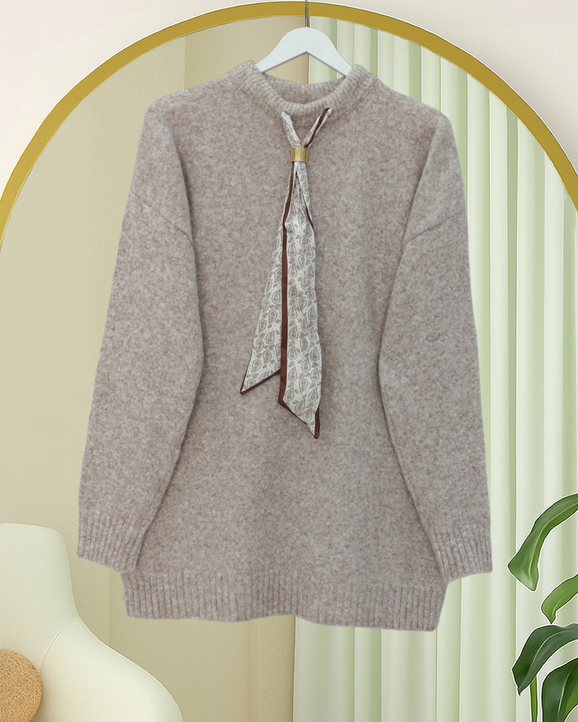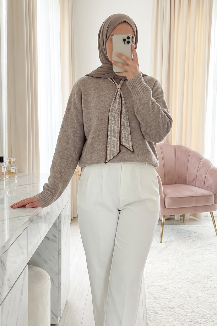 Fularlı Yumoş Triko Kazak -Açık Vizon