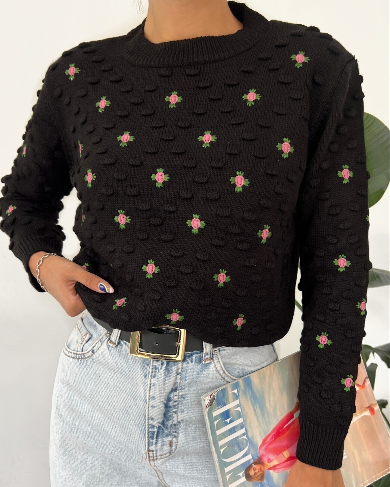 Yeni sezonun en çok sevilen modelleri arasında yer alan bisiklet yaka, çiçek nakışlı, önü ponpon detaylı triko kazak, sonbahar ve kış mevsimi boyunca dış ortamlarda rahatlıkla kullanılabilir.