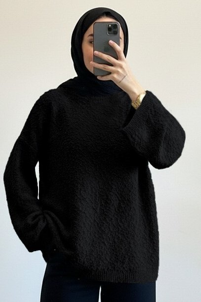 Ponpon Dokulu Salaş Triko Kazak -Siyah