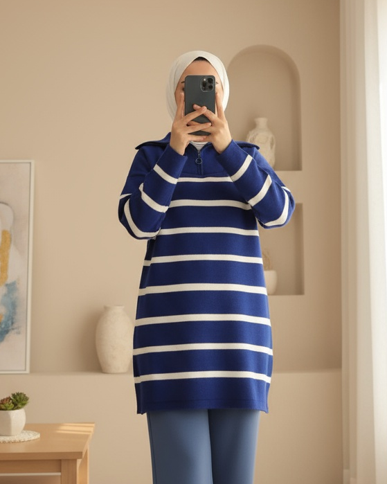 Yakası Fermuarlı, Çizgili Triko Tunik; şıklığı ve rahatlığı bir arada sunan modern bir tasarımdır. Fermuarlı yaka detayı, tunikte pratik bir kullanım sağlar ve şık bir görünüm sunar. Çizgili desen, dinamik bir hava katarken, yumuşak triko kumaşı sıcak tutar ve konforlu bir deneyim sağlar. Hem günlük kullanım hem de rahat şıklık isteyen özel davetlerde tercih edilebilecek mükemmel bir seçenektir.