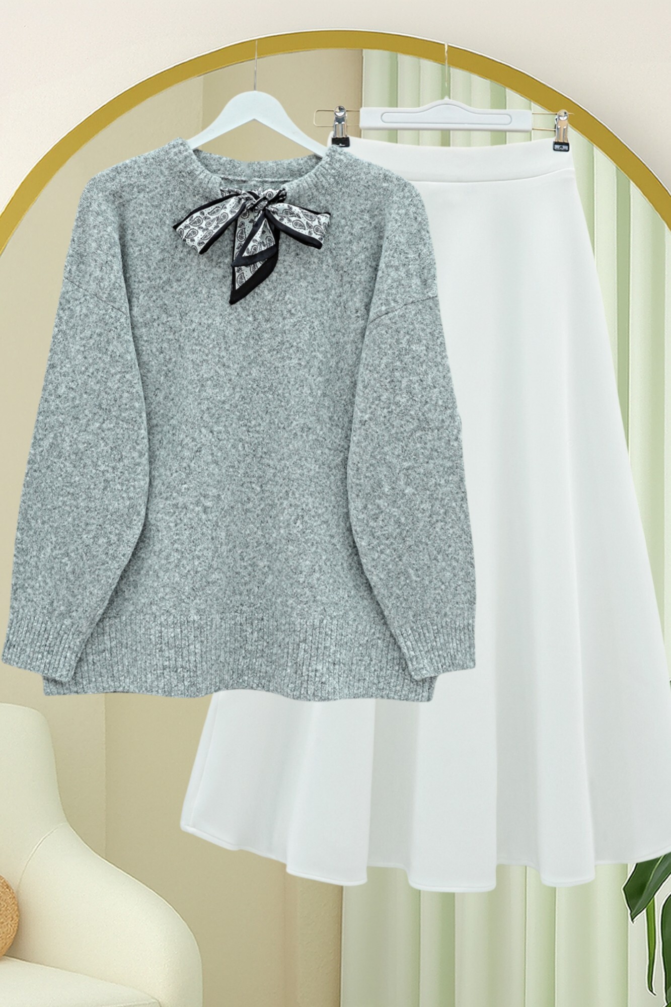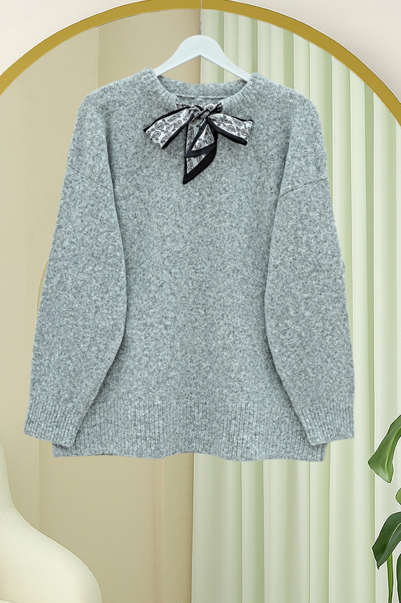Fular detaylı triko kazak, yumoş triko kazak, kışlık triko modelleri gibi adlandırılabilir.