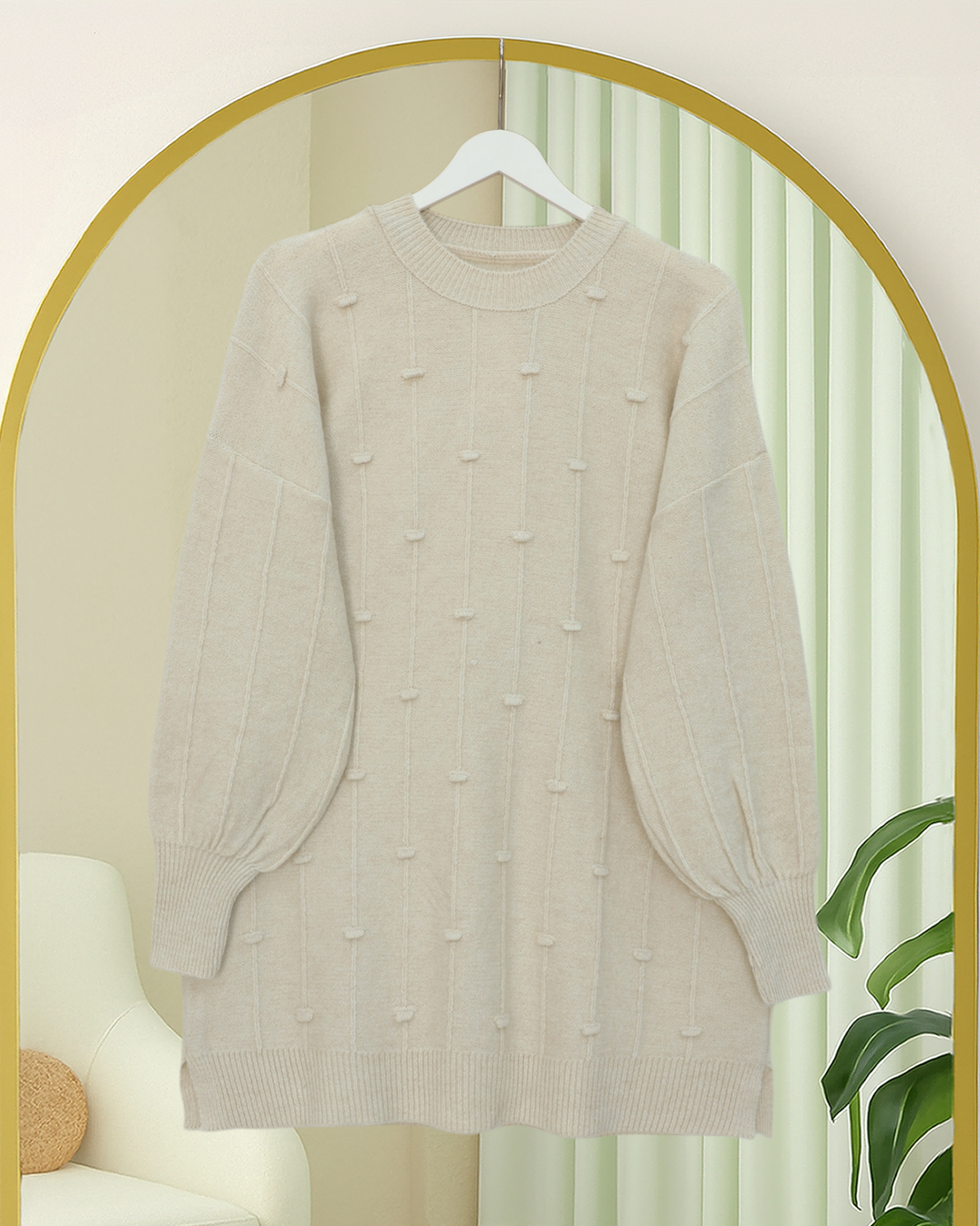 Yanı Yırtmaçlı Ponponlu Yumoş Triko Kazak -Krem