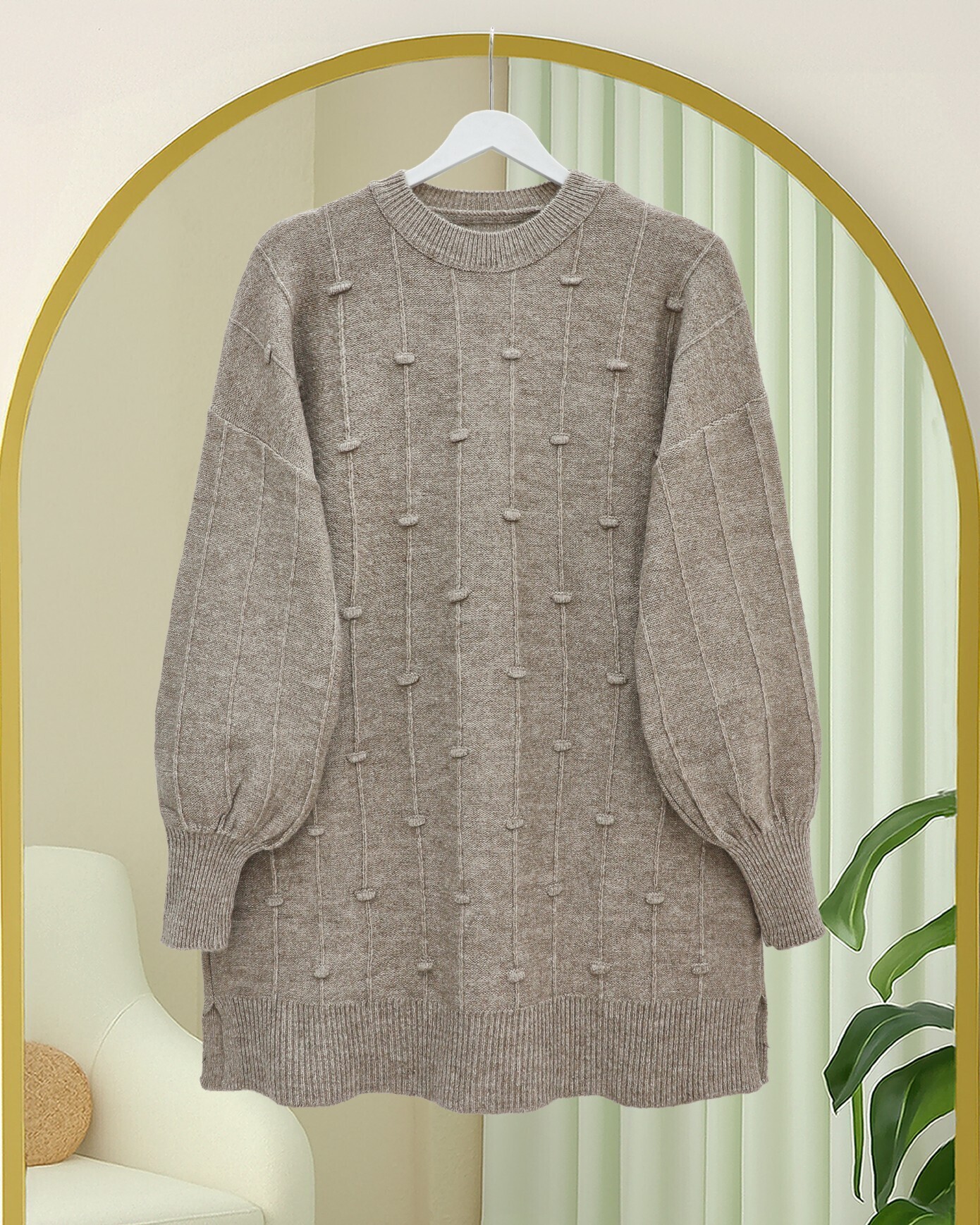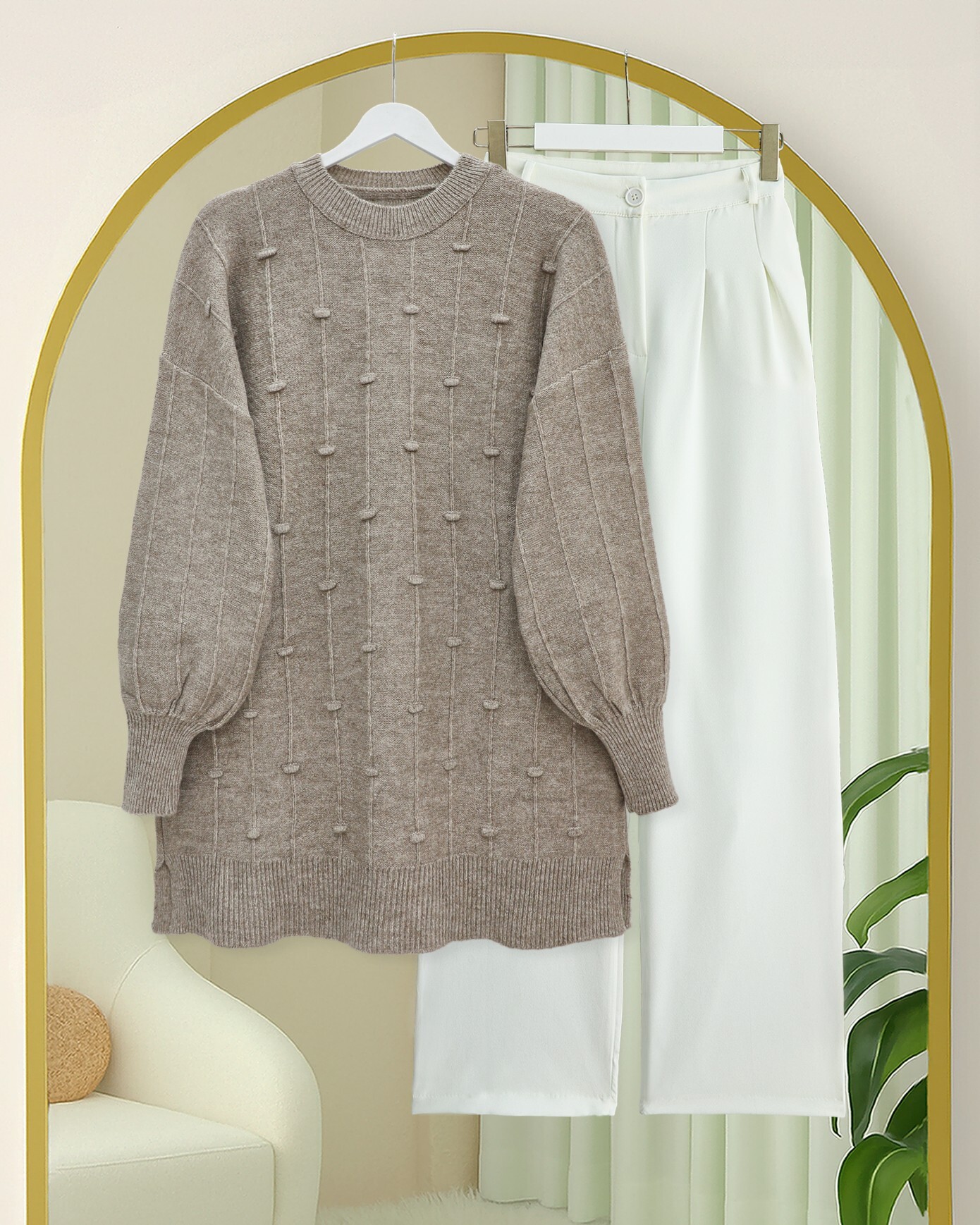 Yanı Yırtmaçlı Ponponlu Yumoş Triko Kazak -Toprak