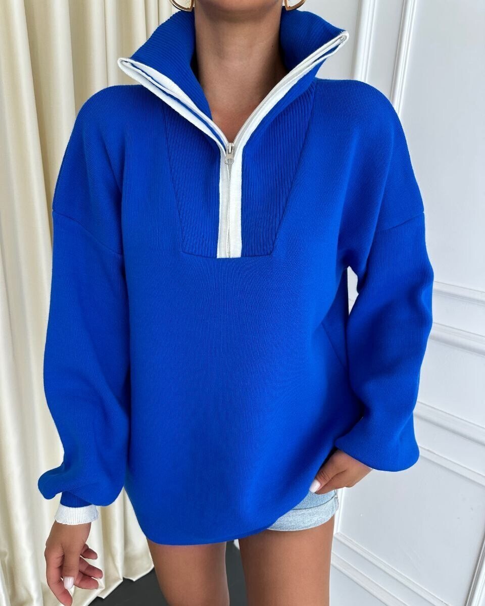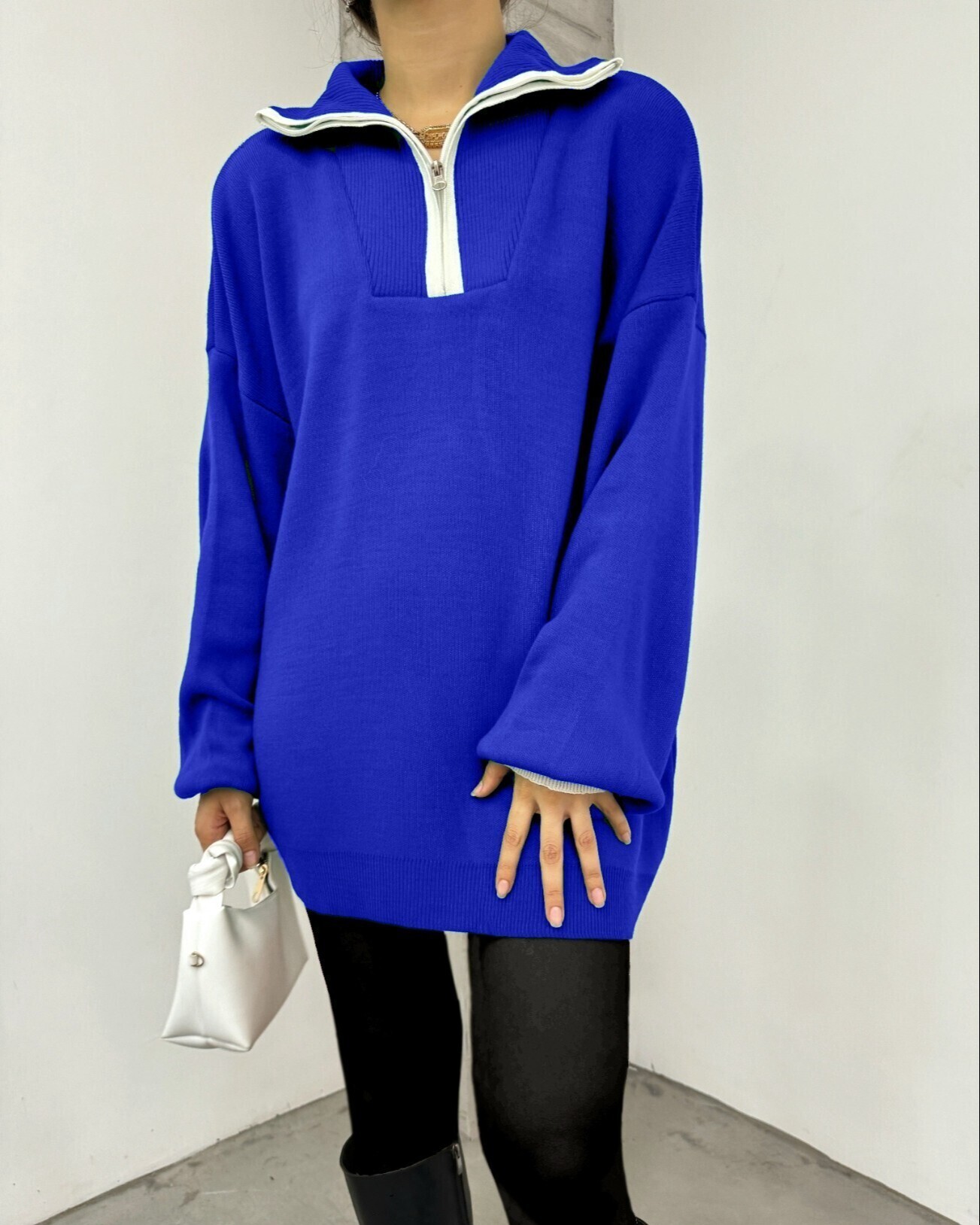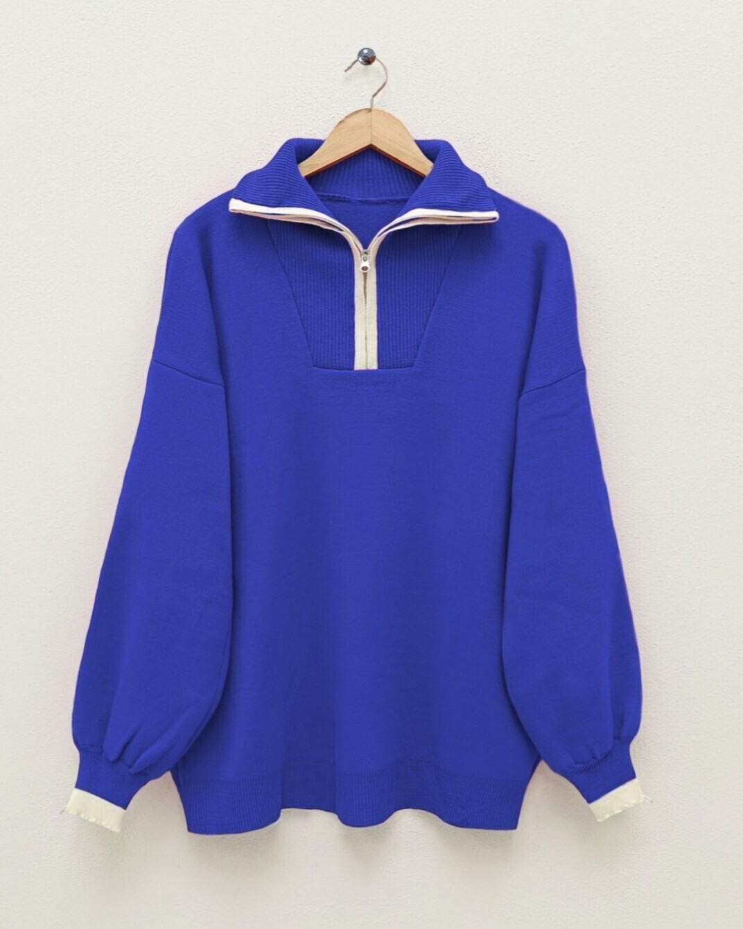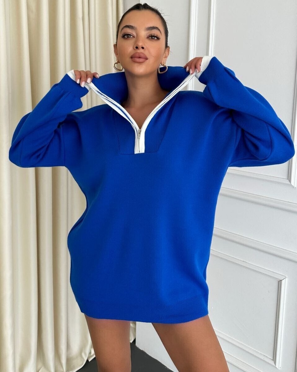 Yarım Fermuarlı Boğazlı Triko Tunik -Saks - 385-2804-R10