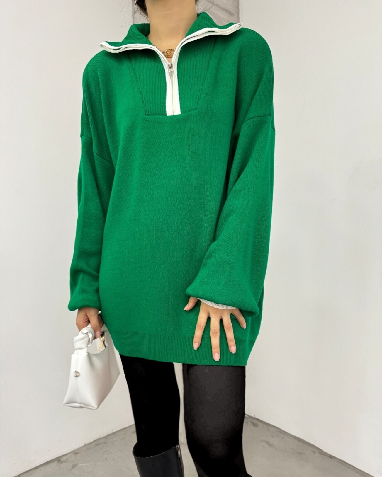 Önden yarım fermuarlı, boğazlı, kol manşeti lastikli triko tunik modelimiz yeni sezonun en çok sevilen modelleri arasında yer almaktadır.