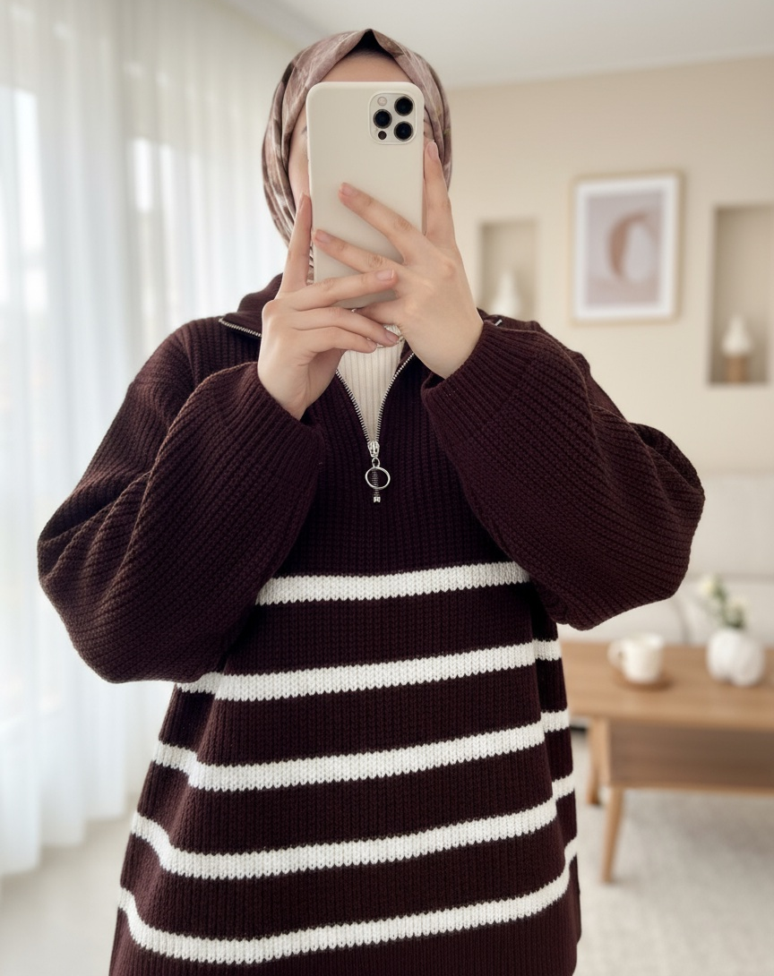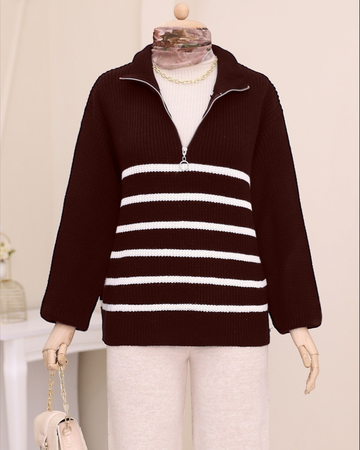 Yakası fermuarlı, çizgi desenli triko kazak modelimiz yeni sezonun en çok sevilen modelleri arasında yer almaktadır.