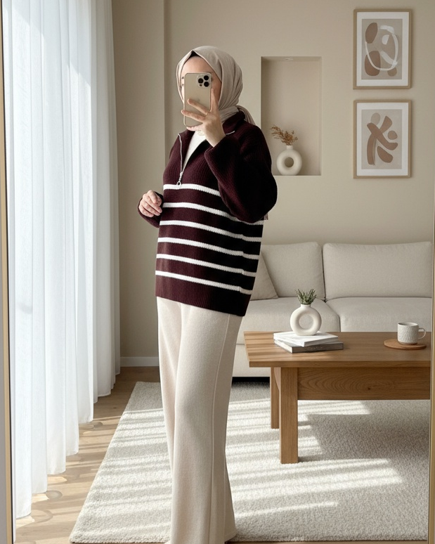 Not: Ürün içeriği kazaktan oluşmaktadır. (Bluz, pantolon, ayakkabı, şal, çanta ve takılar dekor amaçlı kullanılmaktadır.)