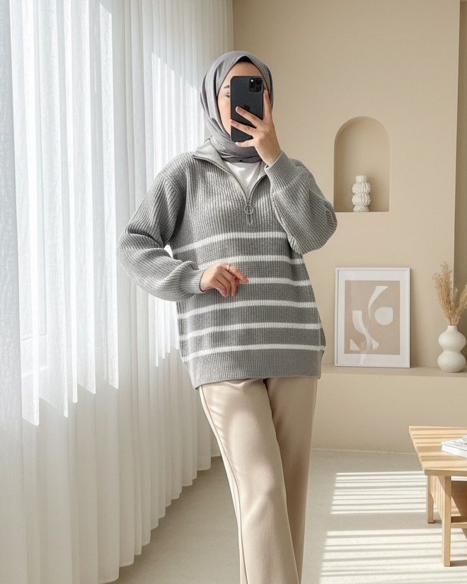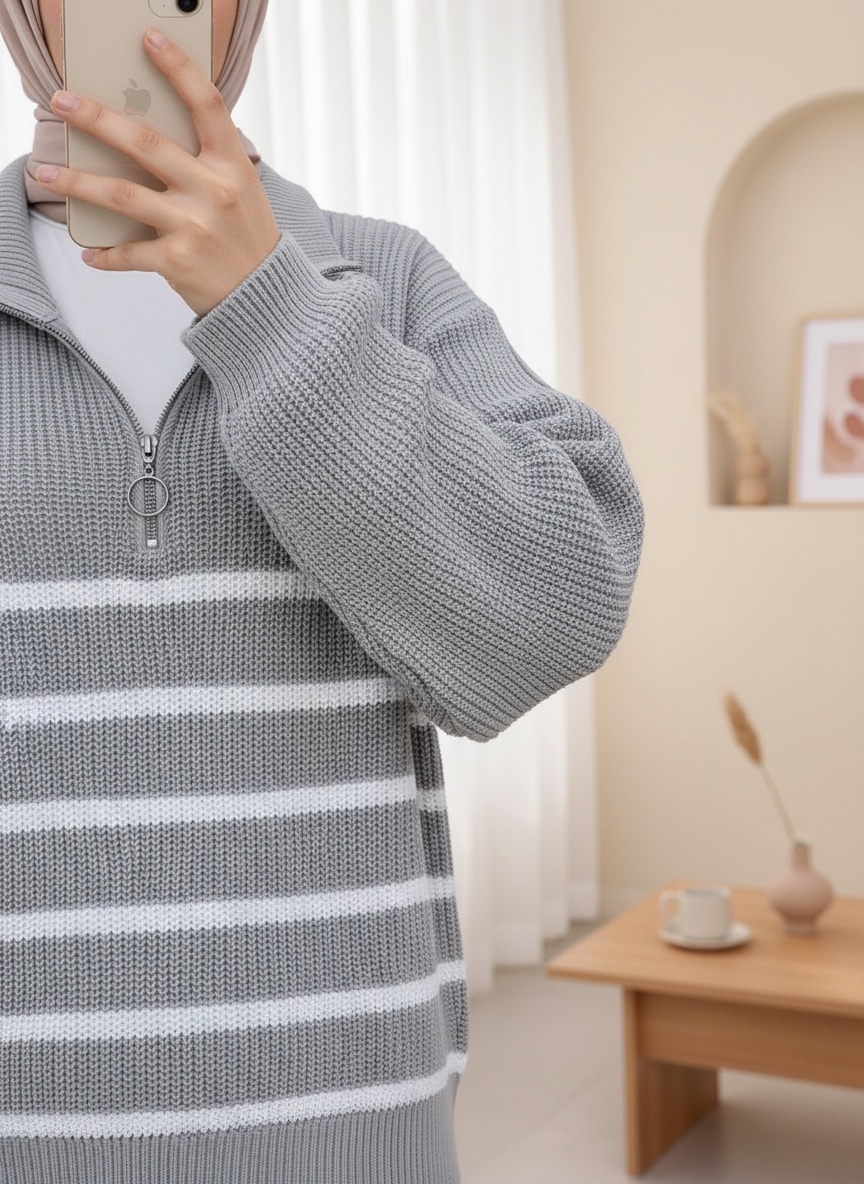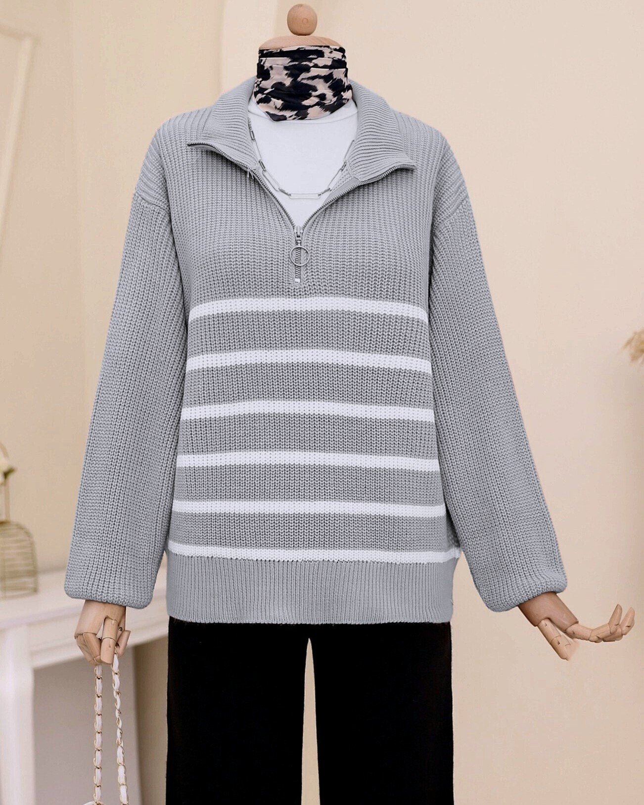 Yakası fermuarlı, çizgi desenli triko kazak modelimiz yeni sezonun en çok sevilen modelleri arasında yer almaktadır.