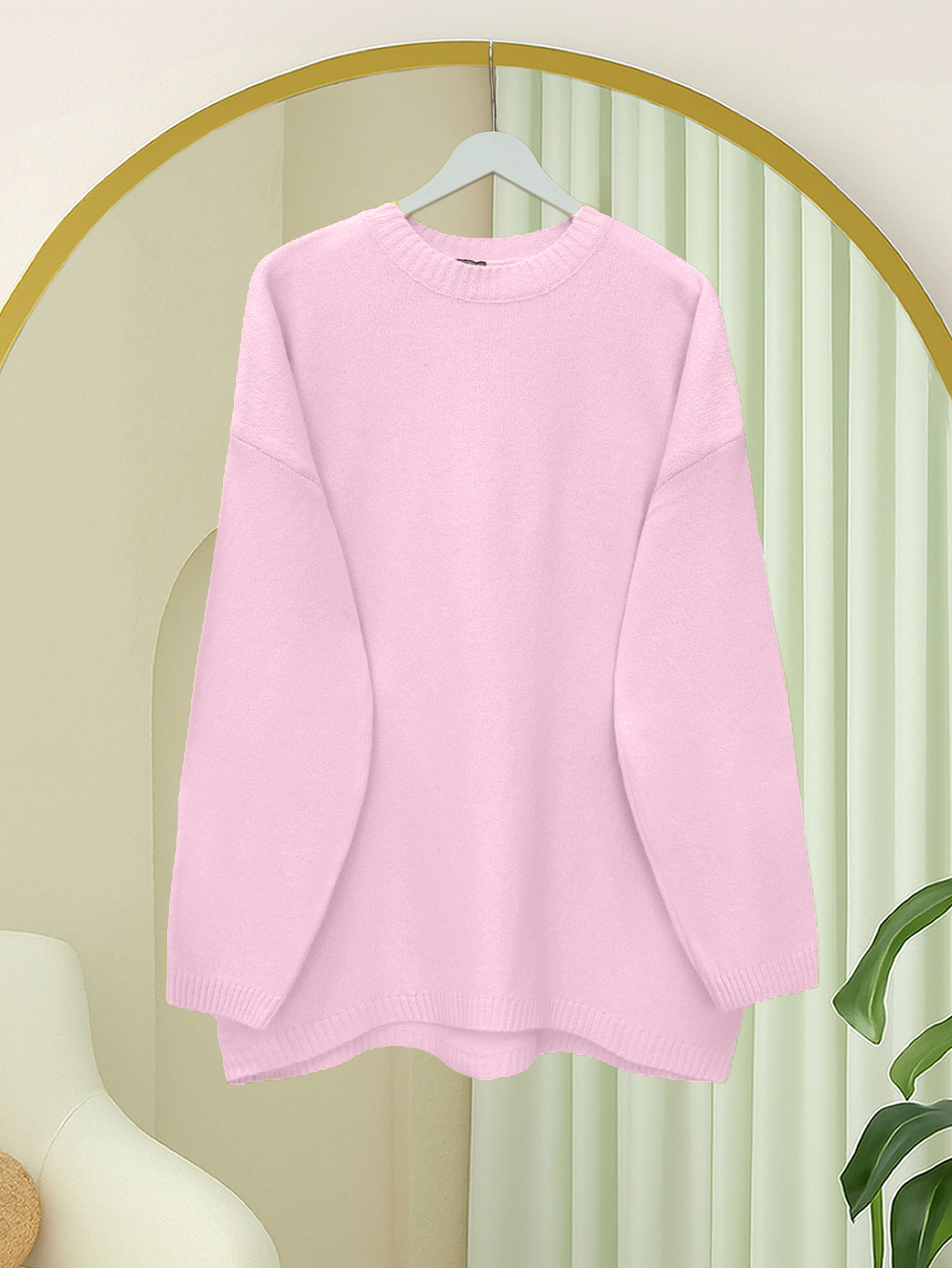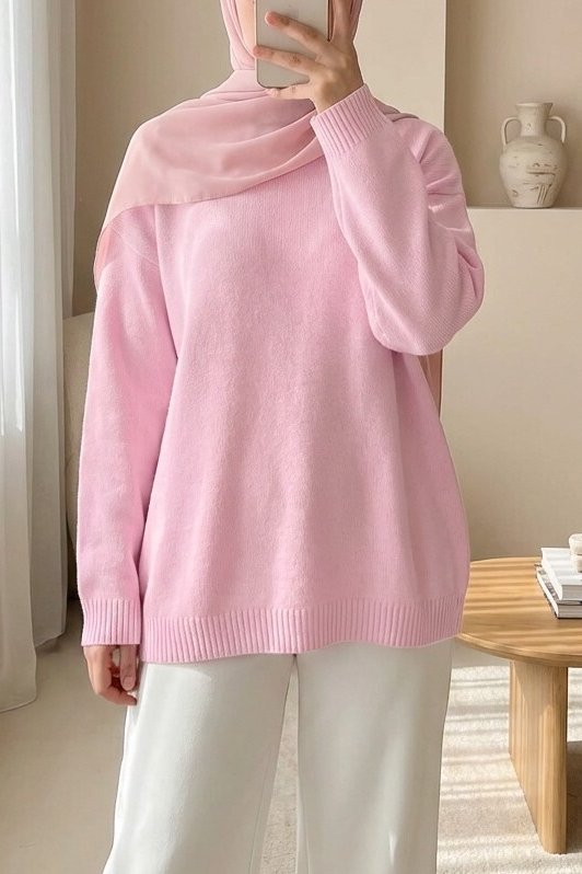 Yuvarlak Yaka Salaş Triko Kazak -Pudra