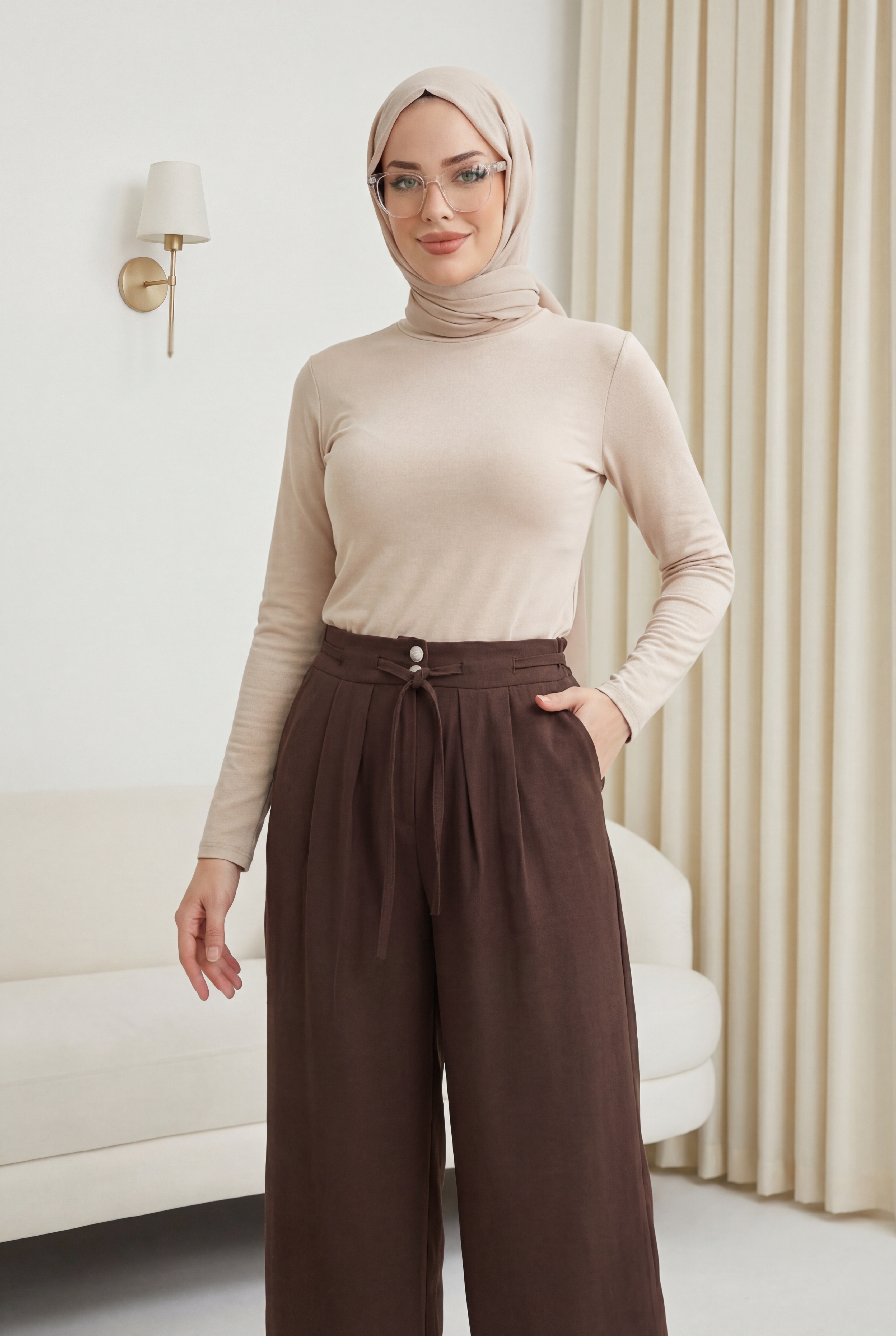 Beli Bağcıklı Çift Düğmeli Yüksek Bel Tensel Pantolon, modern ve konforlu bir stil sunar. Yüksek bel formu silueti dengelerken, çift düğme detayı şık bir görünüm kazandırır. Beli bağcıklı yapısı ayarlanabilir kullanım sağlar. Tensel kumaşı hafif, yumuşak ve nefes alabilendir.