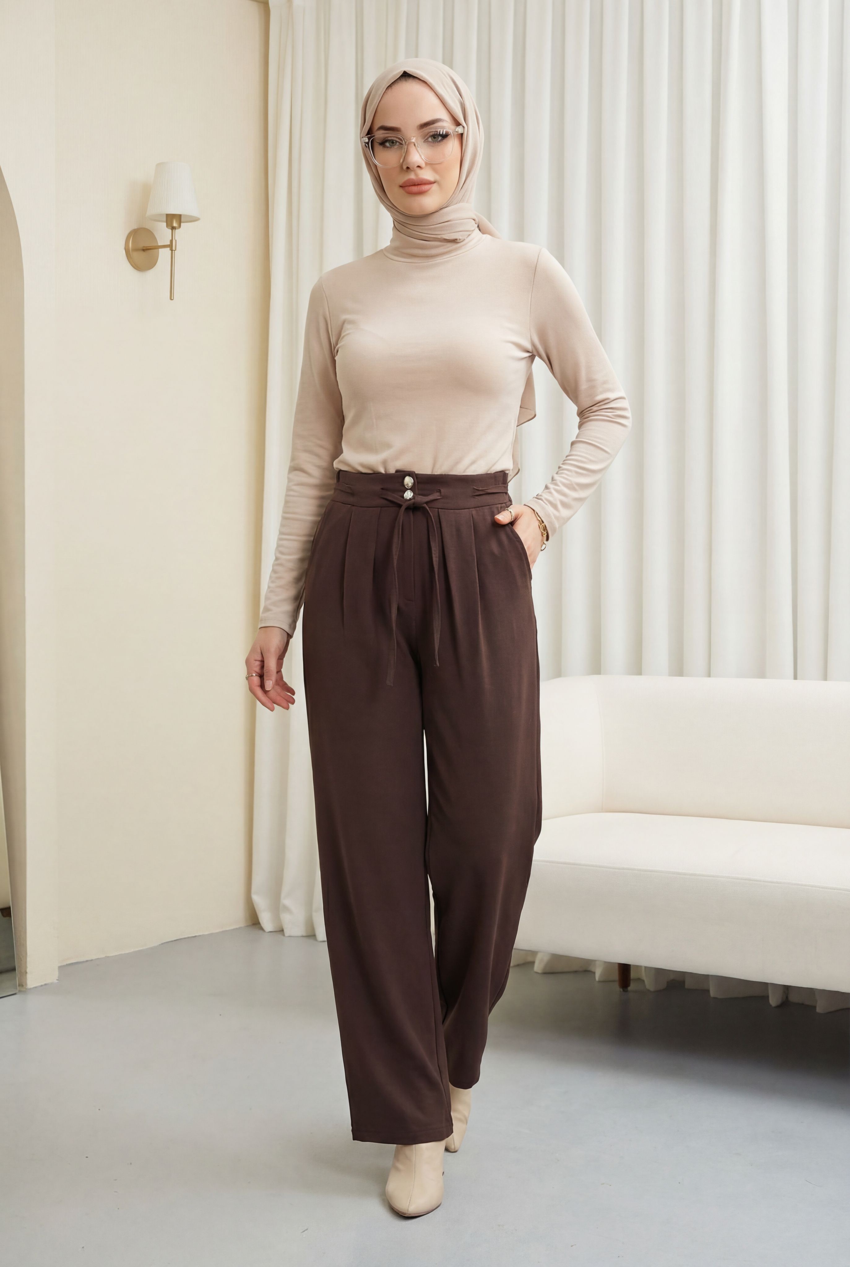 “yüksek bel tensel pantolon”, “bağcıklı kadın pantolon”, “çift düğmeli şık pantolon”, “rahat kesim pantolon modeli” gibi adlandırılabilir.